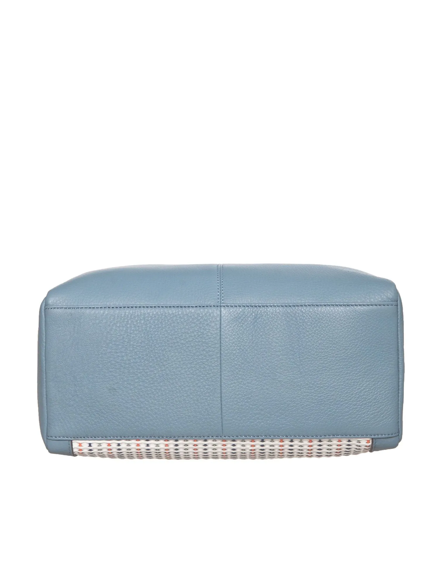 Сумка голубого цвета гармонично сочетается с кожей в виде плетения белого цвета с оранжевыми, зелеными и синими вставками на передней части. Этот дизайн придает сумке особую привлекательность и делает ее идеальной деталью к любому наряду.