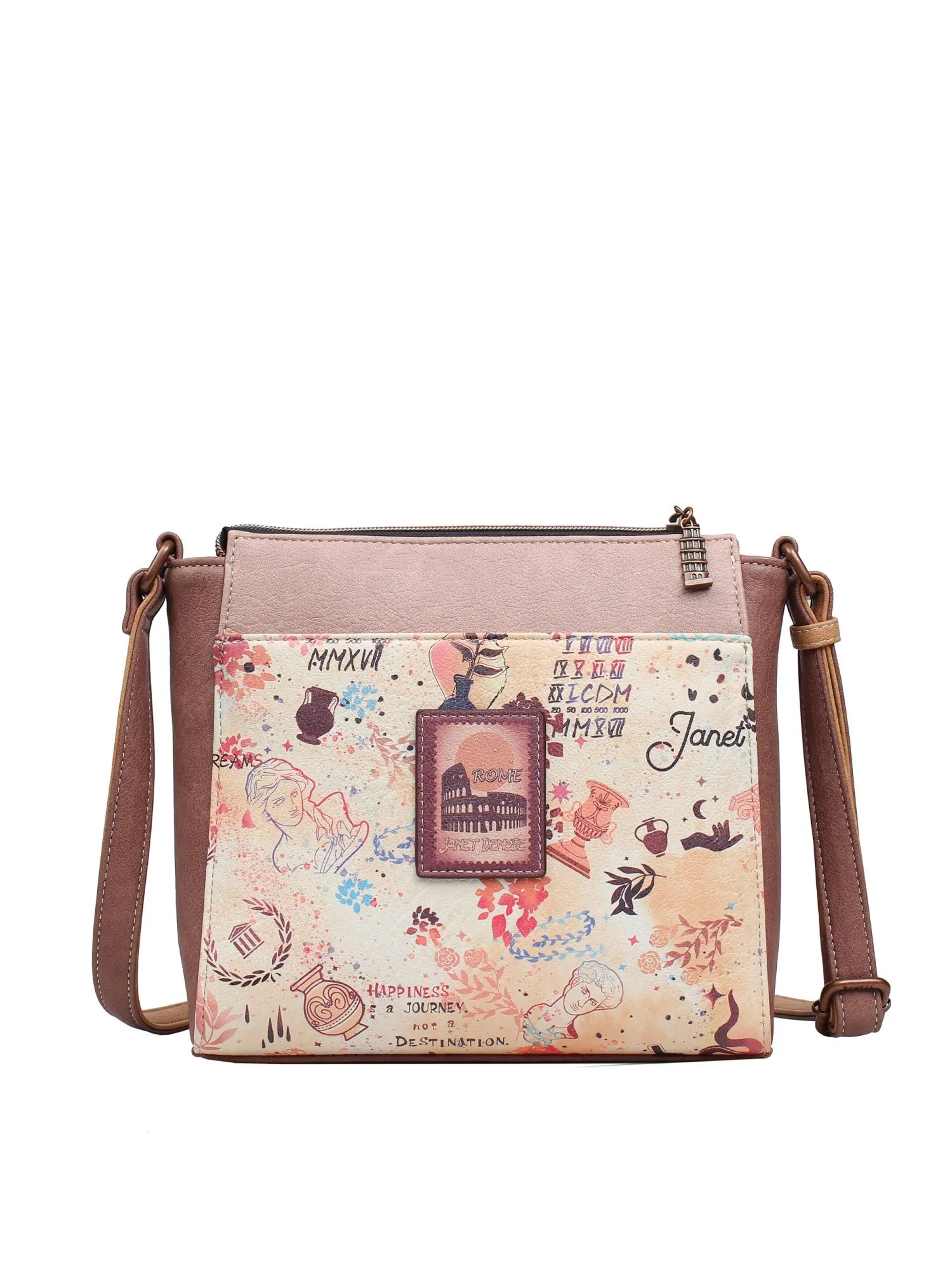 Плечевой ремень регулируется, он идеально подходит для того, чтобы подогнать его под предпочитаемую вами высоту. Финальный штрих - брелок и бегунки в виде Пизанской башни. Эта сумка планшет станет вашим незаменимым спутником на каждый день. Взяв с собой JANET, ваш день будет наполнен романтикой и красотой!