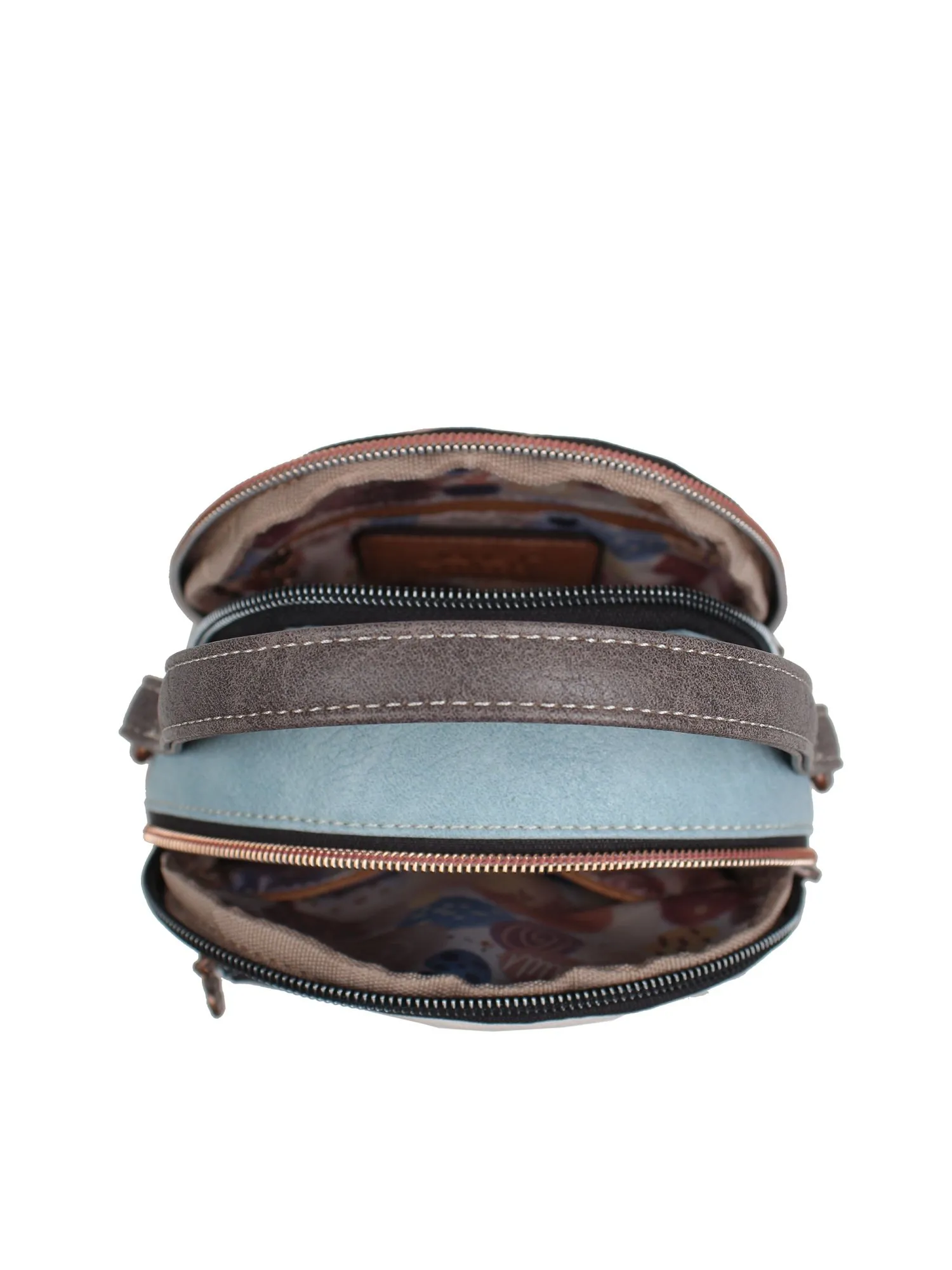 Два основных отделения сумки закрываются на молнию, внутри есть карман на молнии для ценных мелочей и открытый для телефона. На задней стороне сумки расположен маленький открытый карман, а спереди карман на молнии.