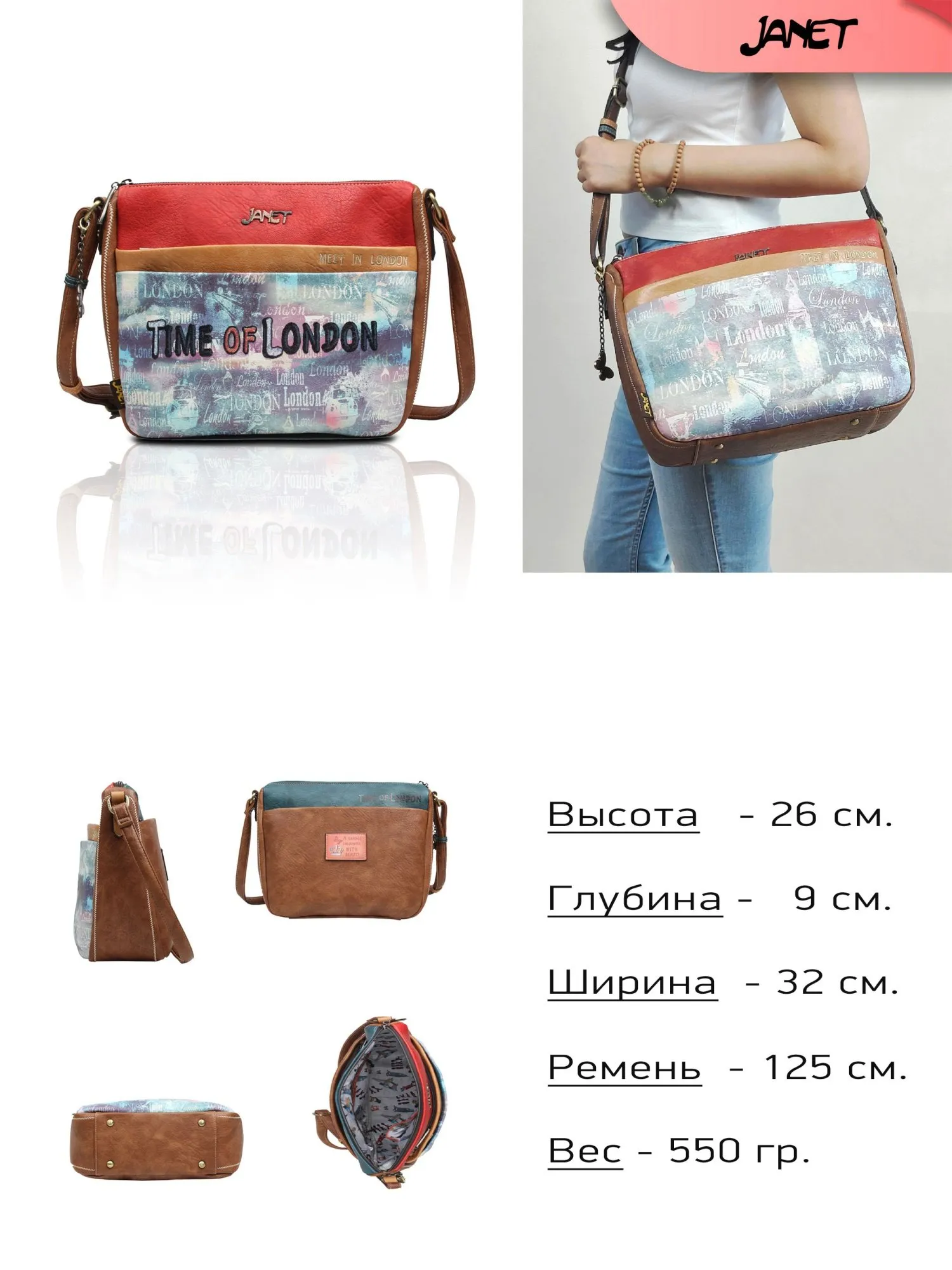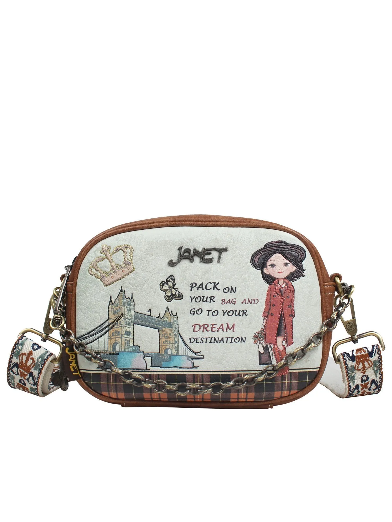 Фирменная подкладка с изображением известных символов Англии и королевы создает атмосферу лондонского шарма и роскоши. А особой деталью декора является симпатичный брелок в виде бабочки. Брелок-бабочка символизирует ваше внутреннее преображение и готовность открыть новые горизонты во время путешествий с JANET.