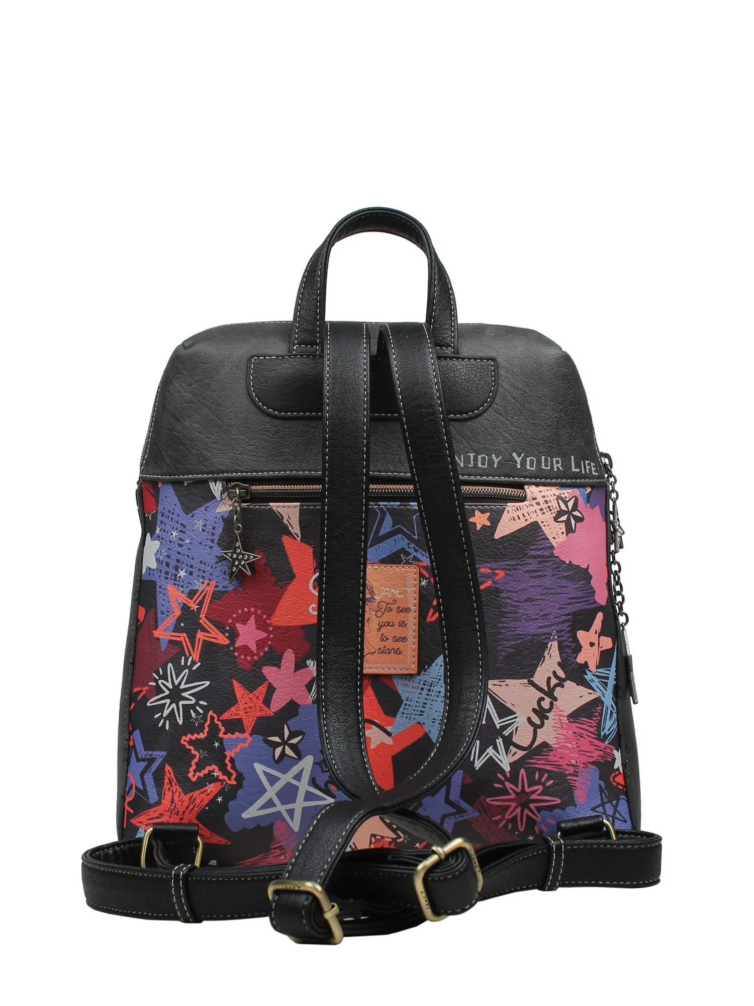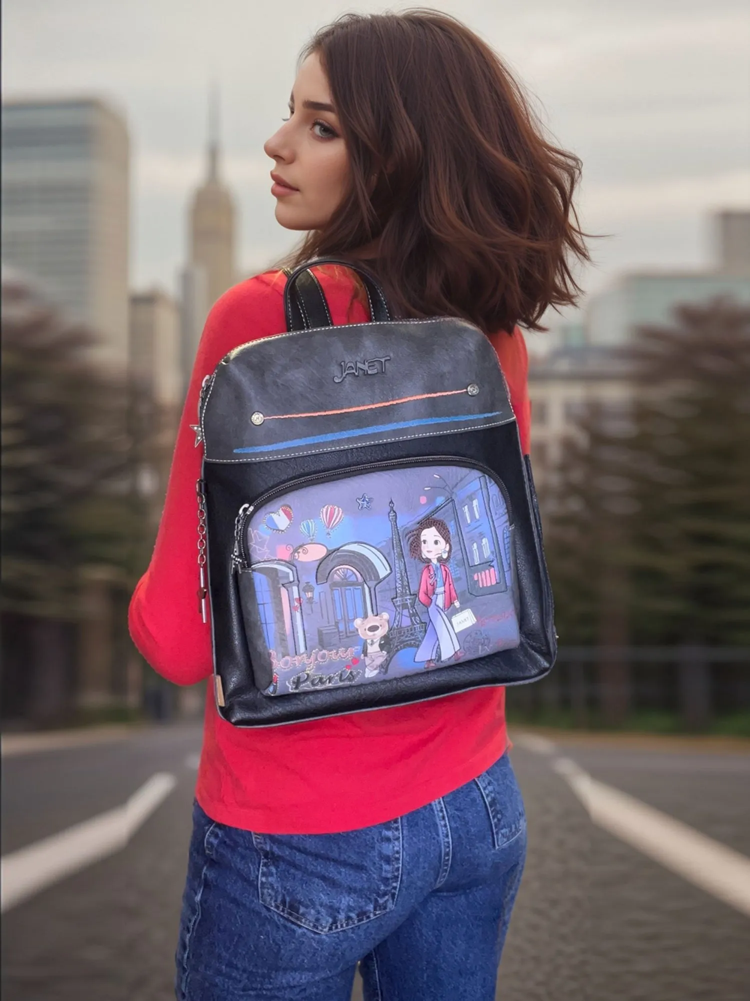 Финальный штрих - брелок в виде звезды со стразами на фоне темнеющего сине-фиолетового неба мерцает и искрится, погружая нас в самую настоящую романтическую сказку! Взяв с собой рюкзак из коллекции JANET PARIS DREAM, с вами в абсолютно любом месте будет витать дух настоящего Парижа.