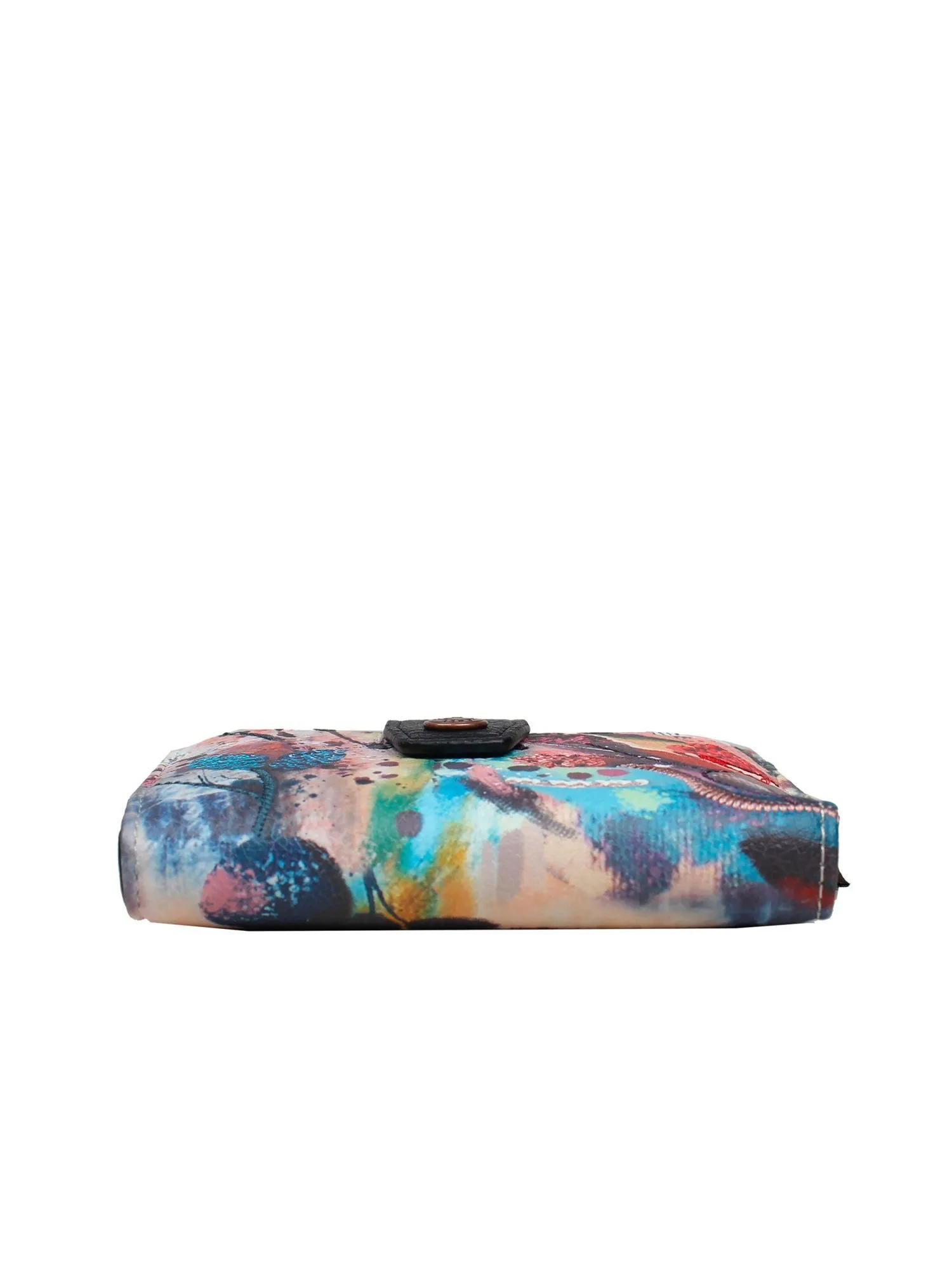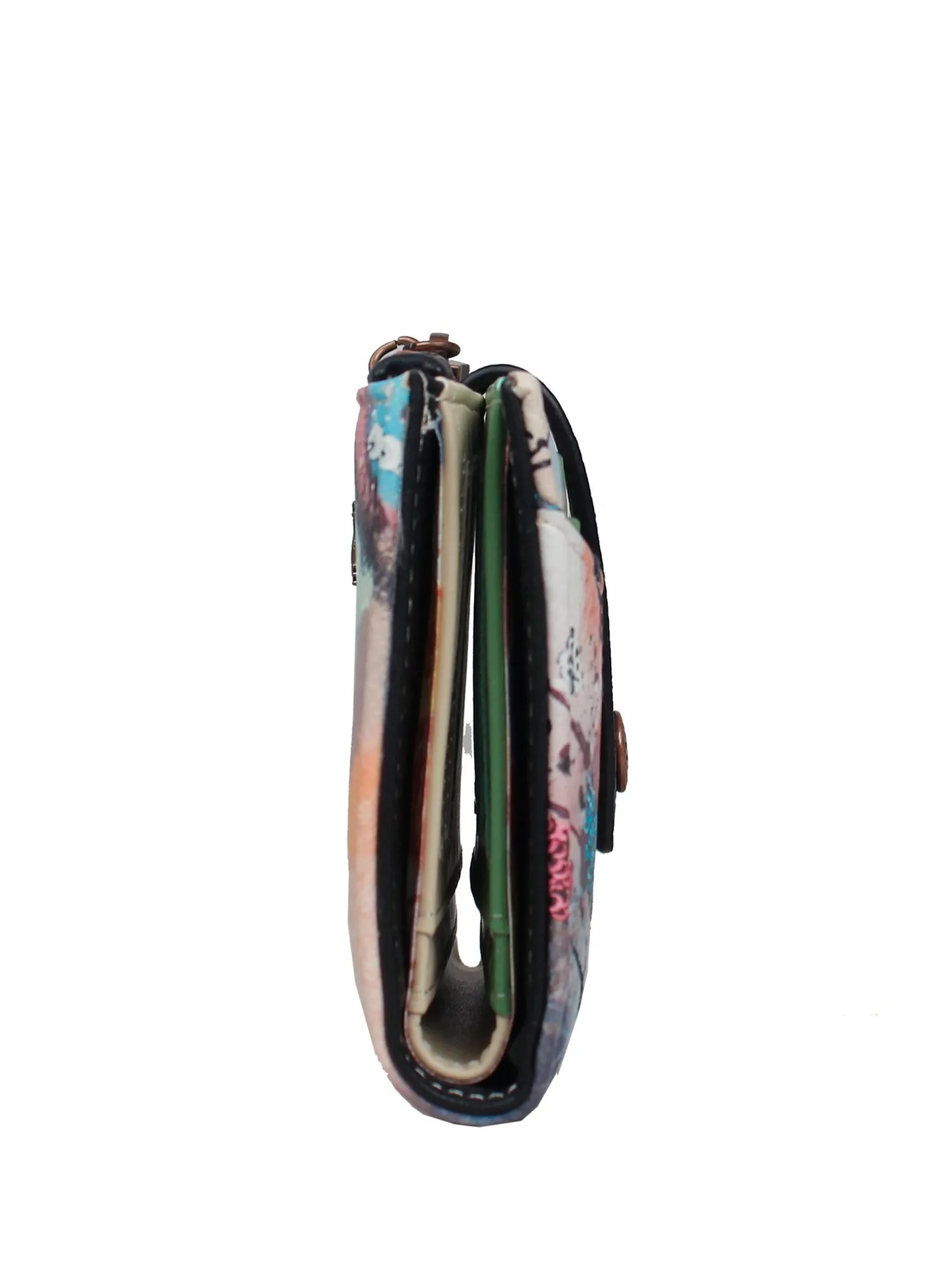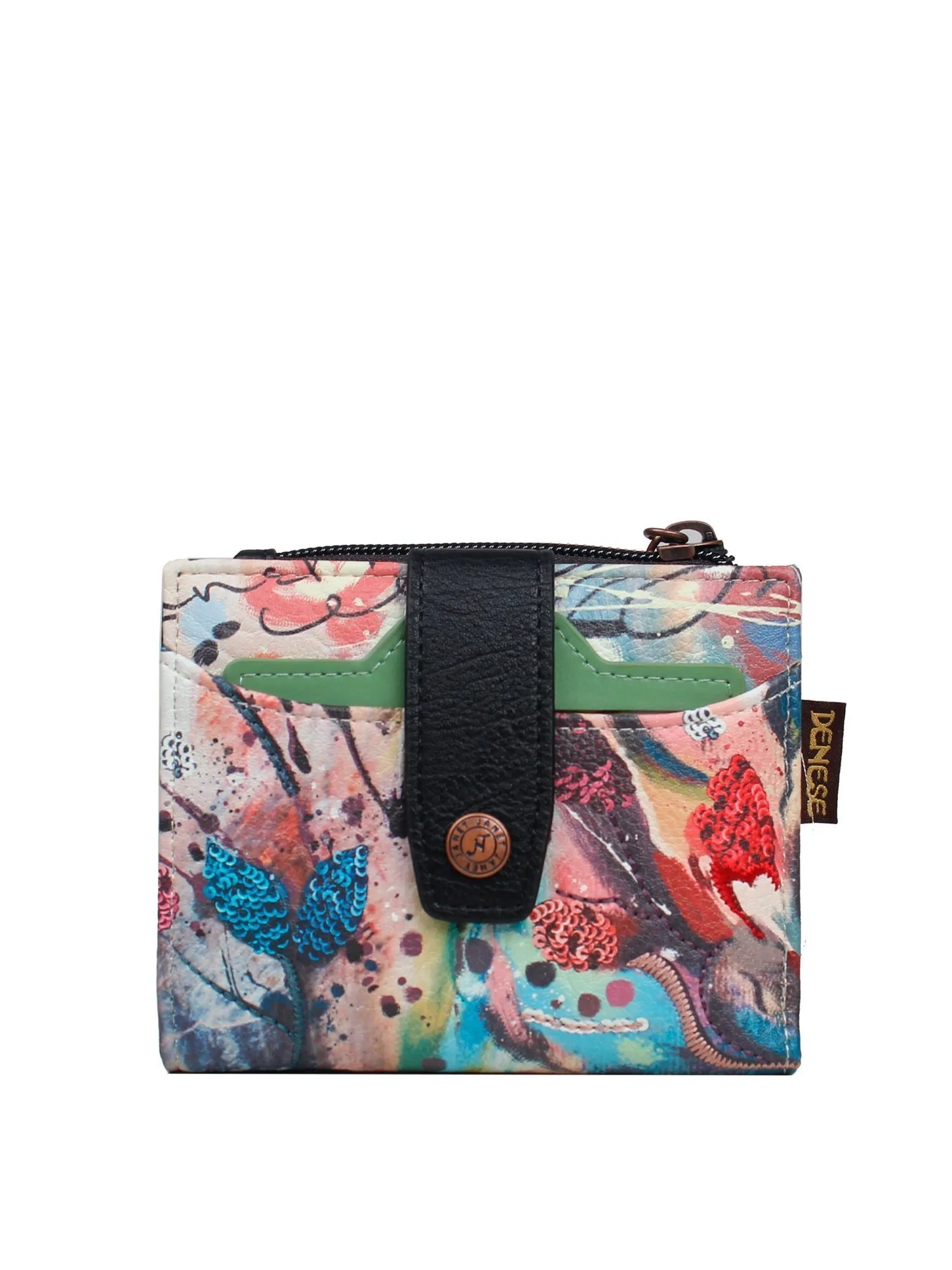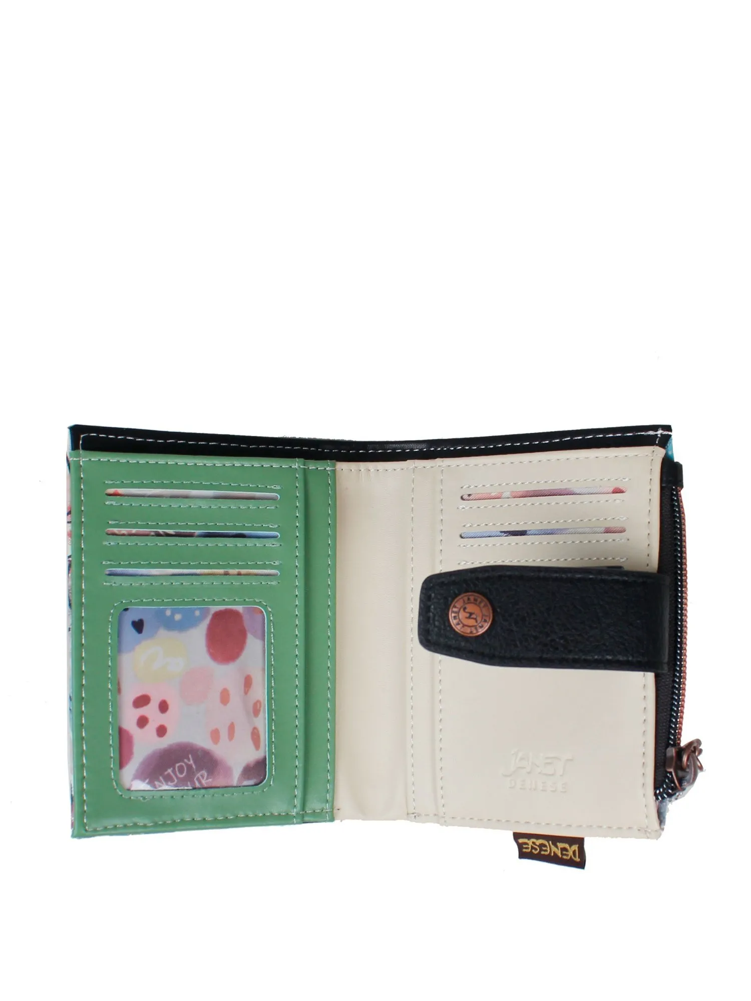 Под удобным хлястиком с кнопкой скрывается просторное отделение для купюр (в развёрнутом виде), а внутри вас ждет продуманная организация: три отделения для карточек, два маленьких отделения для мелочей и слот с прозрачным окошком для пропуска или фотографии. На внешней стороне расположены два дополнительных отделения для карточек для быстрого доступа, а на задней стороне — удобное отделение под молнией для монет.