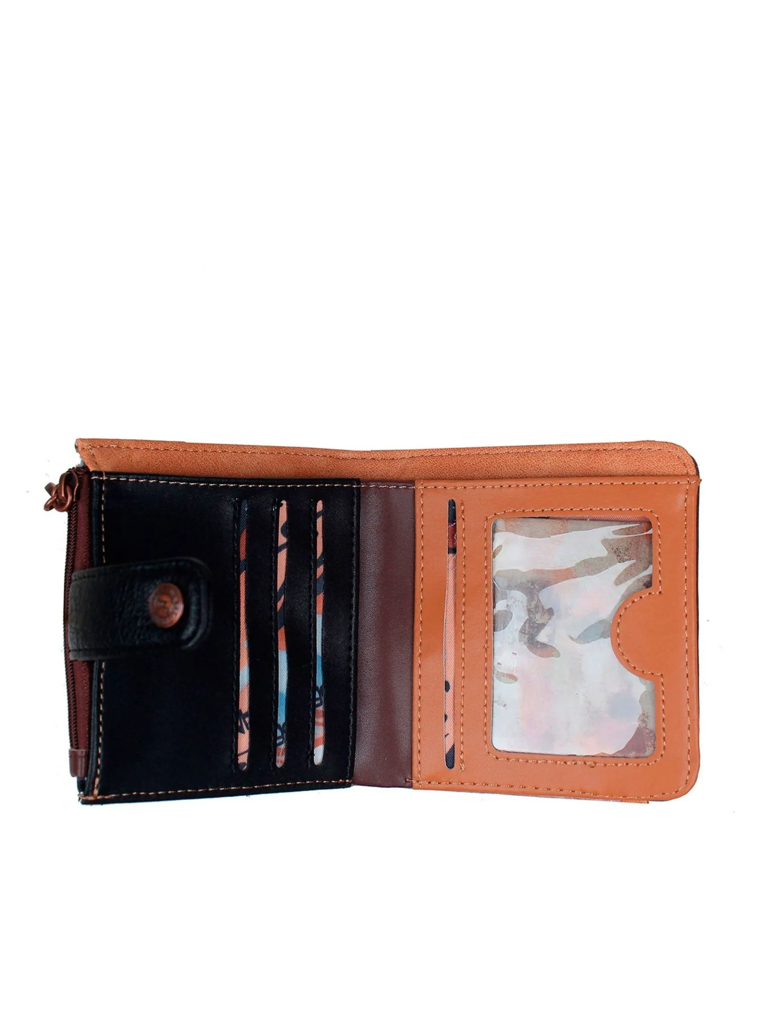Под удобным хлястиком с кнопкой скрывается просторное отделение для купюр (купюры помещаются в развернутом виде), а внутри вас ждет продуманная организация: три отделения для карточек, два маленьких отделения для мелочей и слот с прозрачным окошком для пропуска или фотографии. На внешней стороне расположены два дополнительных отделения для карточек для быстрого доступа, а на задней стороне — удобное отделение под молнией для монет.