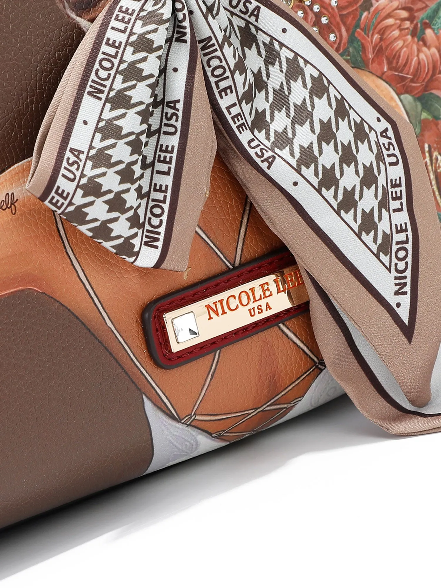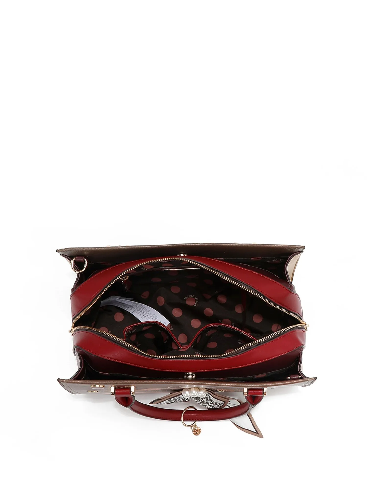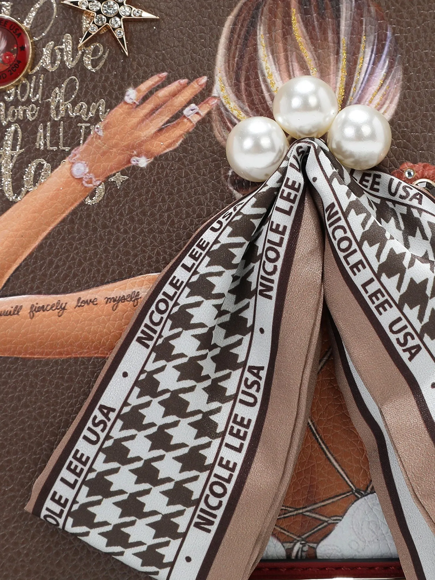 Оформление имеет множество уникальных деталей: спереди украшена искусственным жемчугом, бриллиантовыми стразами и красивой лентой, а также фирменными эмблемами и логотипом. На бежевой экокоже есть еле заметные бордовые пятна, имитирующие небрежную окраску, это добавляет сумке немного стиля гранж и хулиганства. На ручке маленькая фирменная подвеска.