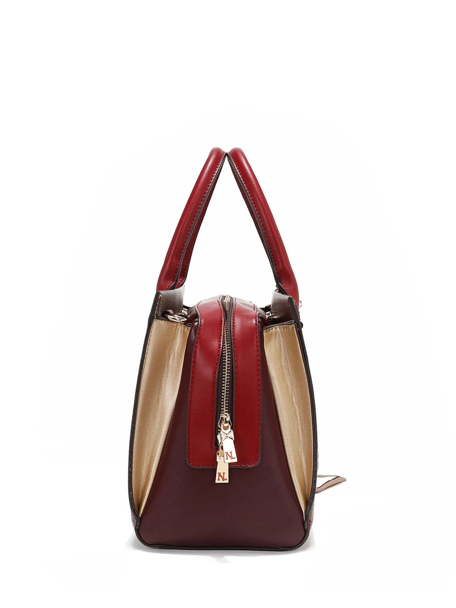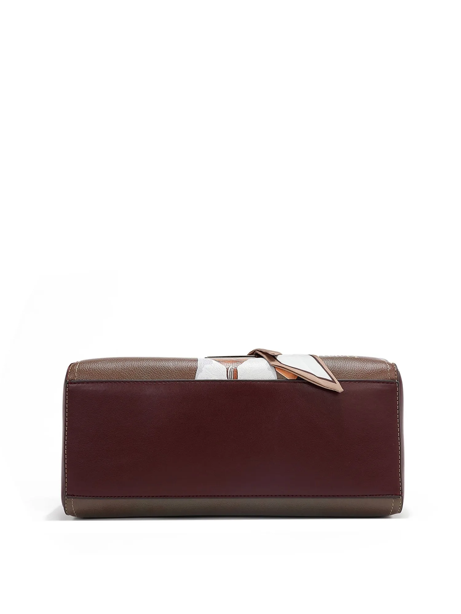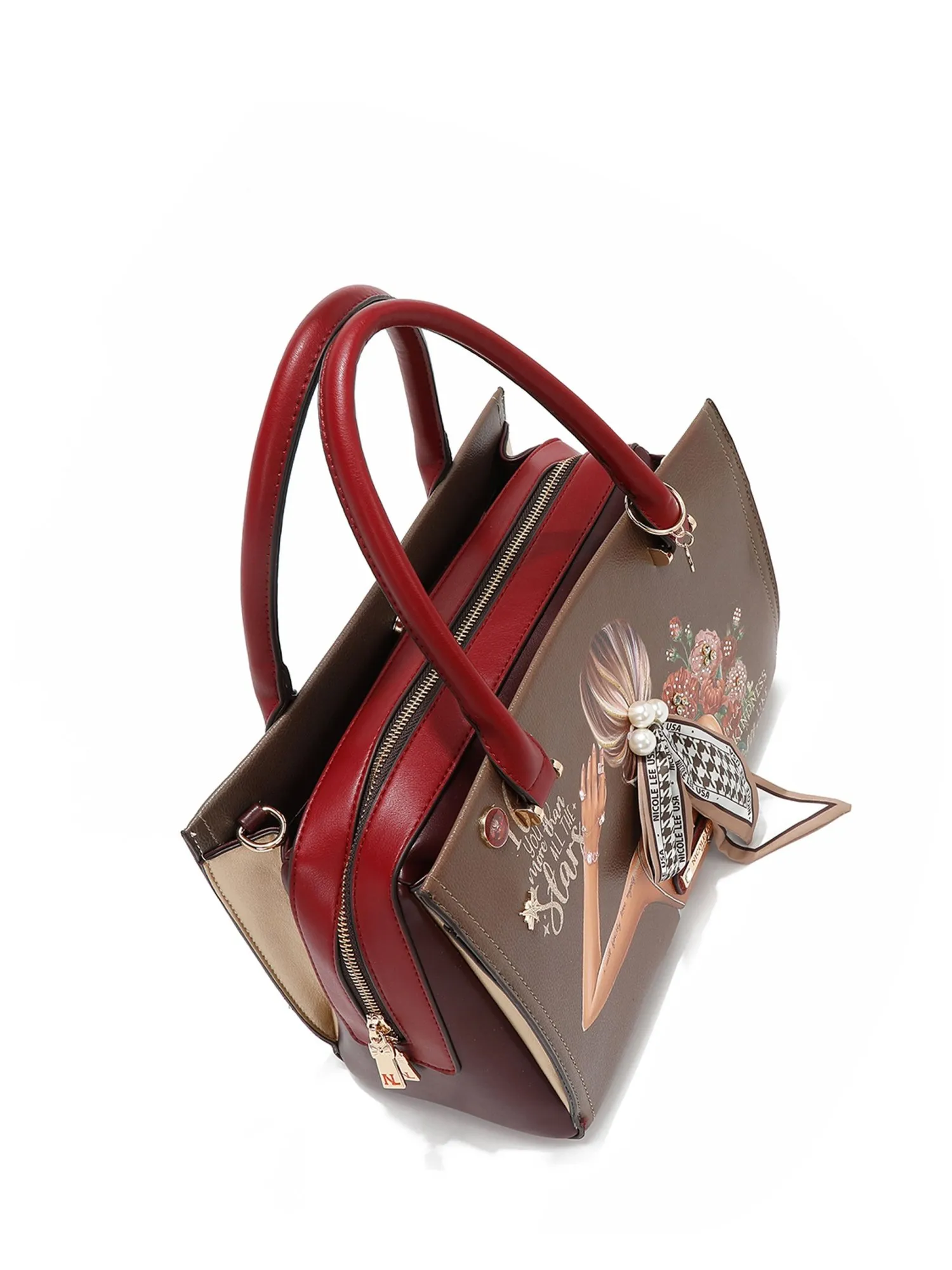 Оформление имеет множество уникальных деталей: спереди украшена искусственным жемчугом, бриллиантовыми стразами и красивой лентой, а также фирменными эмблемами и логотипом. На бежевой экокоже есть еле заметные бордовые пятна, имитирующие небрежную окраску, это добавляет сумке немного стиля гранж и хулиганства. На ручке маленькая фирменная подвеска.