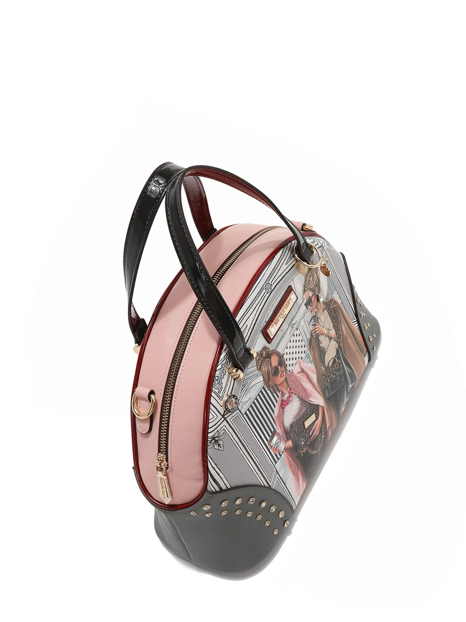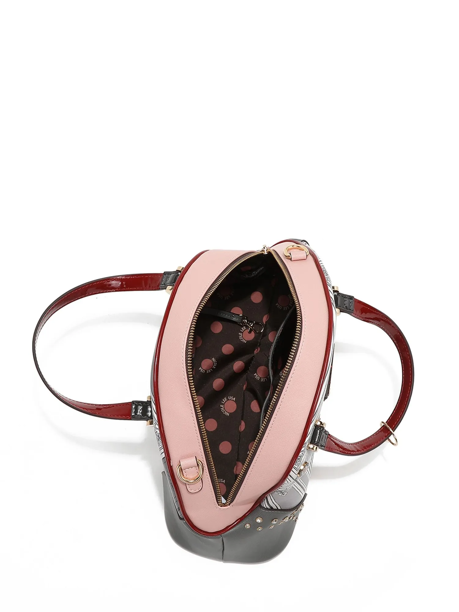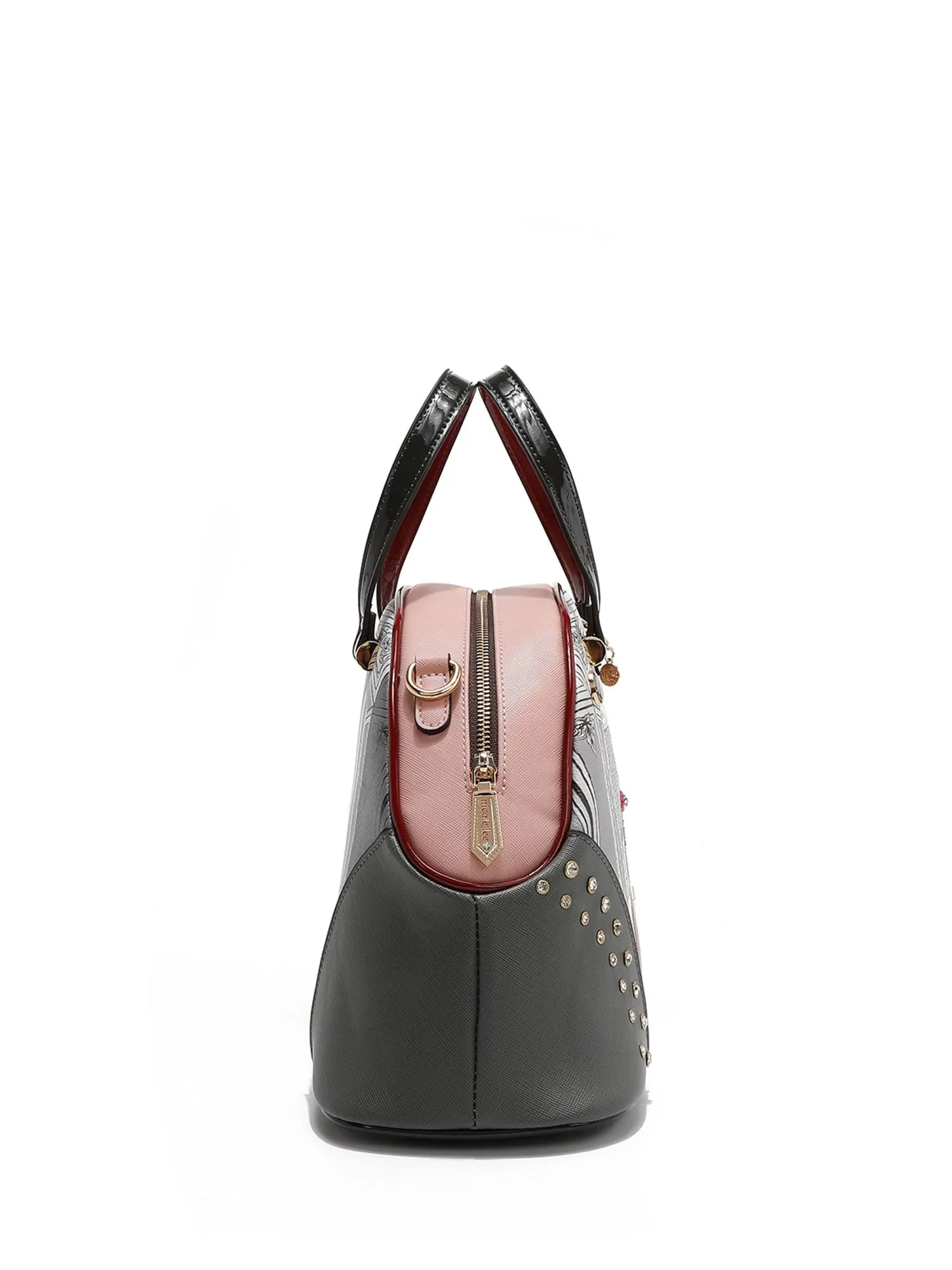 Дизайн сумки поразит вас множеством уникальных деталей: спереди украшена вышивкой, бриллиантовыми стразами, клепками, пайетками и золотистым напылением, а также фирменными эмблемами и логотипом. На ручке маленькая фирменная подвеска.