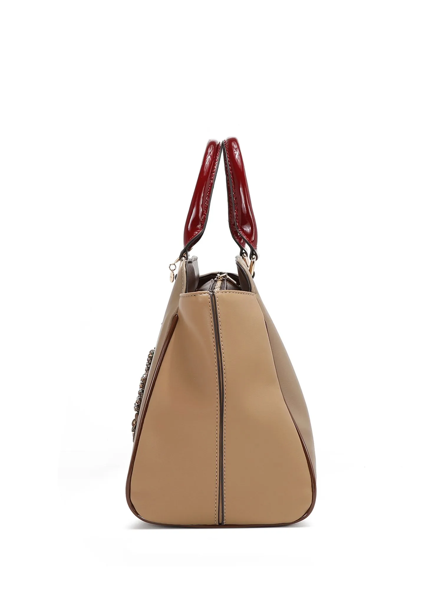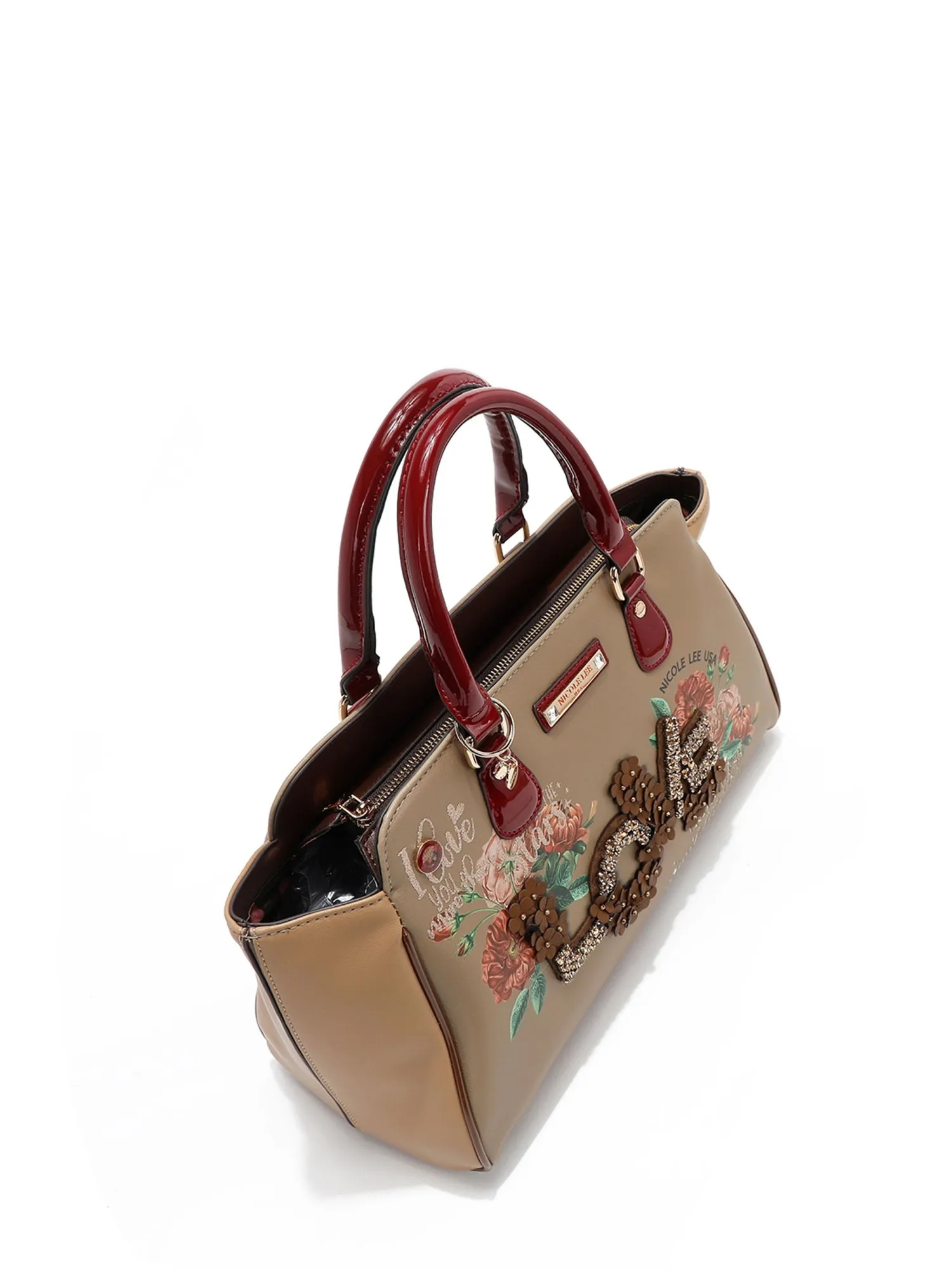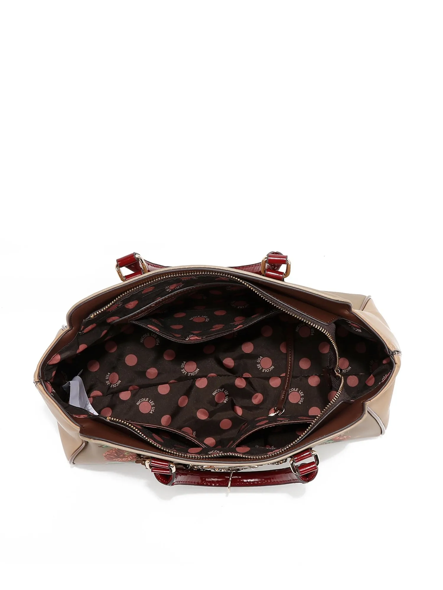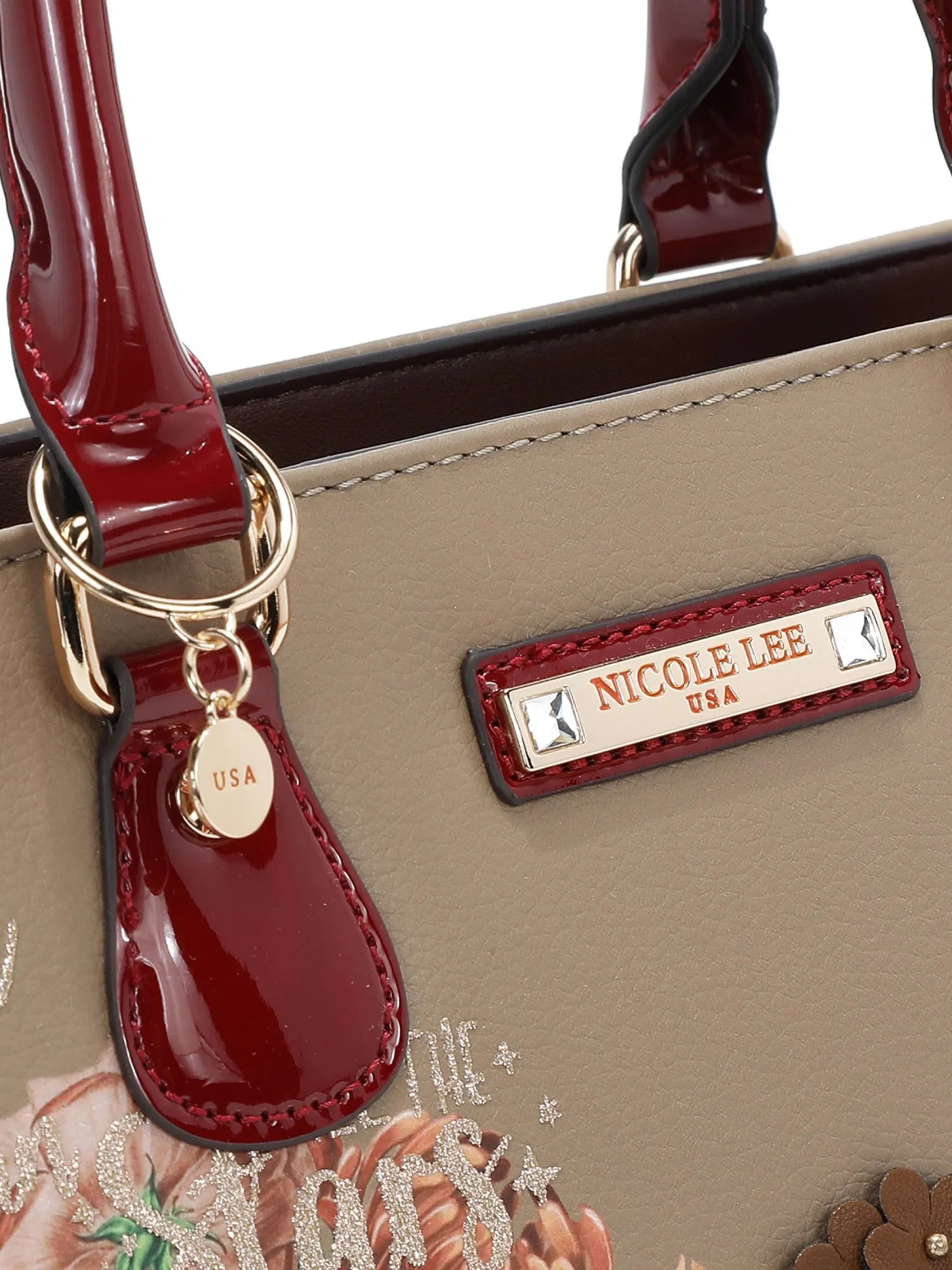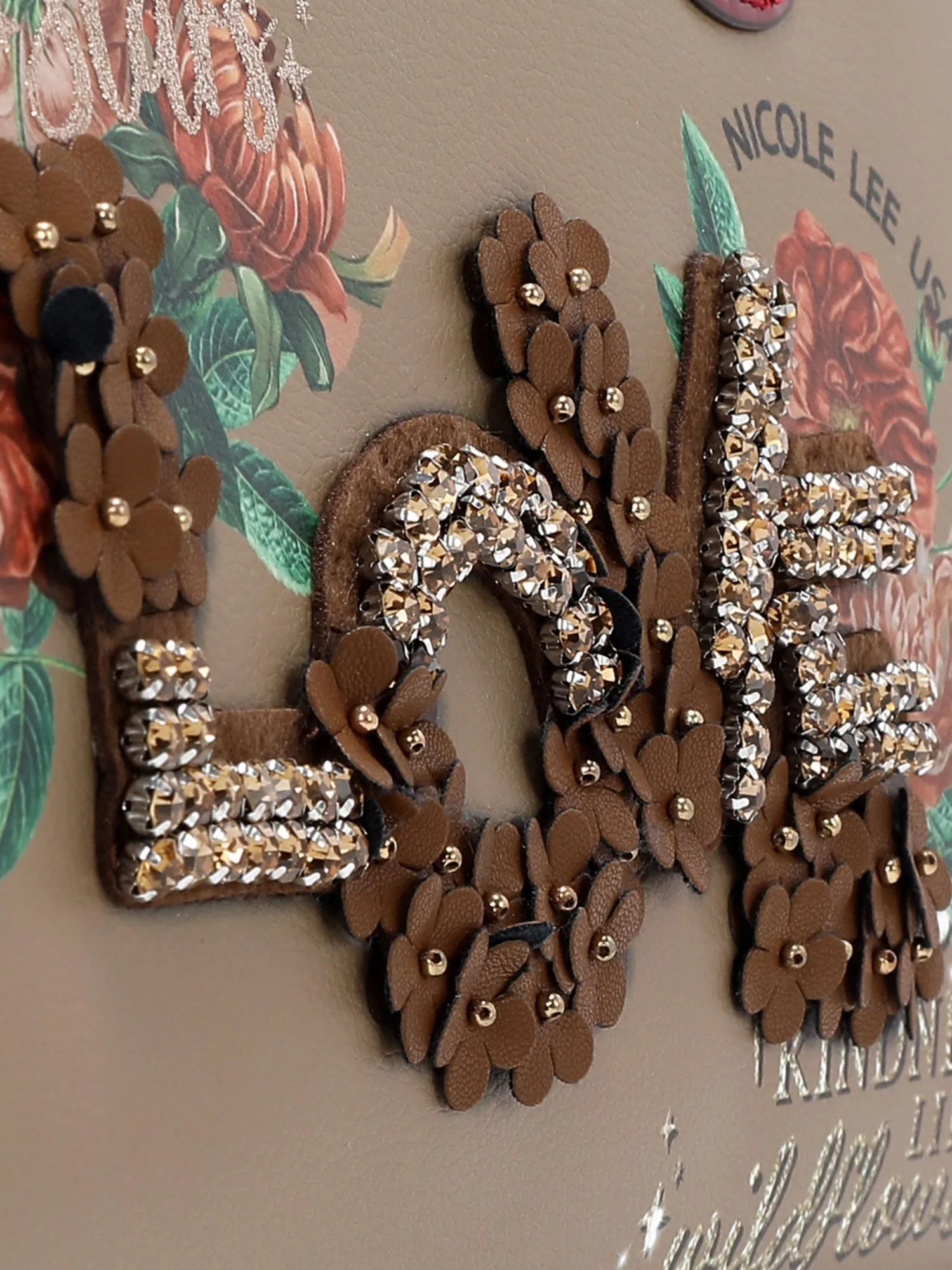 Сумка обладает эксклюзивным дизайном и порадует своей функциональностью. Оформление имеет множество уникальных деталей: спереди украшена цветами из веганской кожи, усыпанными бисером и стразами, на задней стороне цветочный принт. Сумка изготовлена из мягкой и качественной экокожи, при этом она хорошо держит форму. Основное отделение закрывается на молнию, внутри есть карман на молнии и два открытых кармана, внутренняя подкладка из полиэстера в горошек. Сзади есть вместительный карман на молнии с цветочным принтом (вмещает телефон не более 16 см.). В комплекте длинный регулируемый ремень, который позволит носить сумку через плечо. Листы формата А4 в сумку помещаются, но края при этом немного загибаются. Не упустите возможность добавить нежности и женственности в свой повседневный образ. Станьте обладательницей этой прекрасной женской сумки от NICOLE LEE!