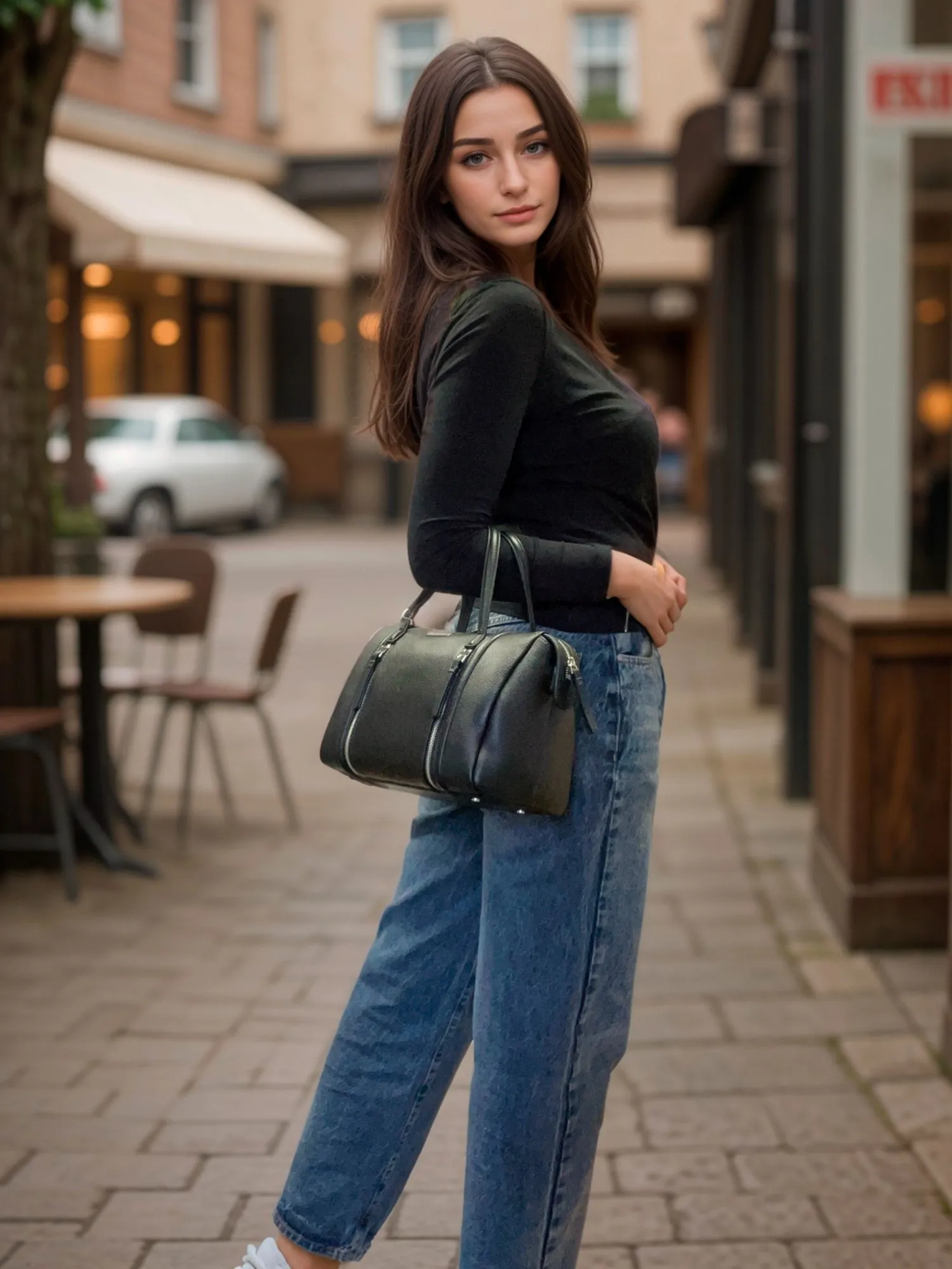 Основное отделение закрывается на молнию. Внутри сумки один открытый карман, два вместительных кармана на молнии и небольшое открытое отделение между карманами. Сумку украшают две молнии, под ними есть два независимых друг от друга кармана. Плечевой ремень из натуральной кожи, который позволяет носить ее на плече с комфортом. На дне есть металлические ножки, которые защитят сумку от загрязнений.