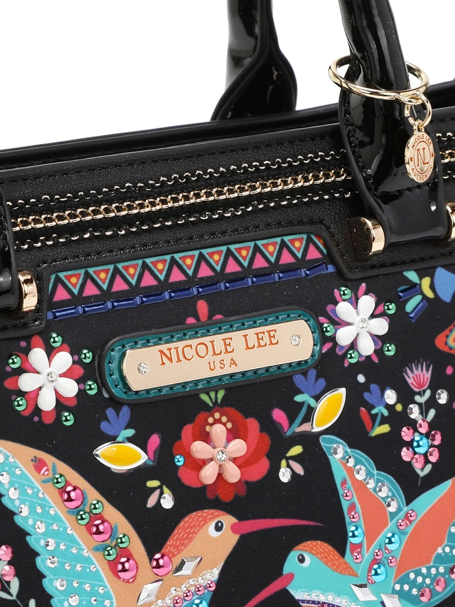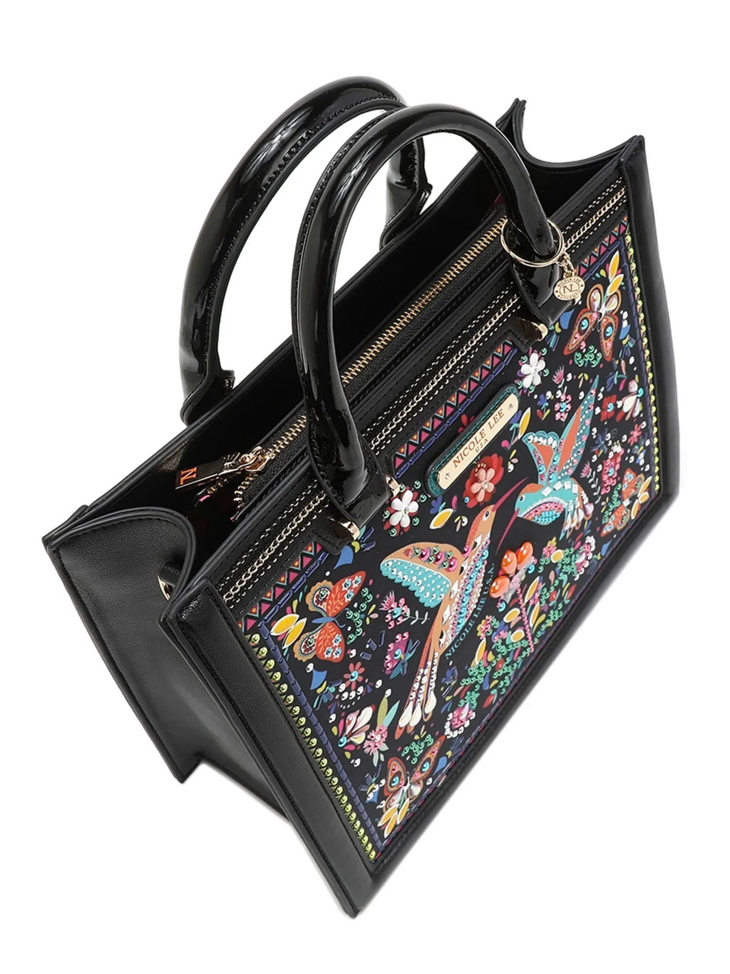 Познакомьтесь с классической женской сумкой через плечо из коллекции Bosque de Amor. Этот модный аксессуар станет незаменимым в повседневной жизни. Сумка выполнена из высококачественной экокожи, которая выглядит очень стильно и элегантно. Ее эксклюзивный дизайн привлечет взгляды окружающих. С внешней стороны сумка украшена переливающимися и разноцветными камнями, бусинами и декоративной тесьмой, а сзади яркий принт с райскими птицами.