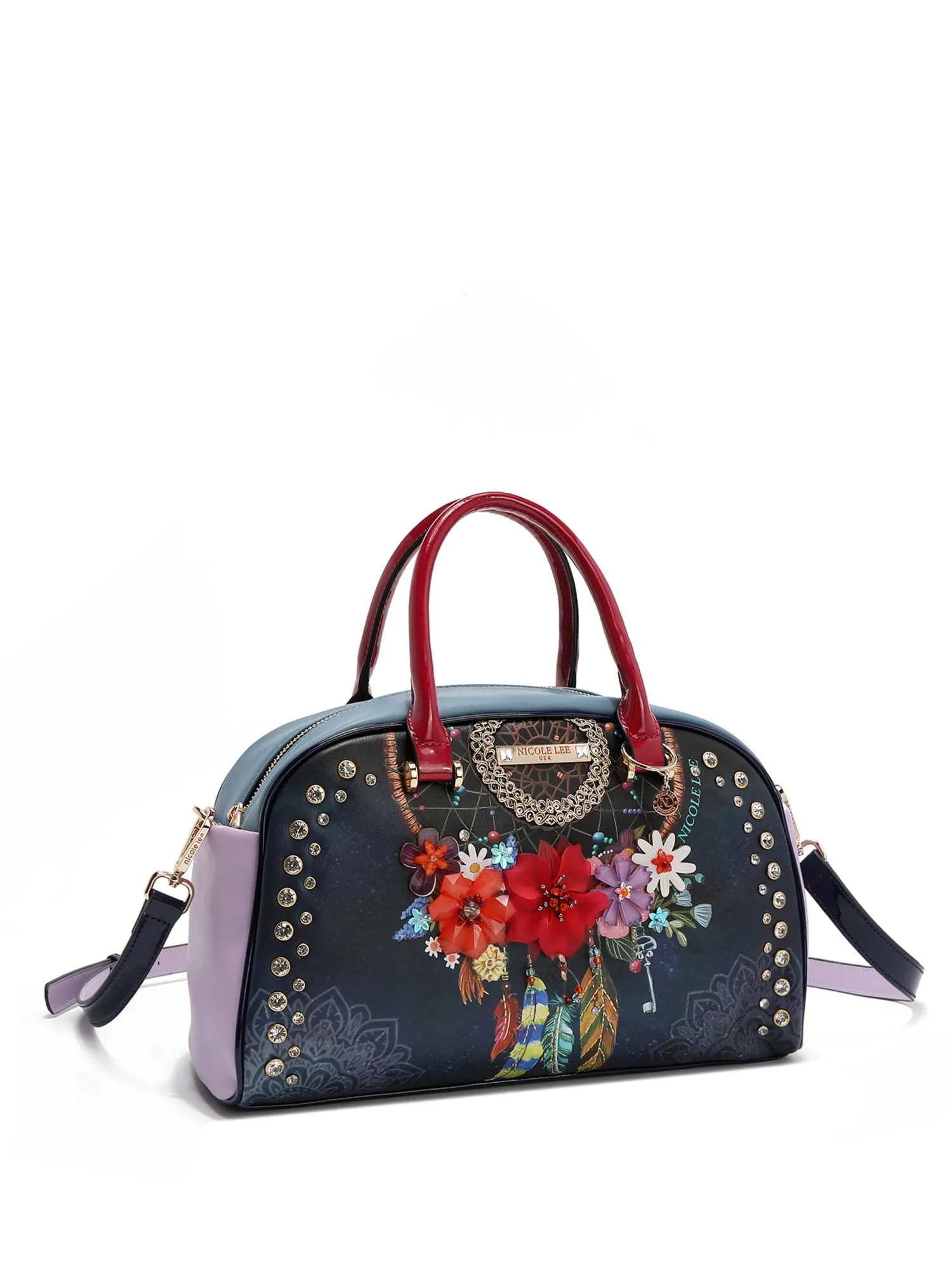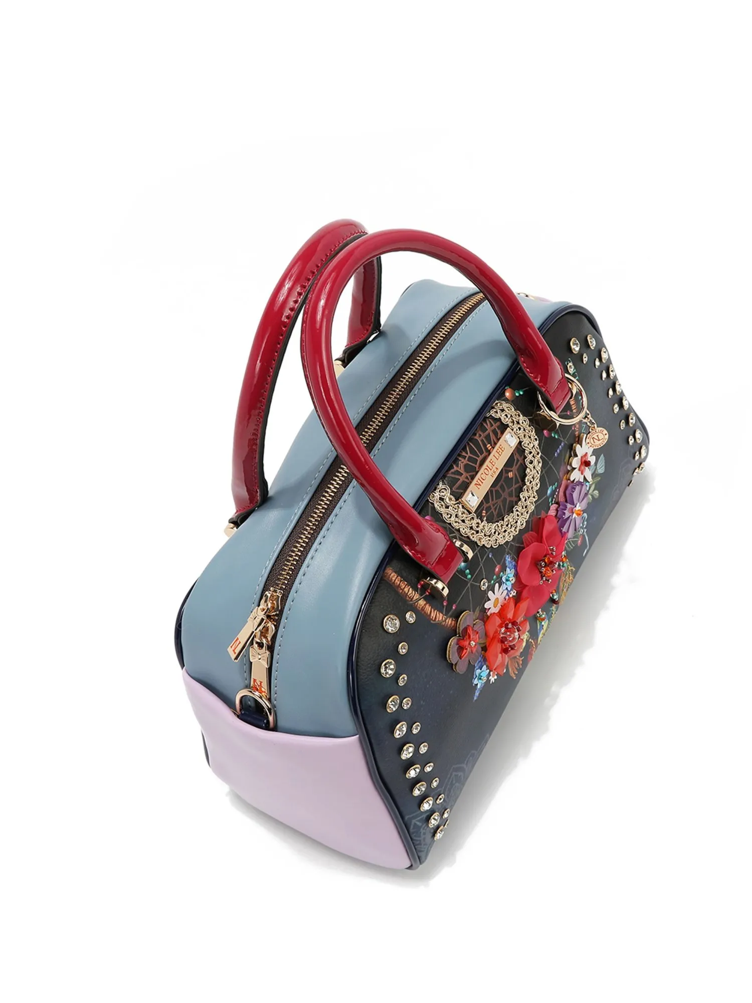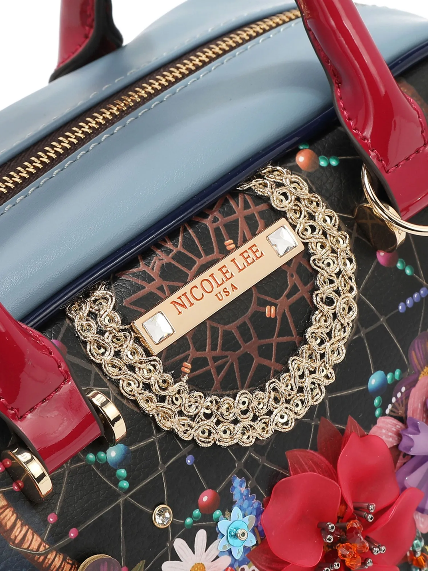 Дизайн удивляет и очаровывает, спереди фирменный принт коллекции – ловец снов, который украшают объёмные цветы с бусинами и бисером, подвески из стекляруса с вышивкой хорошо закреплены, наверху рисунок обрамляет золотое кружево, а сбоку клёпки со стразами. На ручке маленькая фирменная подвеска. На дне есть металлические ножки, которые защитят от загрязнений.