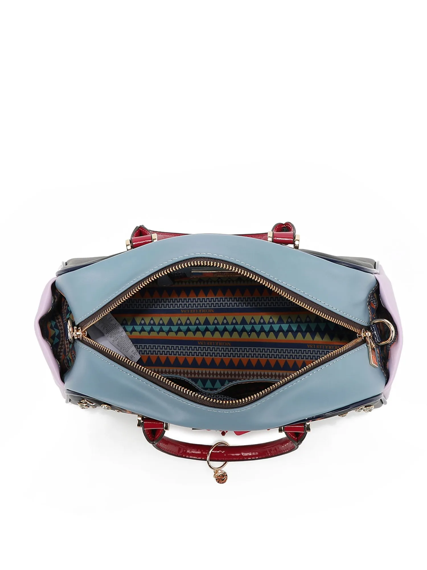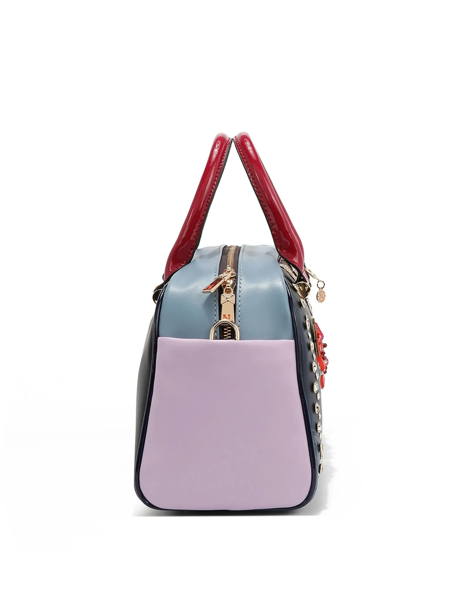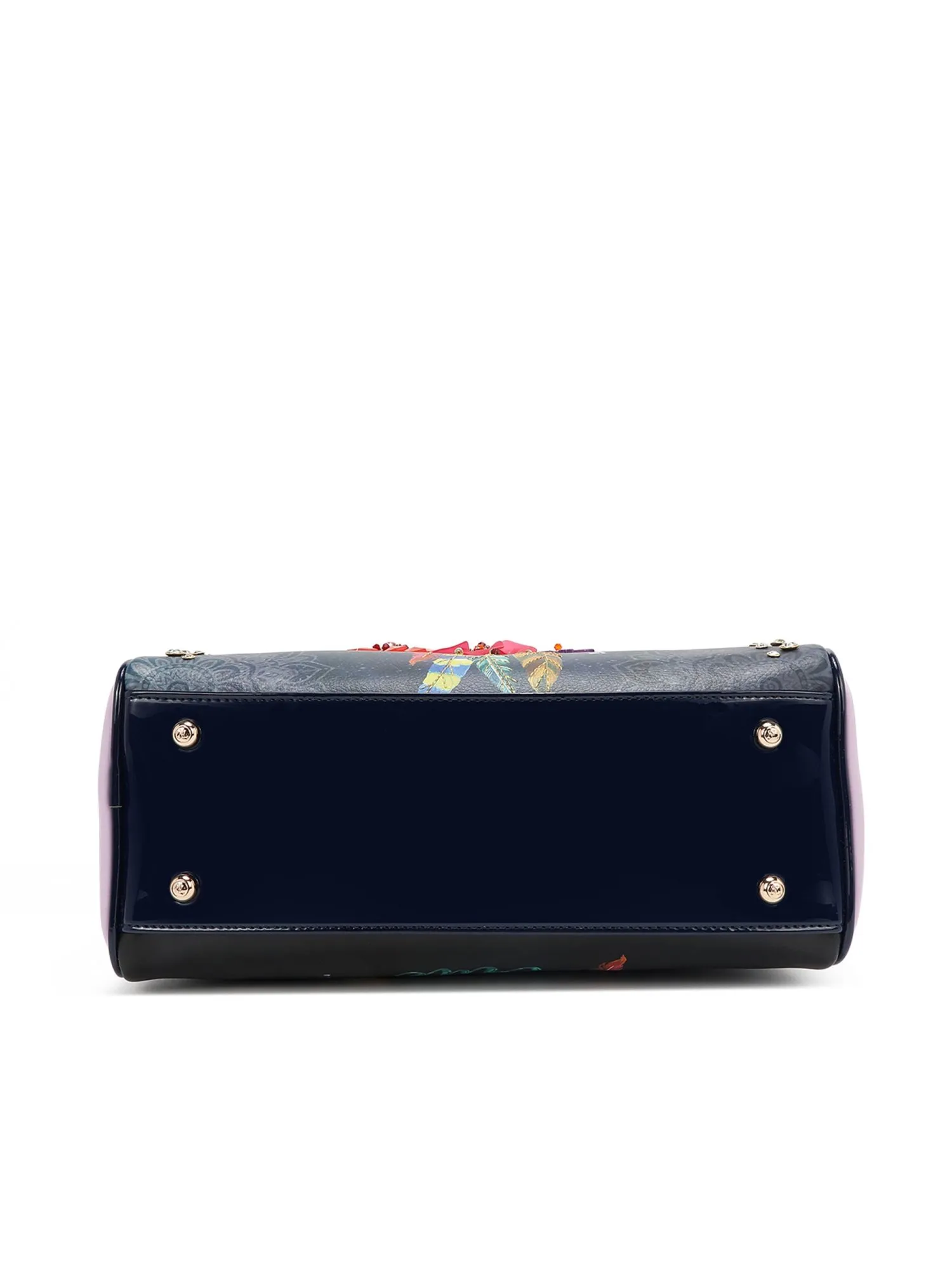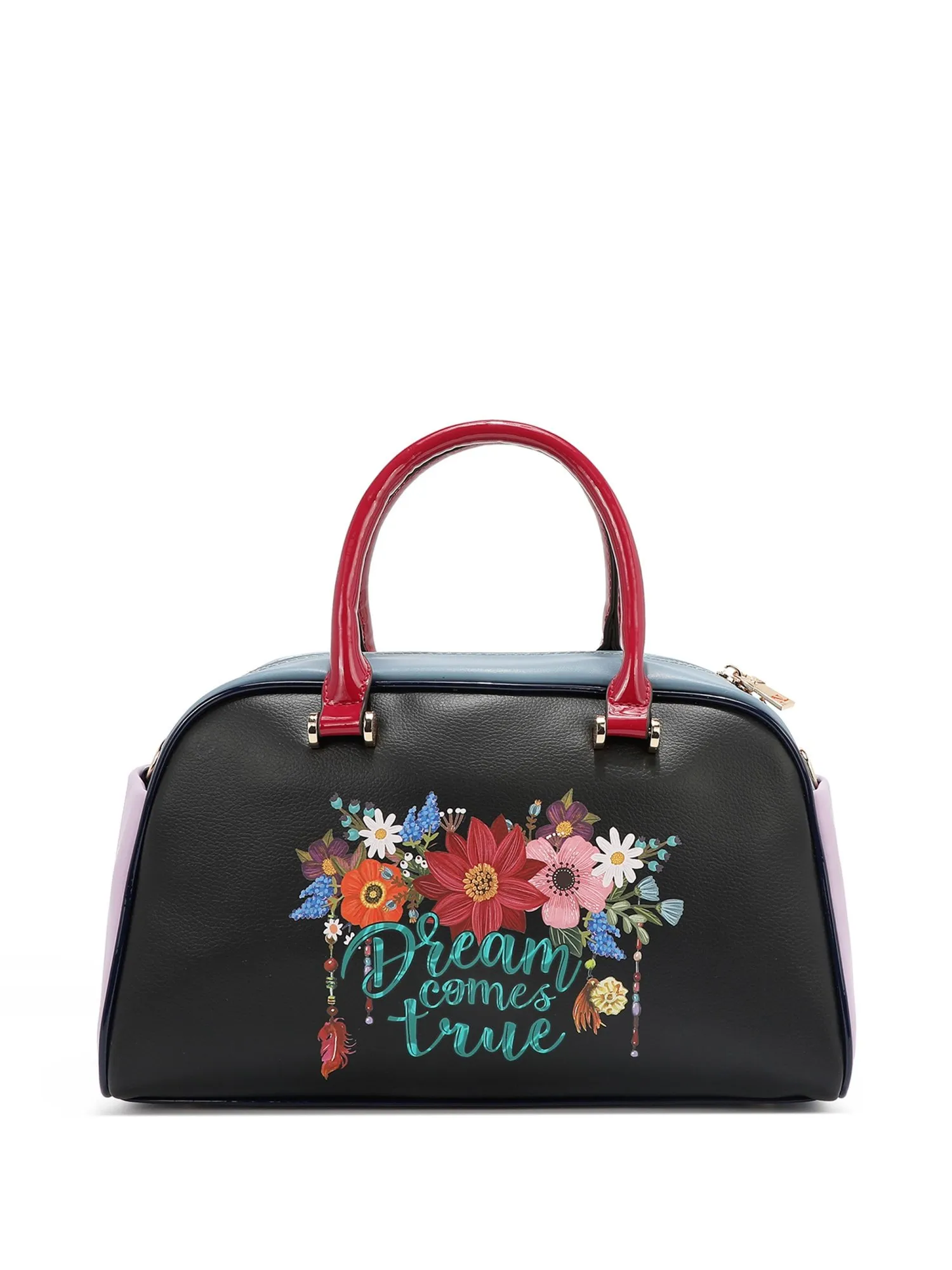 Дизайн удивляет и очаровывает, спереди фирменный принт коллекции – ловец снов, который украшают объёмные цветы с бусинами и бисером, подвески из стекляруса с вышивкой хорошо закреплены, наверху рисунок обрамляет золотое кружево, а сбоку клёпки со стразами. На ручке маленькая фирменная подвеска. На дне есть металлические ножки, которые защитят от загрязнений.