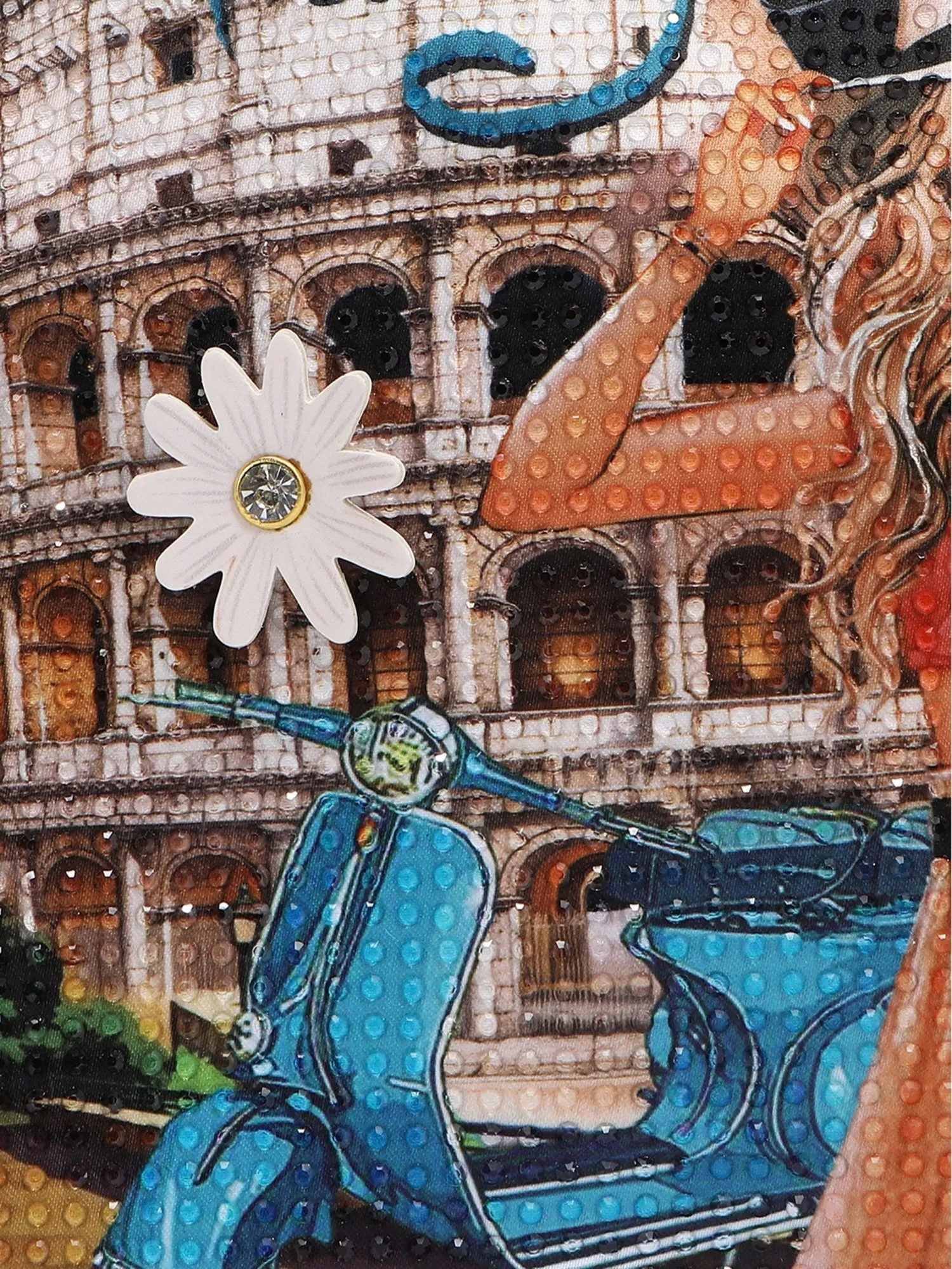 Внешний большой карман и задняя часть сумки выполнена из высококачественного текстиля, а боковые части и дно из экокожи, внутри оригинальный подклад из полиэстера. С внешней стороны женская сумка кросс боди украшена фирменным принтом из коллекции с прозрачными переливающимися стразами, которые дают красивый блеск, декорирована объёмными цветами и милой маленькой подвеской на ручке. Сзади вы найдете яркий принт с достопримечательностями Италии. Чёрная сумка через плечо отличается стильным дизайном и функциональностью, и станет отличным дополнением к вашему образу. Порадуйте себя этой черной красавицей от американского бренда Nicole Lee!