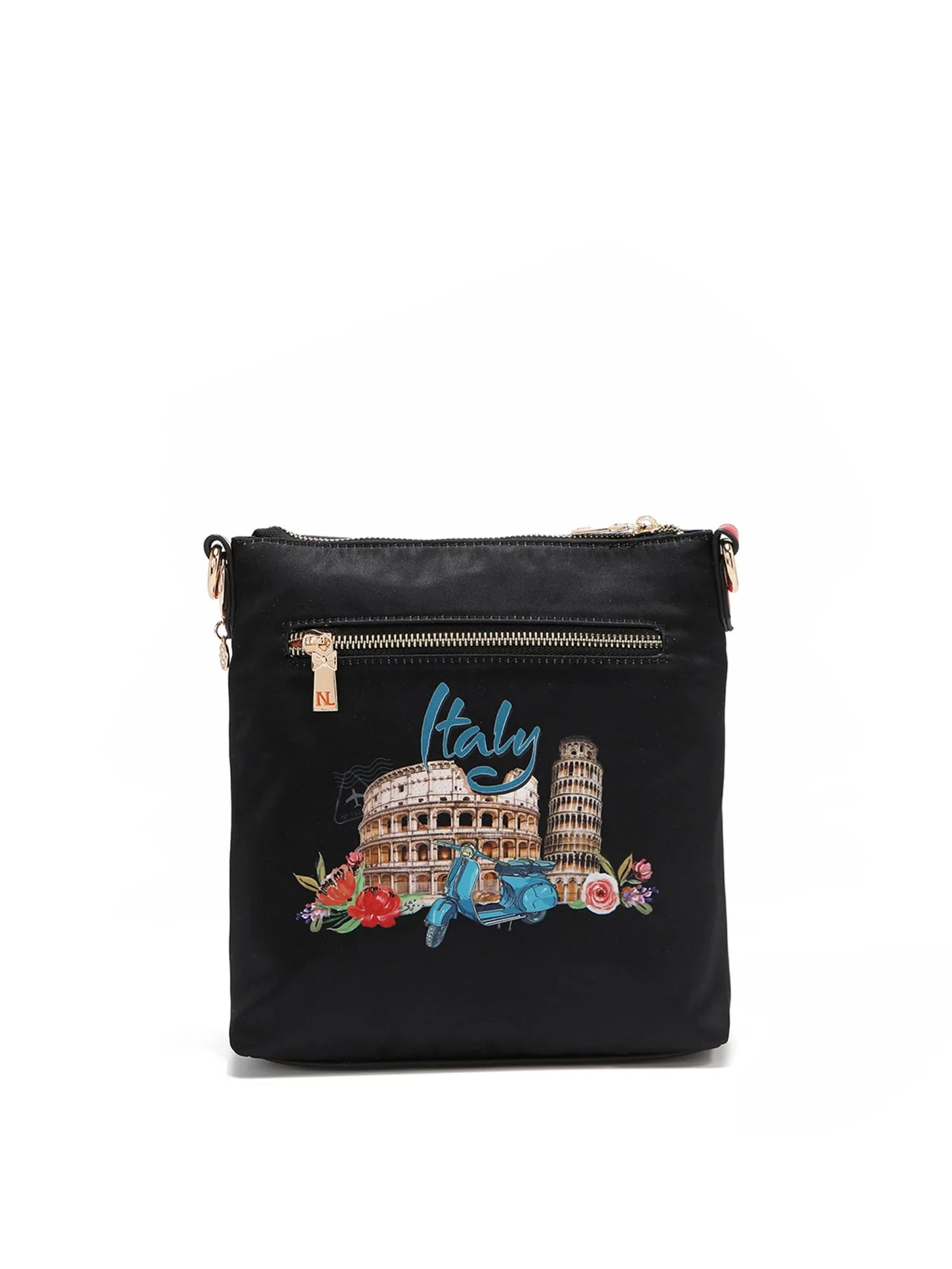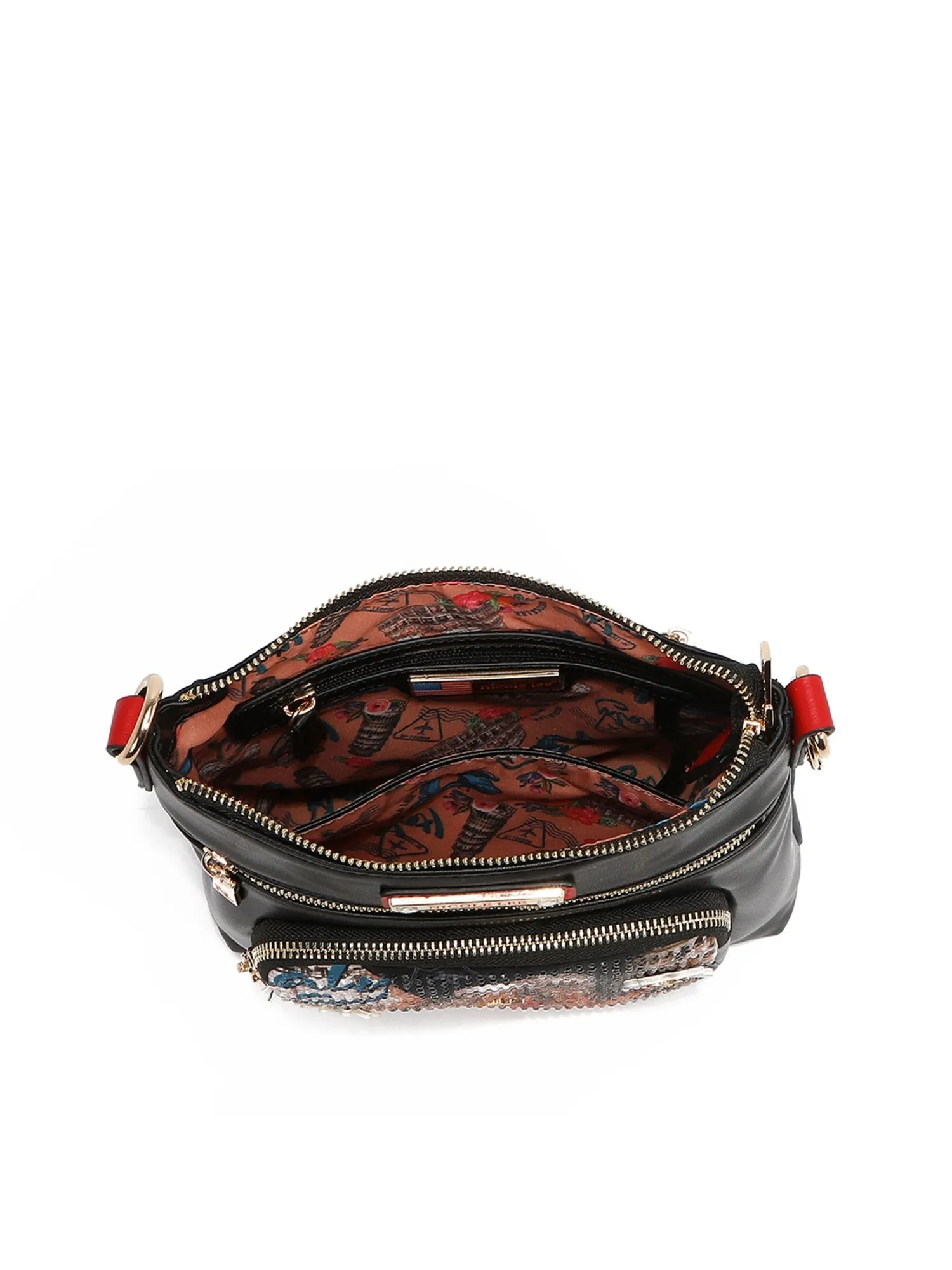 Основное отделение на молнии, внутри одно отделение, открытый карман и карман на молнии, ремешок для ключей. Спереди сумка украшена карманами: передний карман накладной карман с принтом и второй карман на молнии для телефона. На задней стороне сумки есть ещё один вместительный карман на молнии. Внутренняя подкладка из полиэстера с принтом премиум-класса.