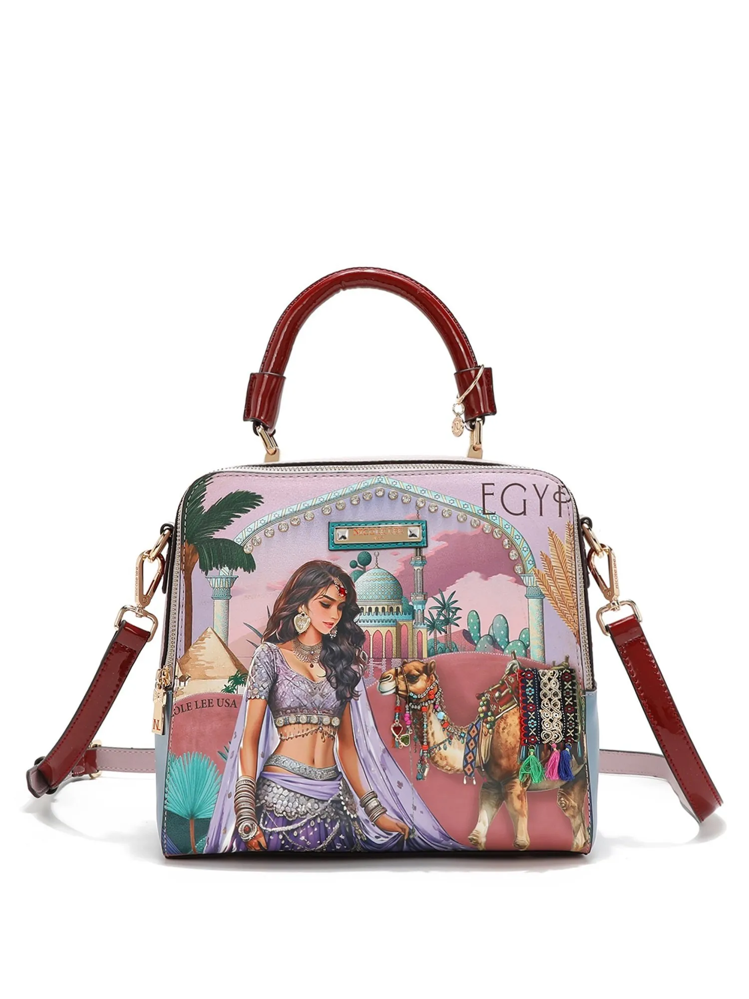 Дизайн сумки поразит вас своими деталям. Красавицу Клеопатру украшают клепки со стразами, золотая подвеска и камень в виде жука скарабея, который приносит удачу. На верблюде подвески из бисера и накидка с бахромой. Сумка выполнена в нежно сиреневых оттенках добавляя восточную изысканность и нежность вашему образу. Сумка идеальна для повседневных прогулок, вечерних свиданий и путешествий, сочетая стиль и функциональность в одном потрясающем дизайне!