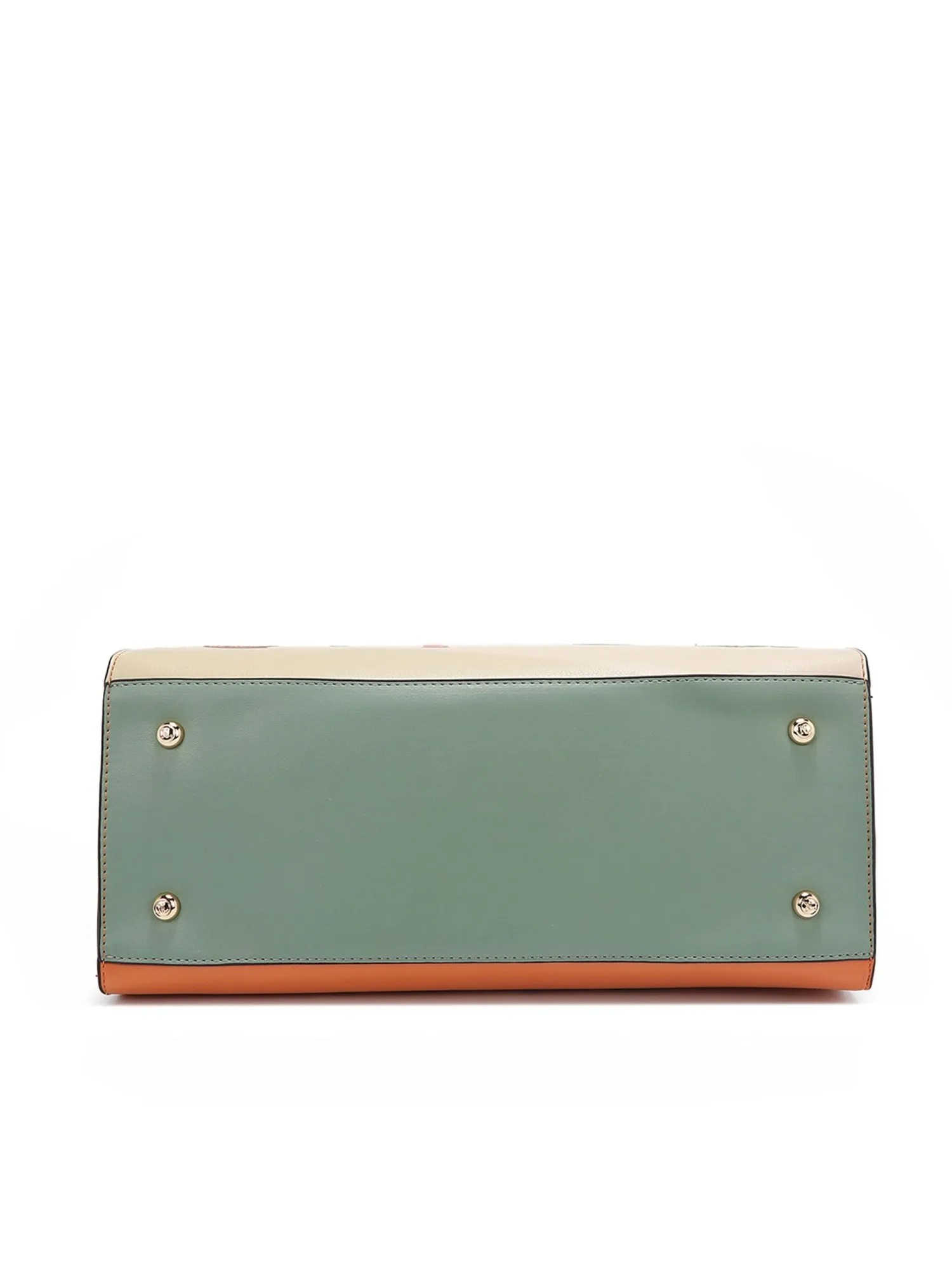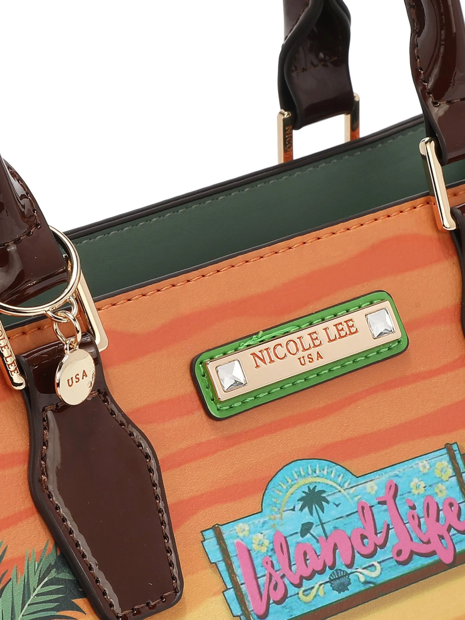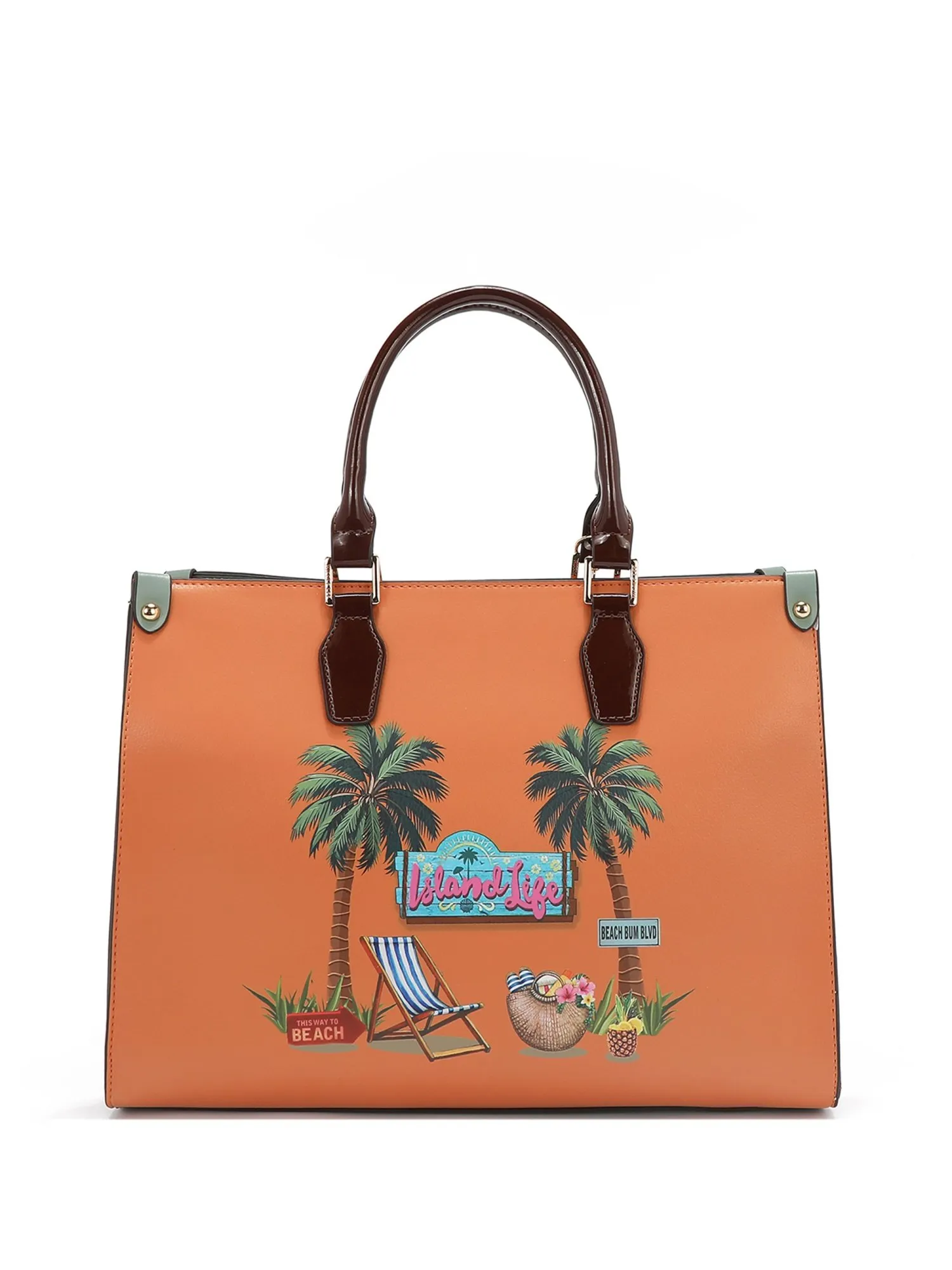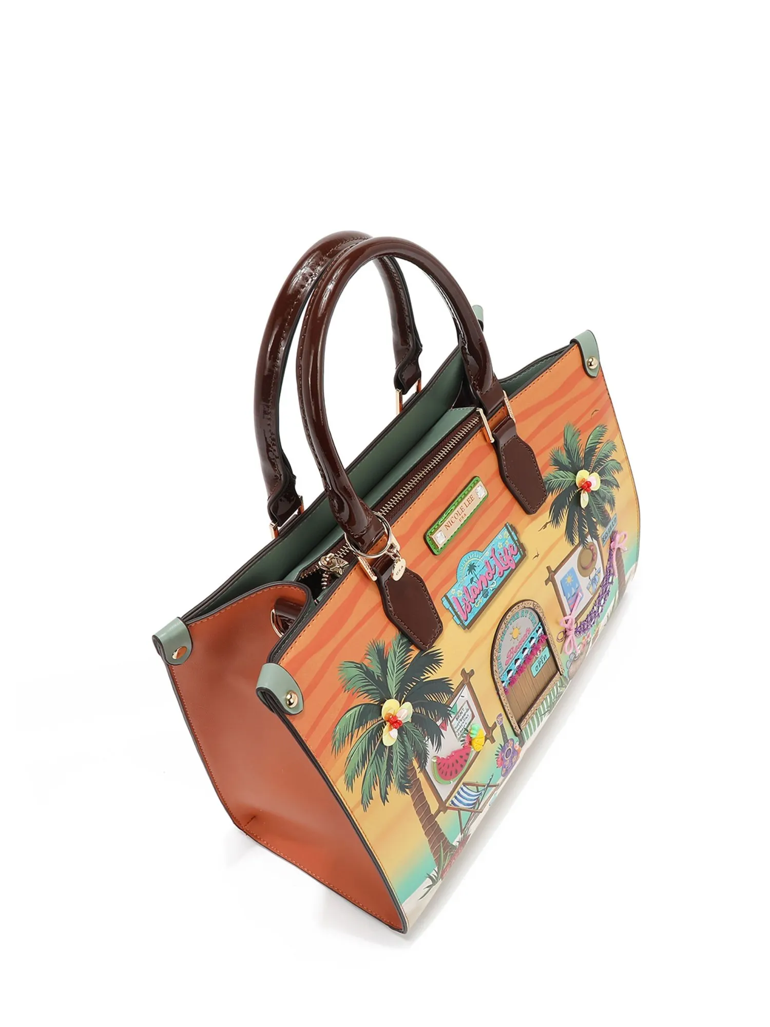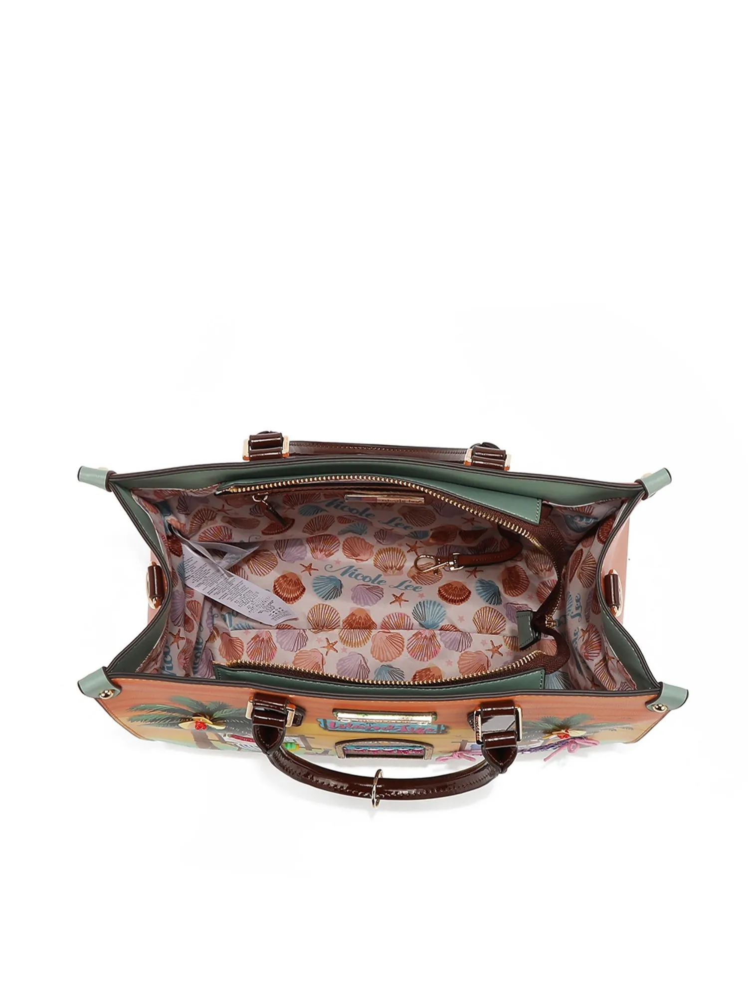 Яркий дизайн, элегантная форма с дополнительной функциональностью идеальное сочетание для вашей новой сумки. Большое количество деталей в дизайне поразит вас и создаст отличное настроение. Эксклюзивный принт дополняют различные объёмные украшения: фигурки в виде фруктов, пайетки и бисер на пальмах, 3д окно с объёмной рамой и бахромой, плетеный гамак украшен пайетками и шнурками, всё это хочется рассматривать и мечтать о предстоящем отпуске. Классическая по форме сумка сочетает в себе стиль и удобство: основное отделение на молнии, внутри пару открытых карманов и карман на молнии. Ручки украшены фирменной подвеской, добавляя шарм этой модели. В комплекте есть длинный ремень, который позволит носить сумку через плечо. Металлические ножки на дне сумки защитят от загрязнений.