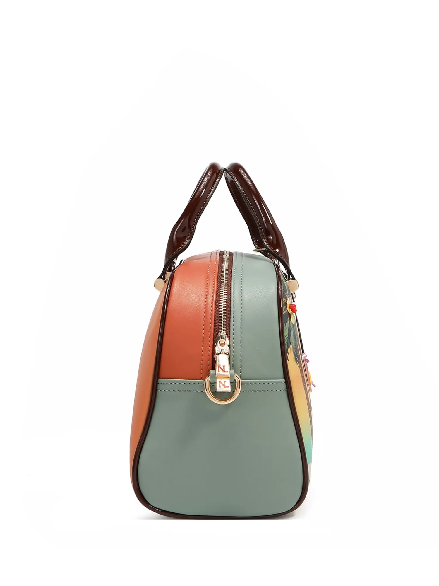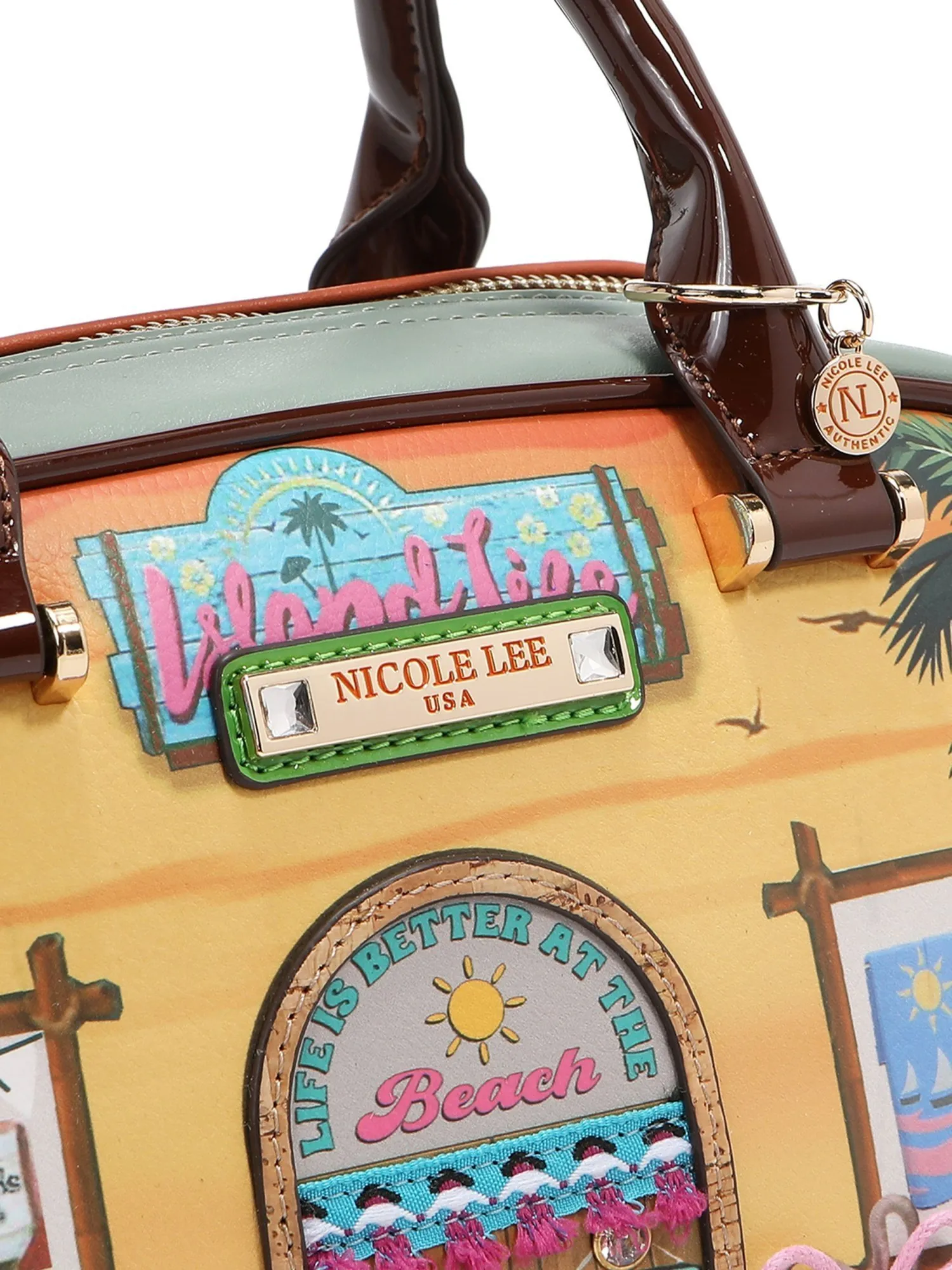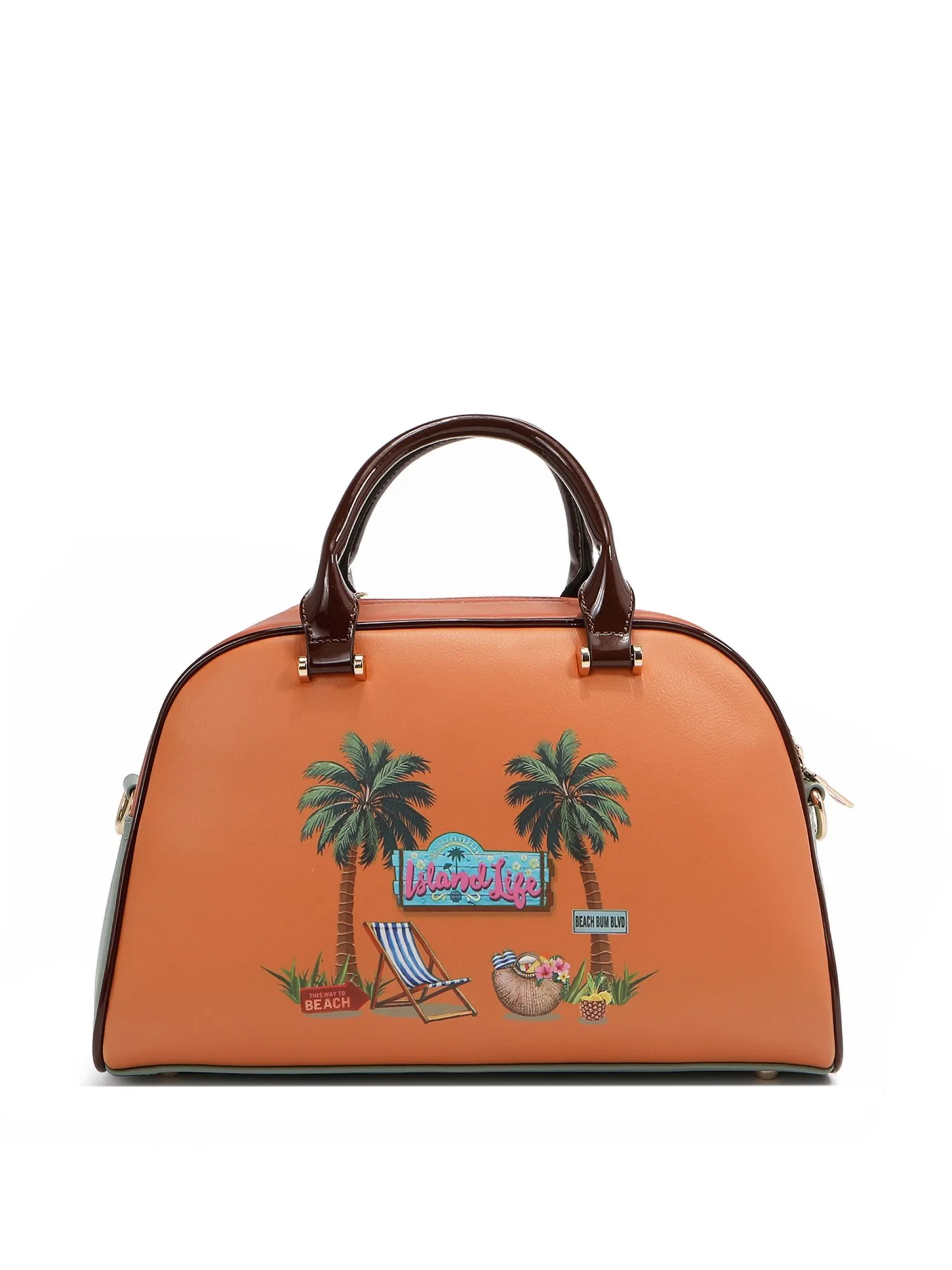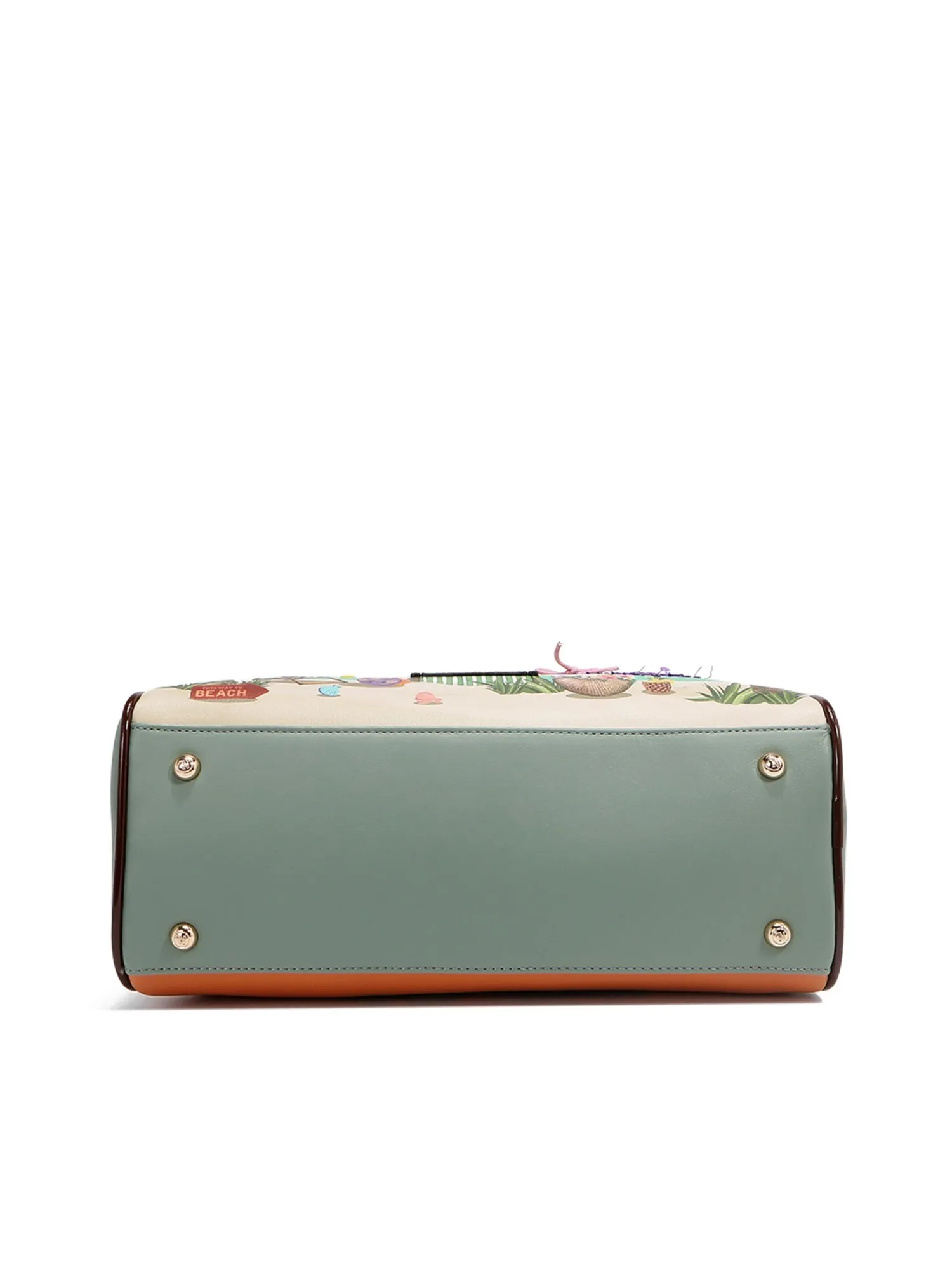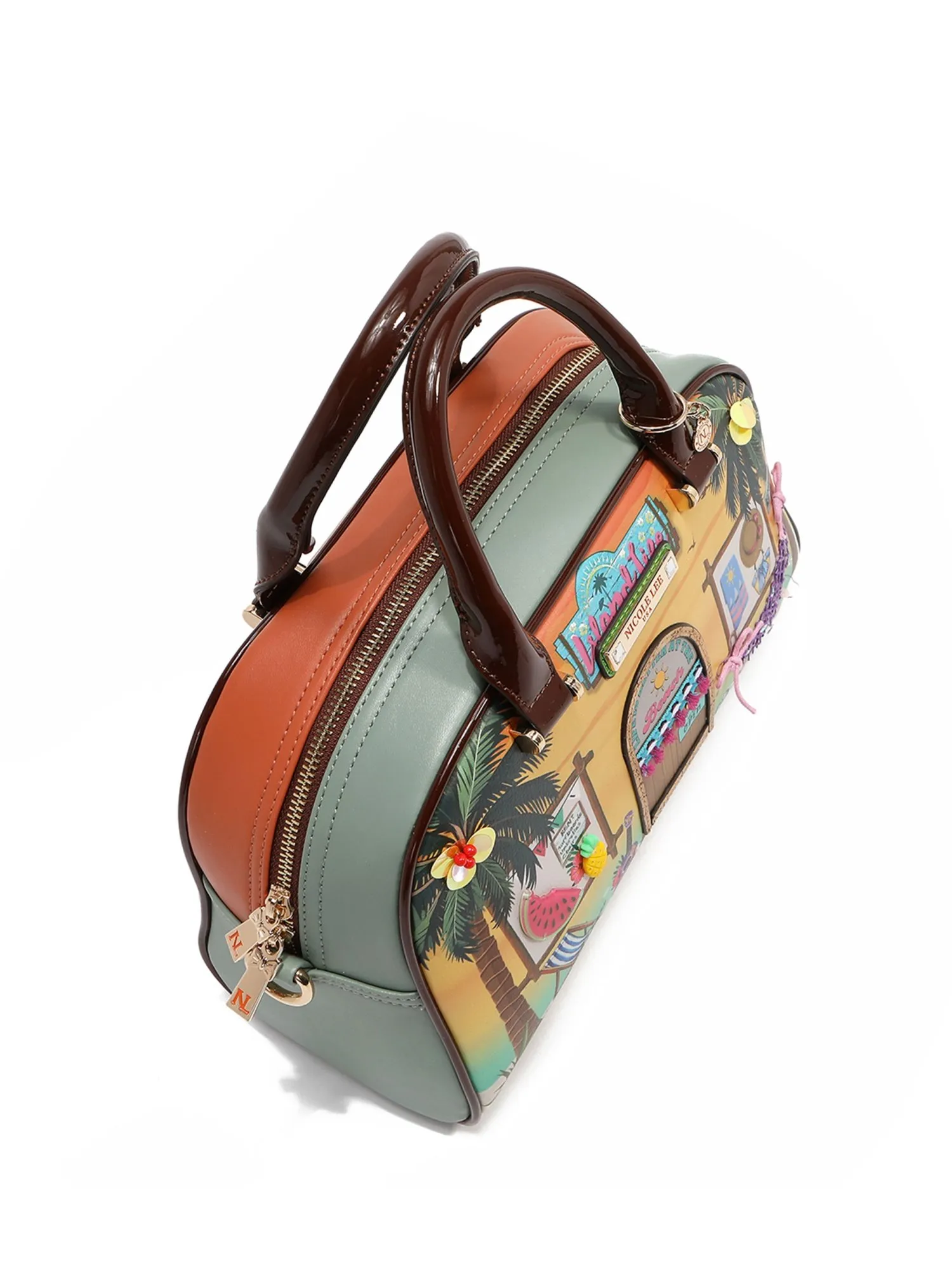 Яркий дизайн, элегантная форма с дополнительной функциональностью идеальное сочетание для вашей новой сумки. Большое количество деталей в дизайне поразит вас и создаст отличное настроение. Эксклюзивный принт дополняют различные объёмные украшения: фигурки в виде фруктов, пайетки и бисер на пальмах, 3д окно с объёмной рамой и бахромой, плетеный гамак украшен пайетками и шнурками, всё это хочется рассматривать и мечтать о предстоящем отпуске. Короткие ручки украшены фирменной подвеской, добавляя шарм этой модели. В комплекте есть длинный ремень, который позволит носить сумку через плечо.