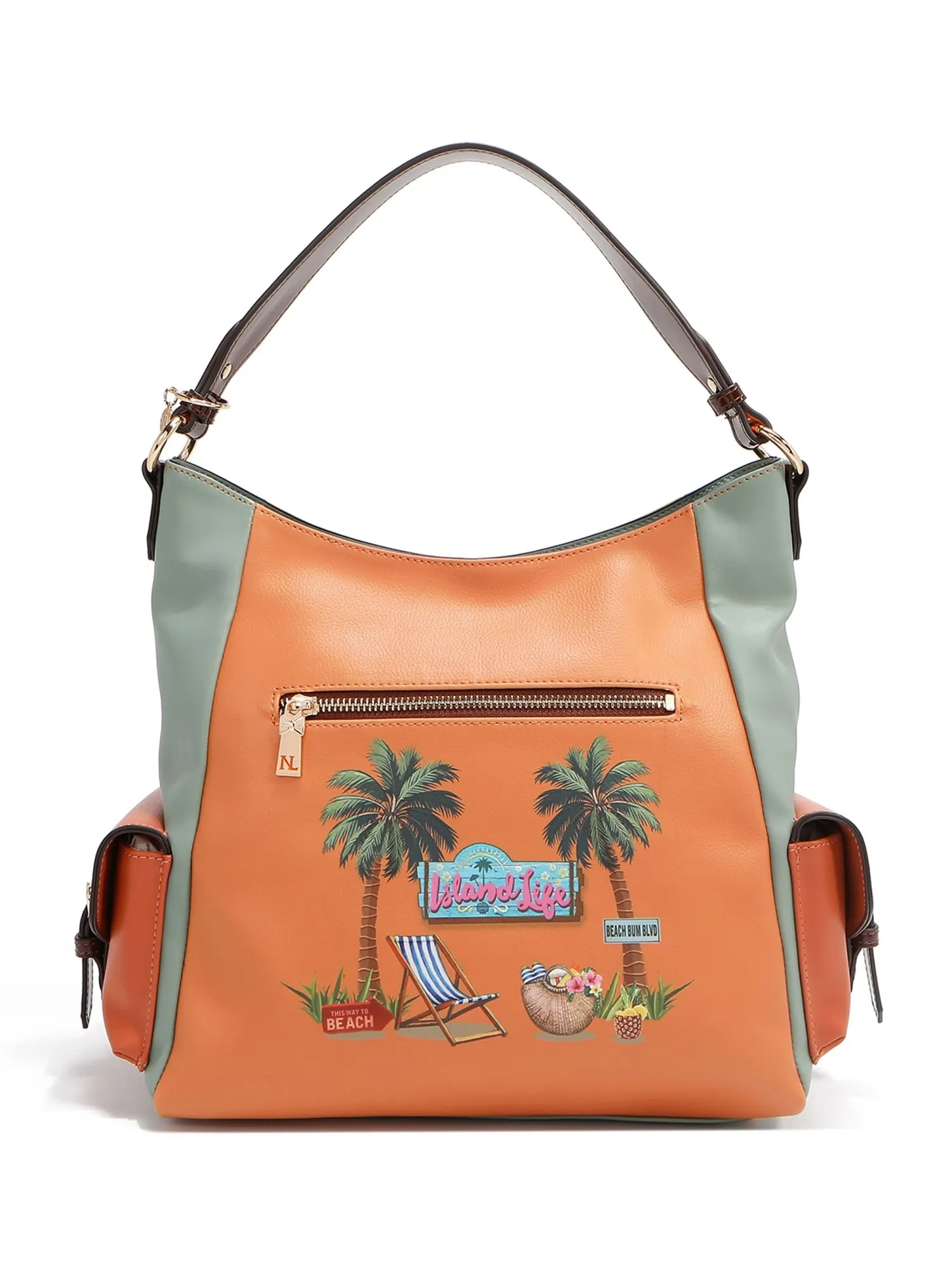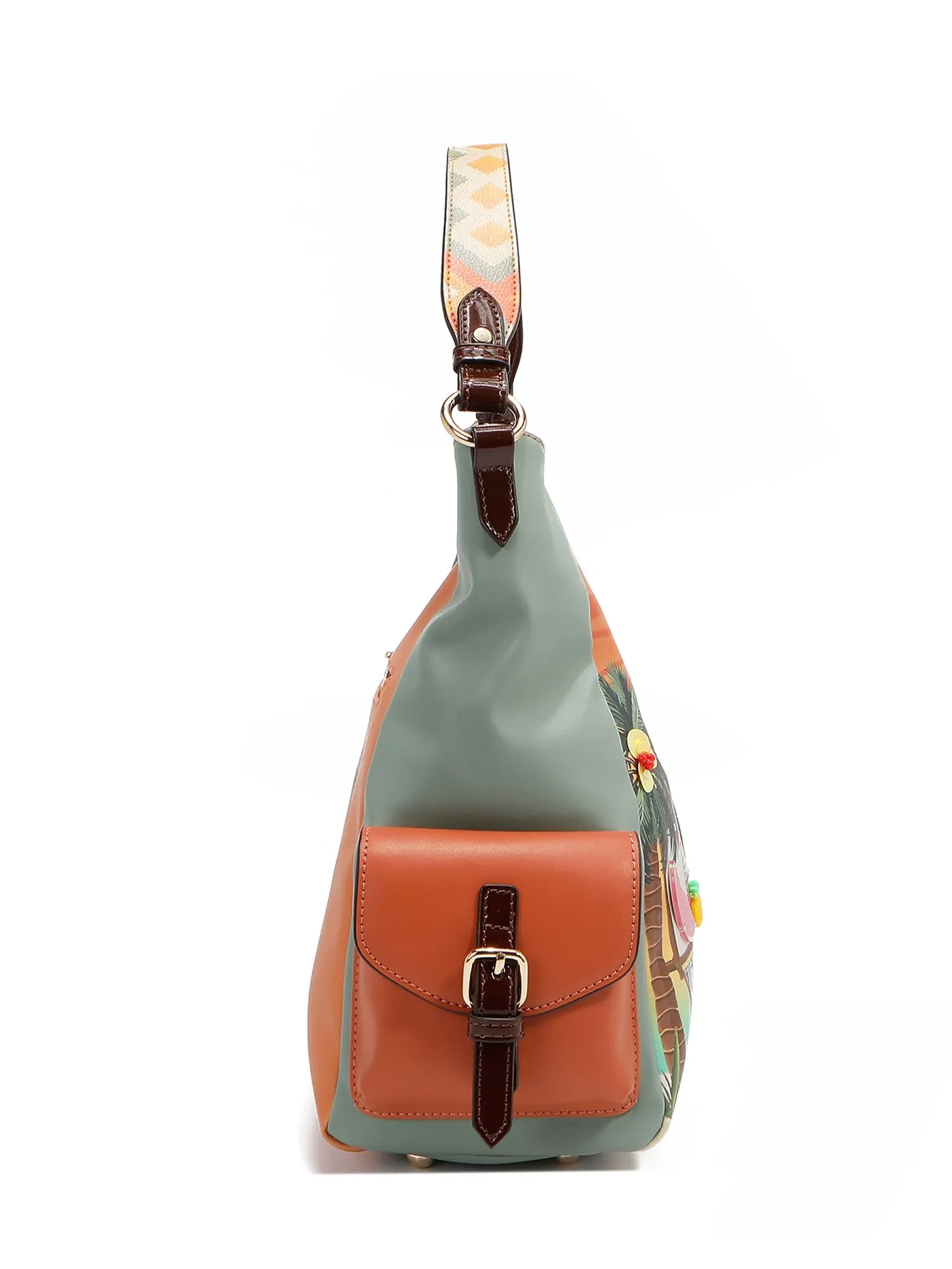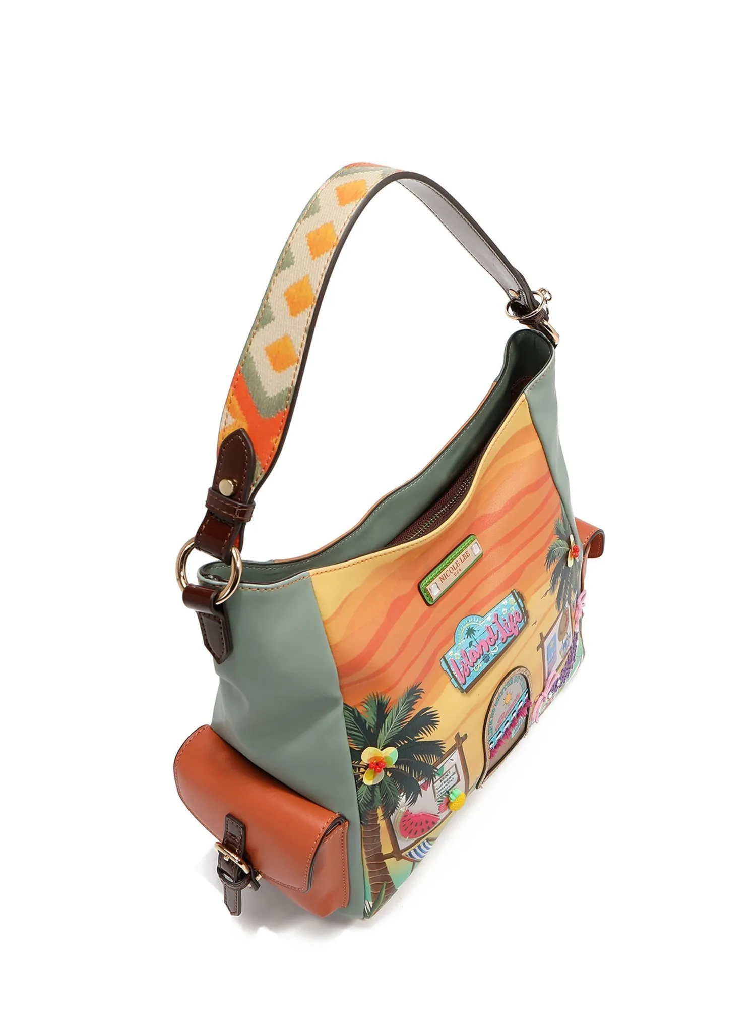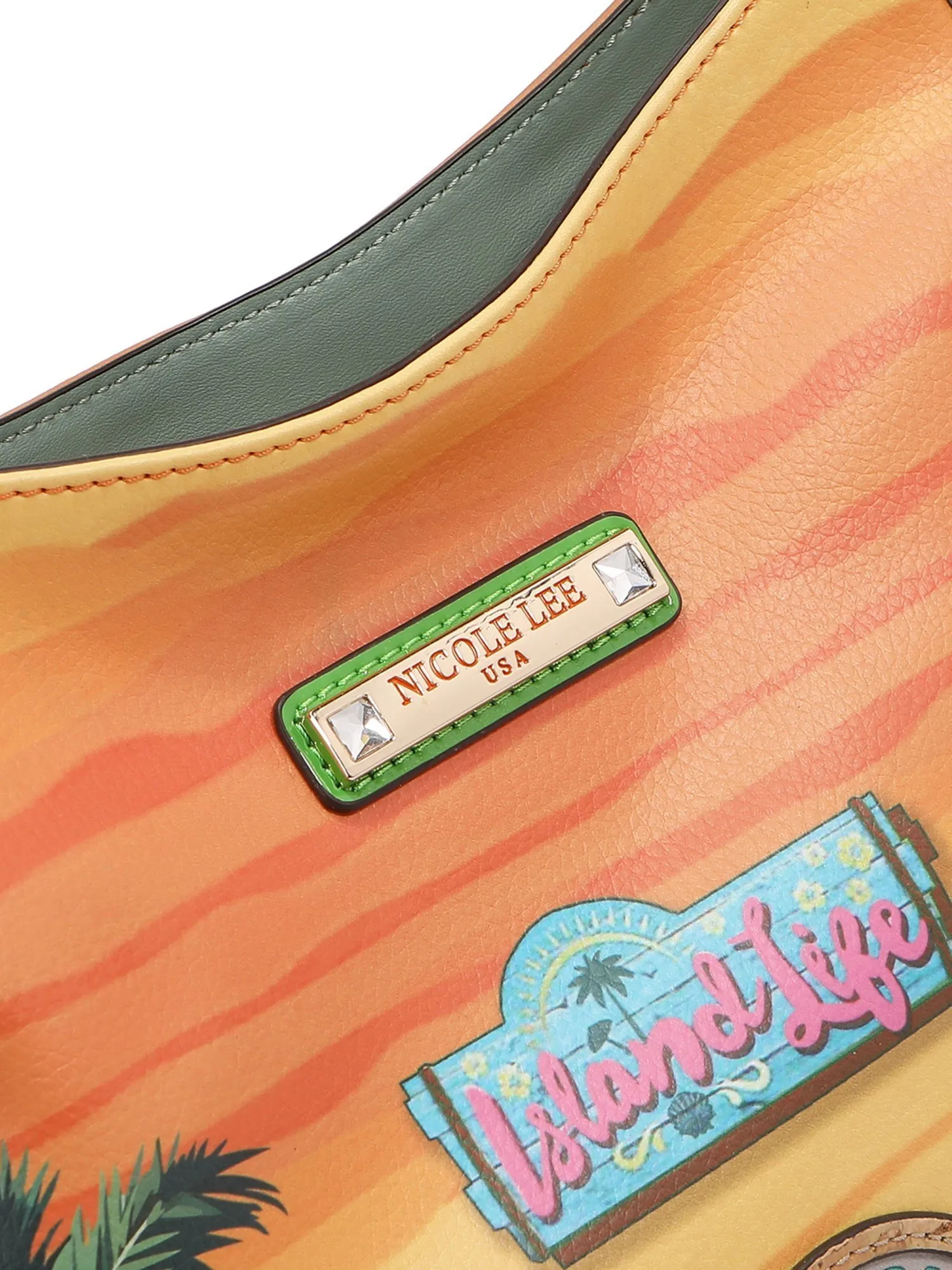 Модная сумка шоппер большая и вместительная, идеально скроена для удобного использования. Она сочетает в себе практичность и утонченную элегантность. Сумка изготовлена из мягкой и качественной экокожи. Большое количество деталей в дизайне поразит вас и создаст отличное настроение. Эксклюзивный принт дополняют различные объёмные украшения: фигурки в виде фруктов, пайетки и бисер на пальмах, 3д окно с объёмной рамой и бахромой, плетеный гамак украшен пайетками и шнурками, всё это хочется рассматривать и мечтать о предстоящем отпуске.