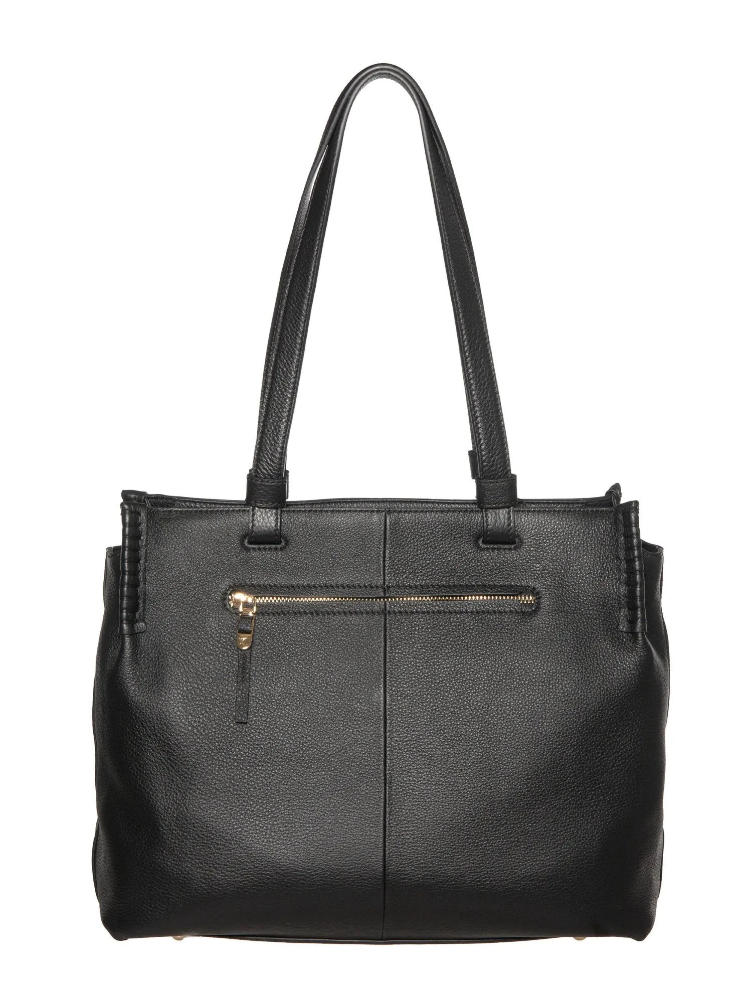 Сзади сумки есть карман на молнии, где вы можете хранить важные мелочи или телефон. Спереди сумку украшает элегантный металлический логотип, который придает ей дополнительный шарм. Основное отделение закрывается на молнию, внутри одно просторное отделение, пара открытых карманов и карман на молнии. Это позволяет вам организовать свои вещи легко и удобно. Шоппер отлично подойдет для повседневного использования, для работы и путешествий. В неё вмещается формат А4 и ноутбук диагональю 15’’. Металлические ножки на дне защитят сумку от загрязнений.