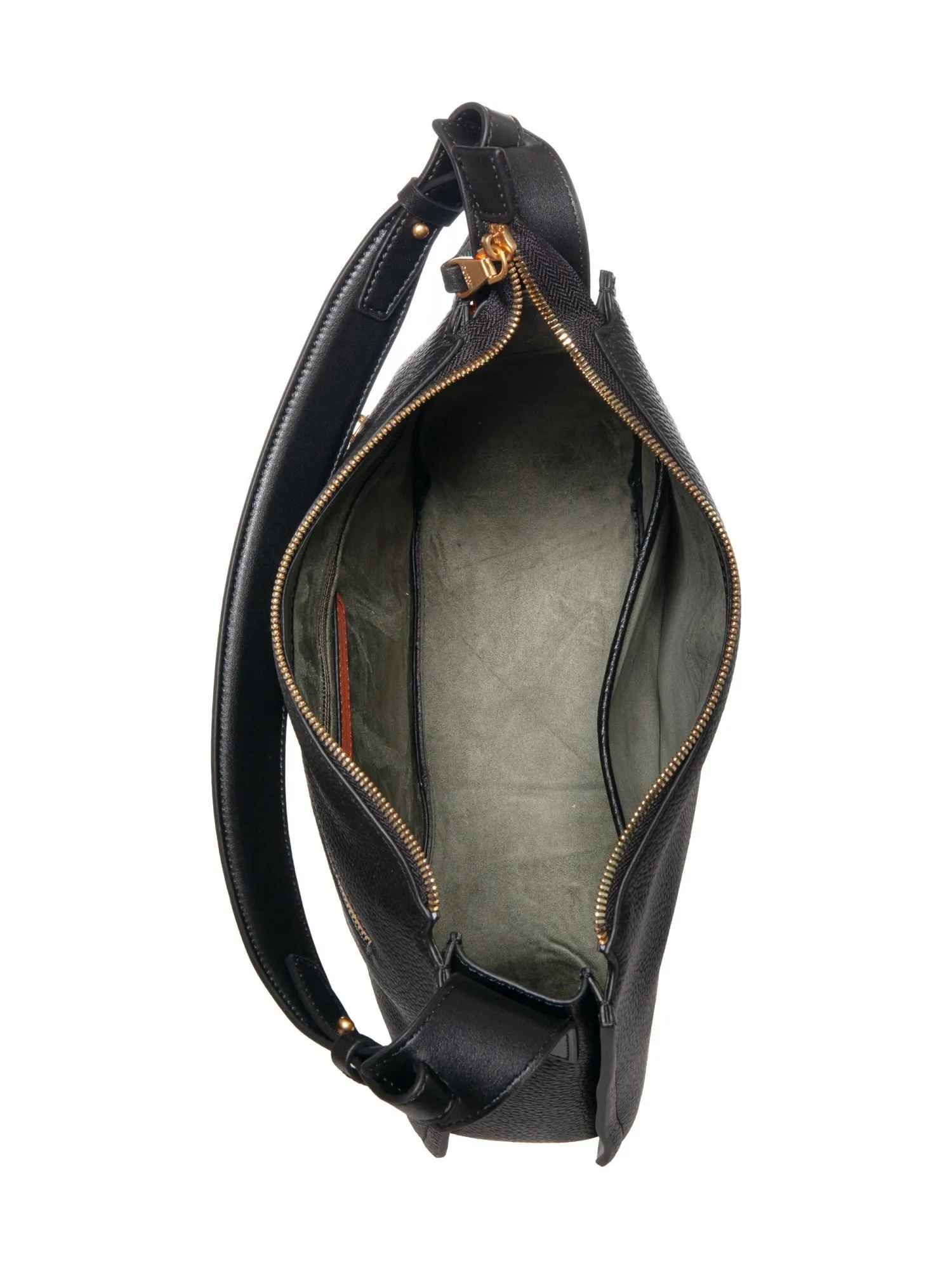 Основное отделение на молнии, внутри открытый карман и карман на молнии. На задней стороне сумки вместительный карман для телефона. Короткая ручка отлично держится на плече, а длинный широкий ремень позволяет носить сумку как через плечо, кросс-боди, обеспечивая максимальный комфорт и свободу движений. Приятная на ощупь подкладка из велюра красивого зеленого оттенка добавляет шика.