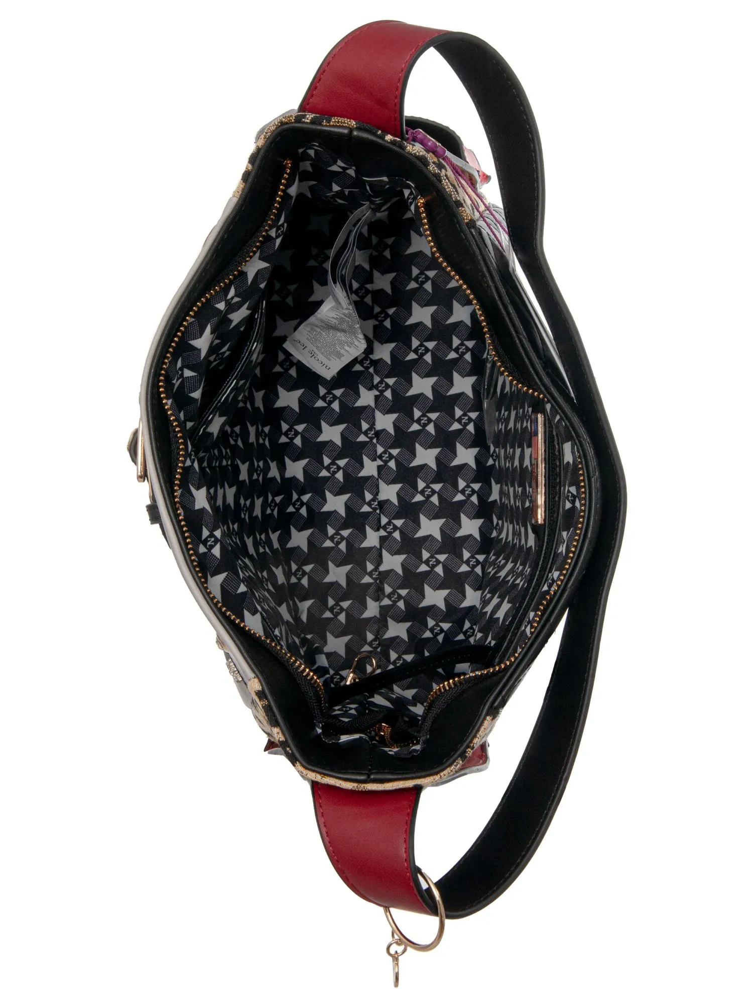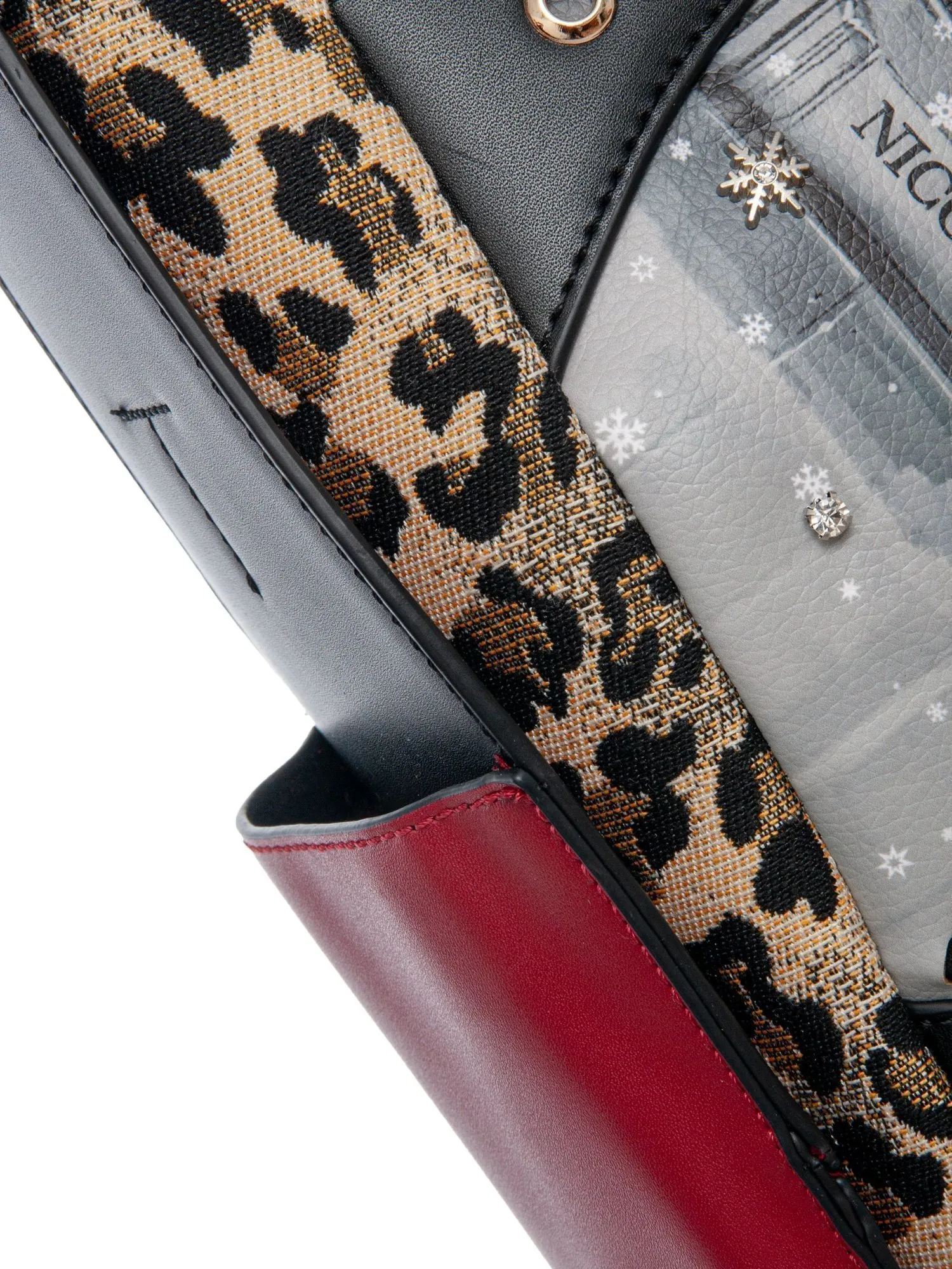 Шикарная сумка большого размера. Модель украшена фирменным принтом, бисером, стразами и ажурными снежинками создает сложный и притягательный дизайн, а декоративная цепочка с оплеткой, обрамляющая углы, добавляет нотку богемной роскоши. Задняя сторона сумки выполнена с крупной стежкой из мягкой черной экокожи и дополнена вместительным карманом на молнии. Удобный цельнокройный ремень на плечо обеспечивает комфорт при ношении и сохраняет форму аксессуара. На ремне расположены акцентные открытые боковые карманы для мелочей. Внутри основного отделения карман на молнии для ценных вещей, два открытых кармана для аксессуаров и подвеска для ключей. Сумка вмещает листы формата А4, делая её идеальной для работы, прогулок или путешествий. Nicole Lee MODA SNOWFLAKE — для тех, кто ценит магию в деталях и не готов жертвовать функциональностью.