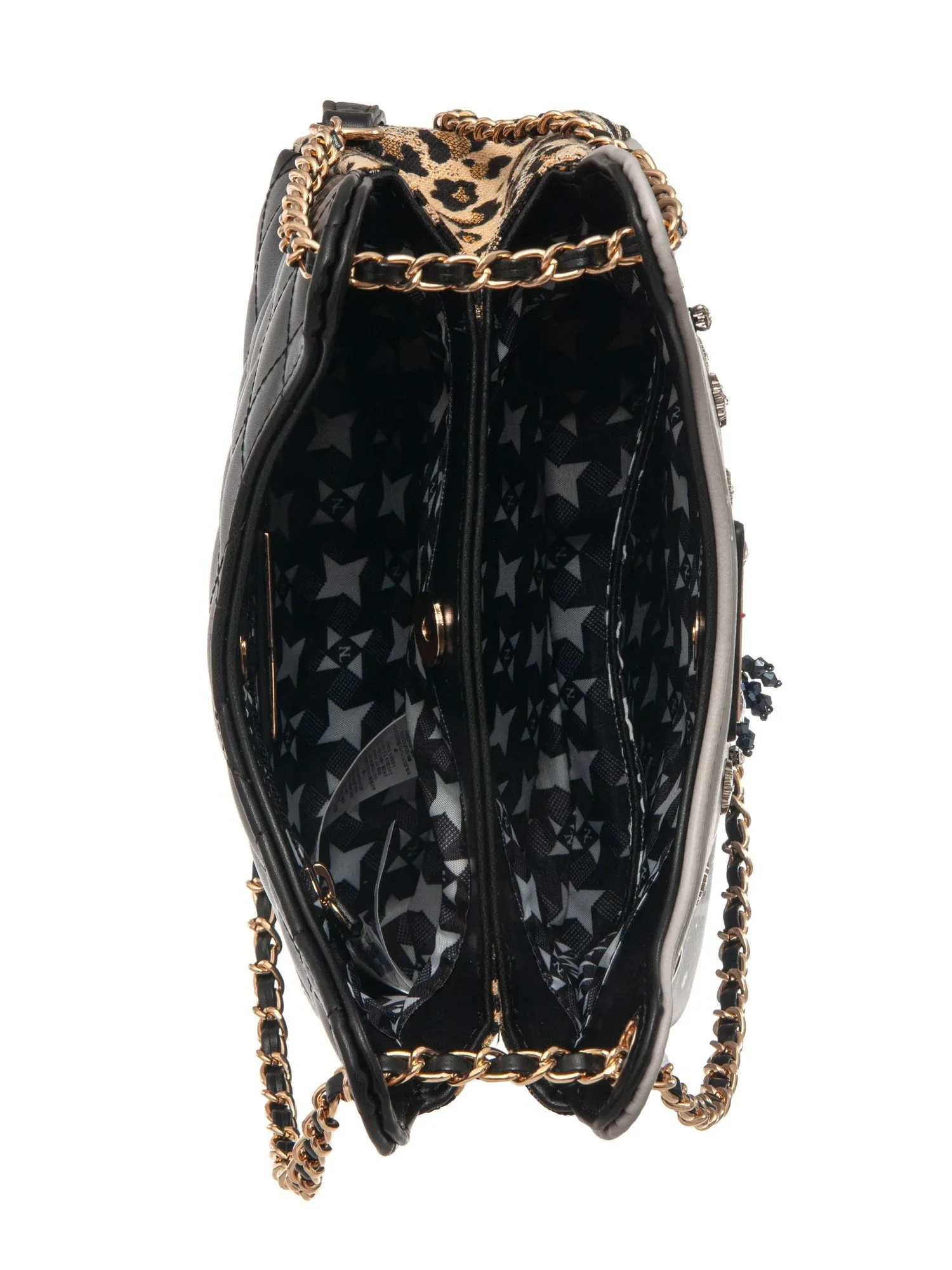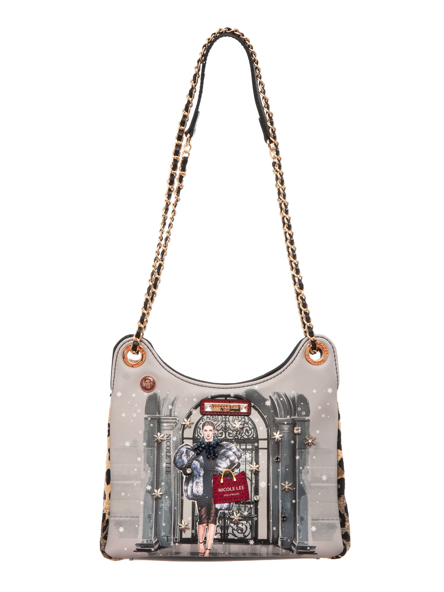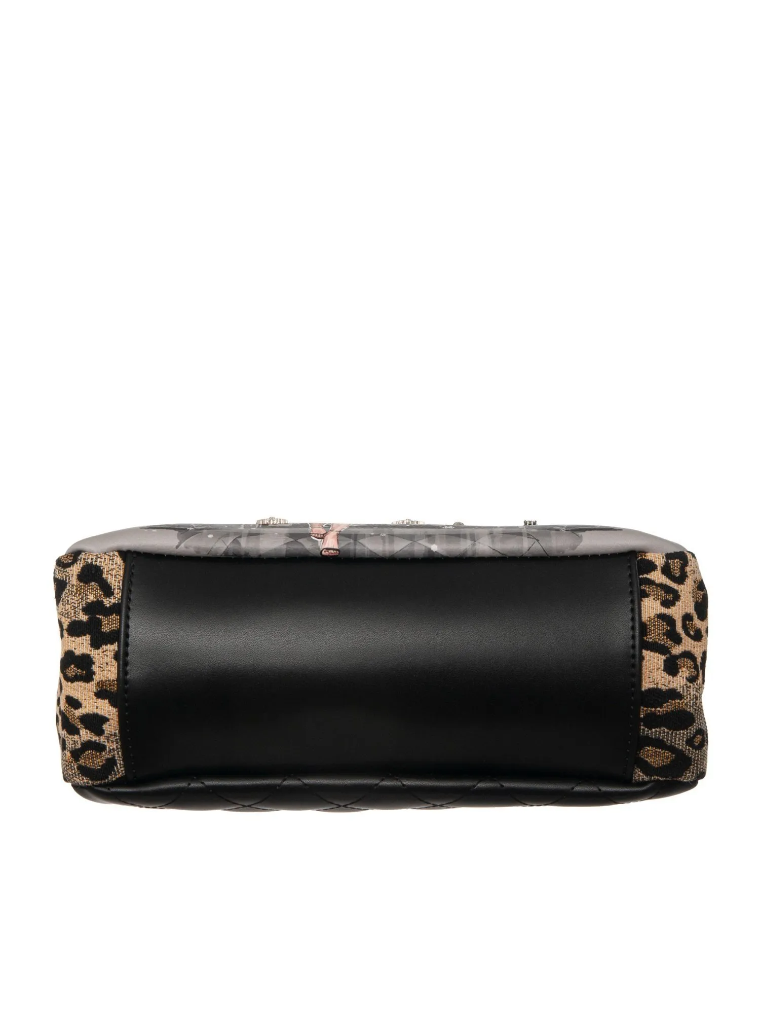 Изысканная модель среднего размера, где каждая деталь становится воплощением магии и роскоши. Переднюю часть сумки украшает фирменный принт коллекции, объёмная сумка-нашивка с бусинами, сверкающими стразами и ажурными снежинками, создающими сложный и притягательный дизайн. Боковые вставки из плотного текстиля леопардовой расцветки добавляют дерзости, а задняя сторона выполнена с крупной стежкой из мягкой черной экокожи, подчеркивая утонченность силуэта. Функциональность сочетается с элегантностью: двойная цепочка с оплеткой легко трансформируется — носите сумку на плече как классический аксессуар или вытяните один ремень для стильного варианта кросс-боди. Внутри два независимых отделения на магнитных кнопках. В первом отделении открытый карман для мелочей, во втором — надежный карман на молнии для ценных предметов.