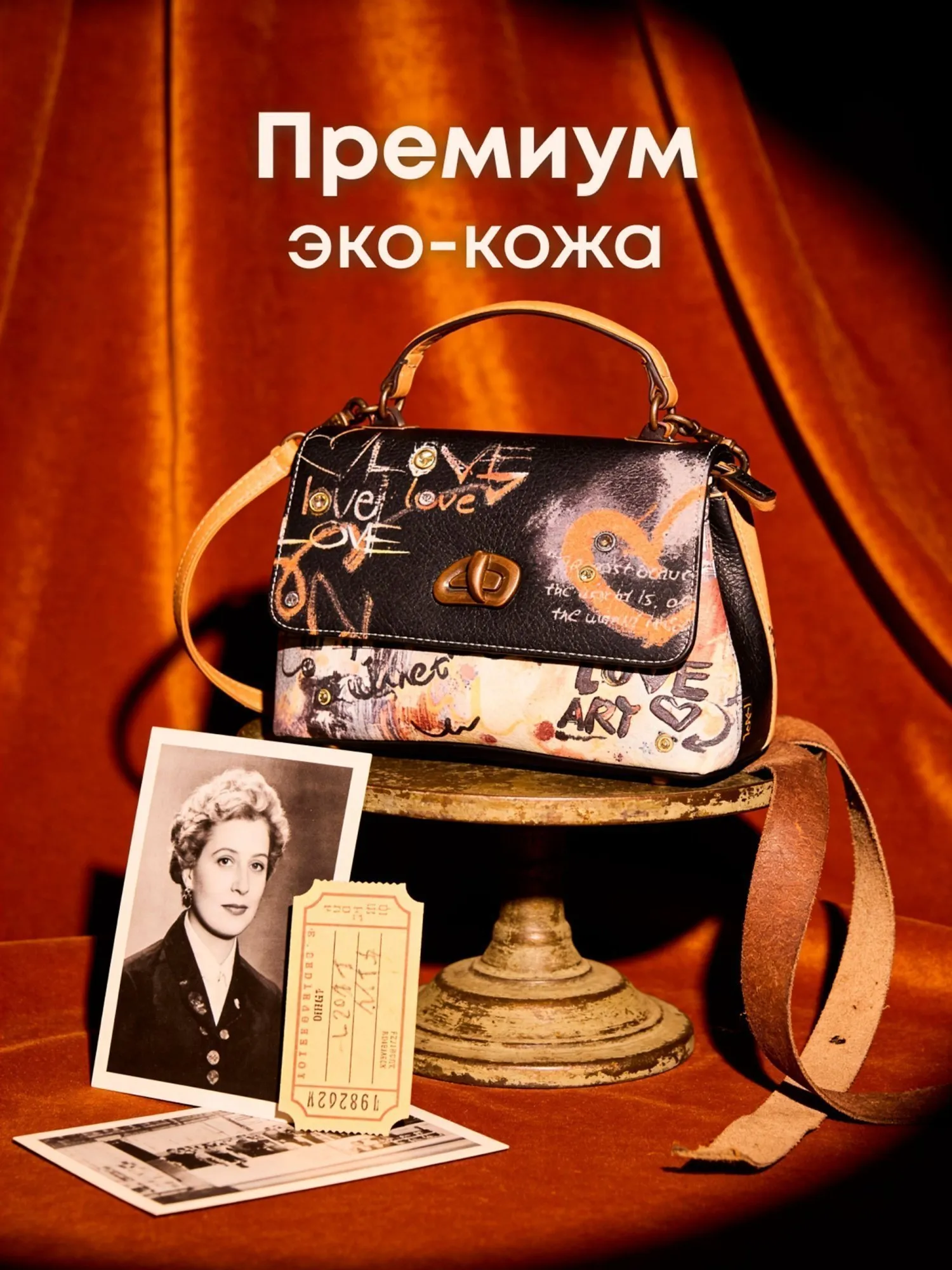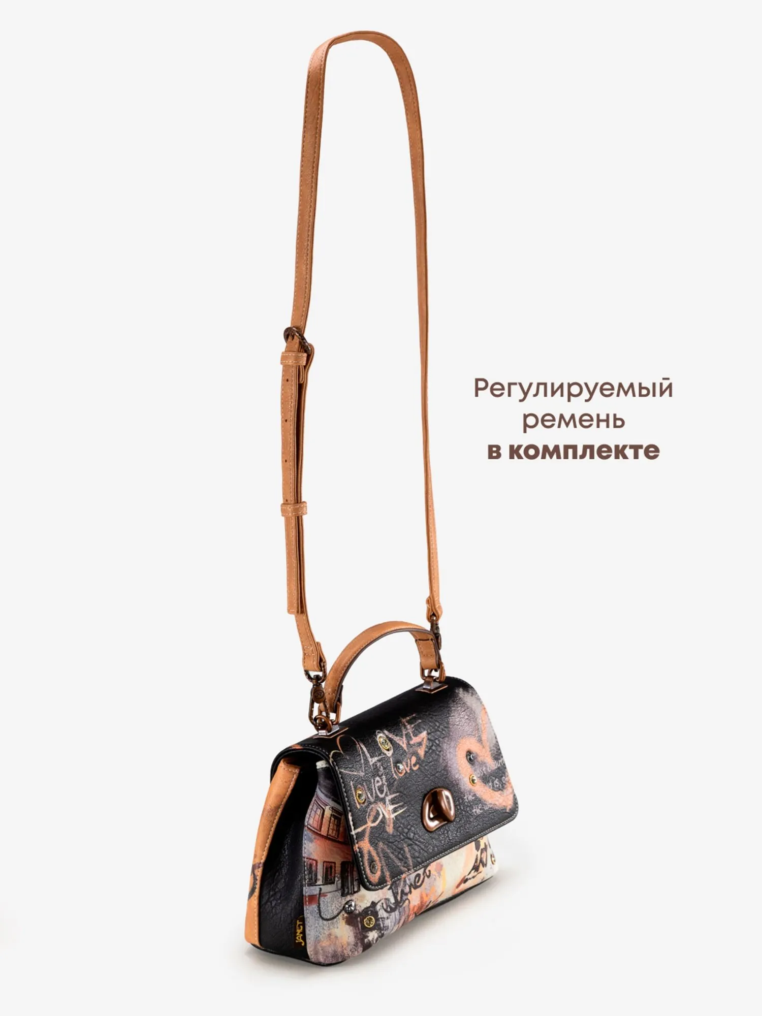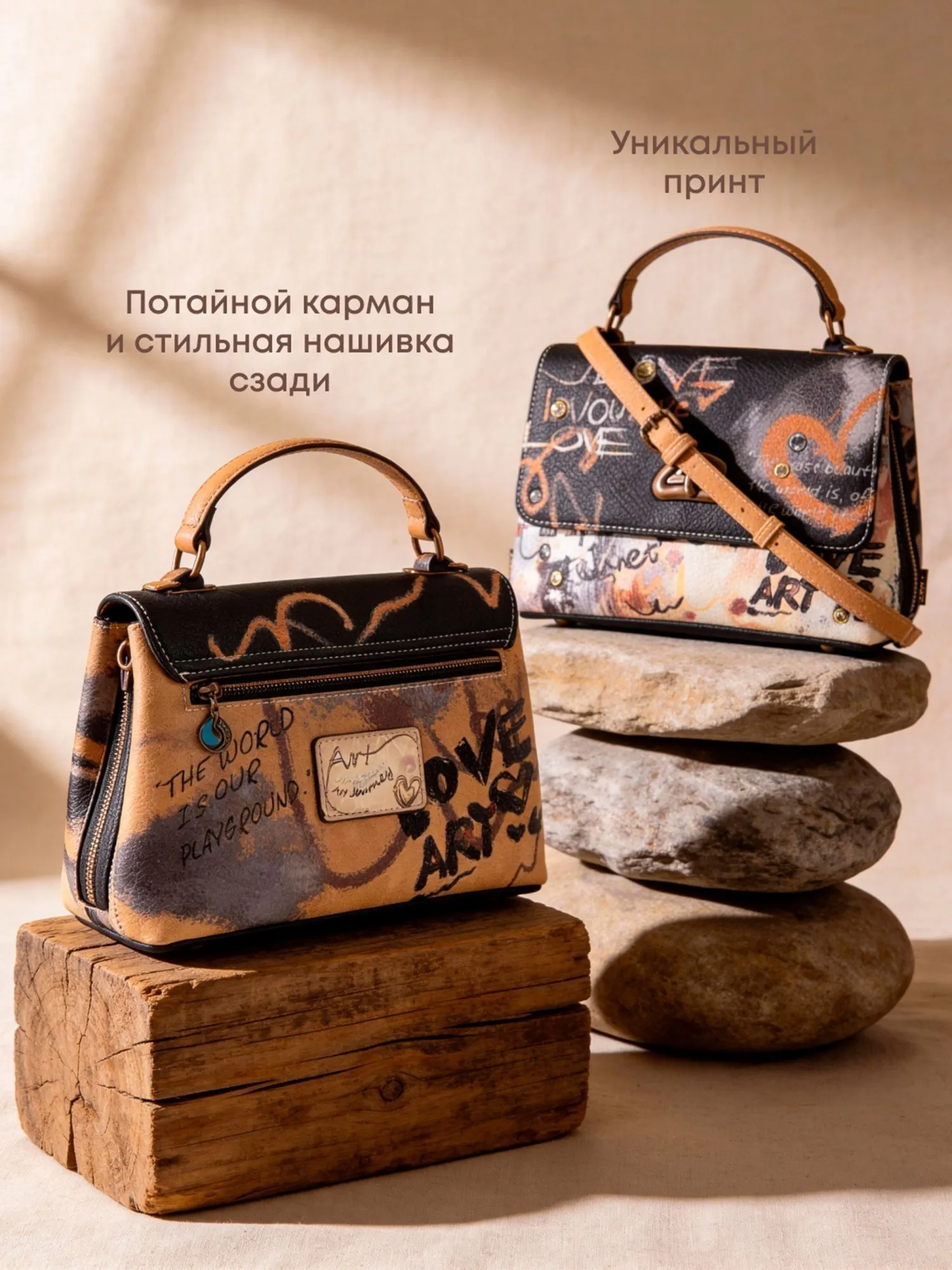 Изысканная женская сумка через плечо среднего размера, созданная для ценительниц искусства и функциональности! Модель выполнена в благородной палитре черного, бежевого и коричневых оттенков, украшенная замысловатыми спиралями, словно нанесенными кистью художника. Сумка декорирована изысканными клепками со стразами, которые добавляют ноту роскоши. Открывается изящным клапаном с замком в виде капли, под которым скрывается основное отделение на молнии. Внутри вас ждет продуманная организация: центральный карман на молнии разделяет пространство пополам, а вместительный открытый карман и карман на молнии помогут идеально организовать ваши вещи. На задней стороне расположен удобный карман на молнии для телефона или мелочей. Короткая ручка и длинный регулируемый ремень на карабинах позволяют носить сумку как в руках, так и в стиле кросс-боди, подстраиваясь под ваш образ и настроение. Идеальный аксессуар для города, встреч с друзьями или вечерних выходов — он подчеркнет ваш вкус и любовь к искусству.