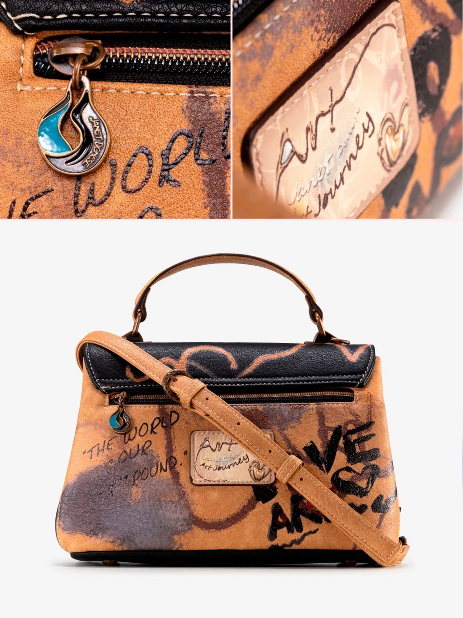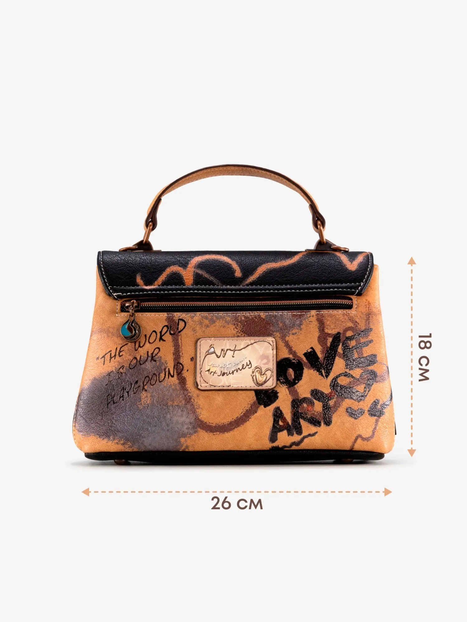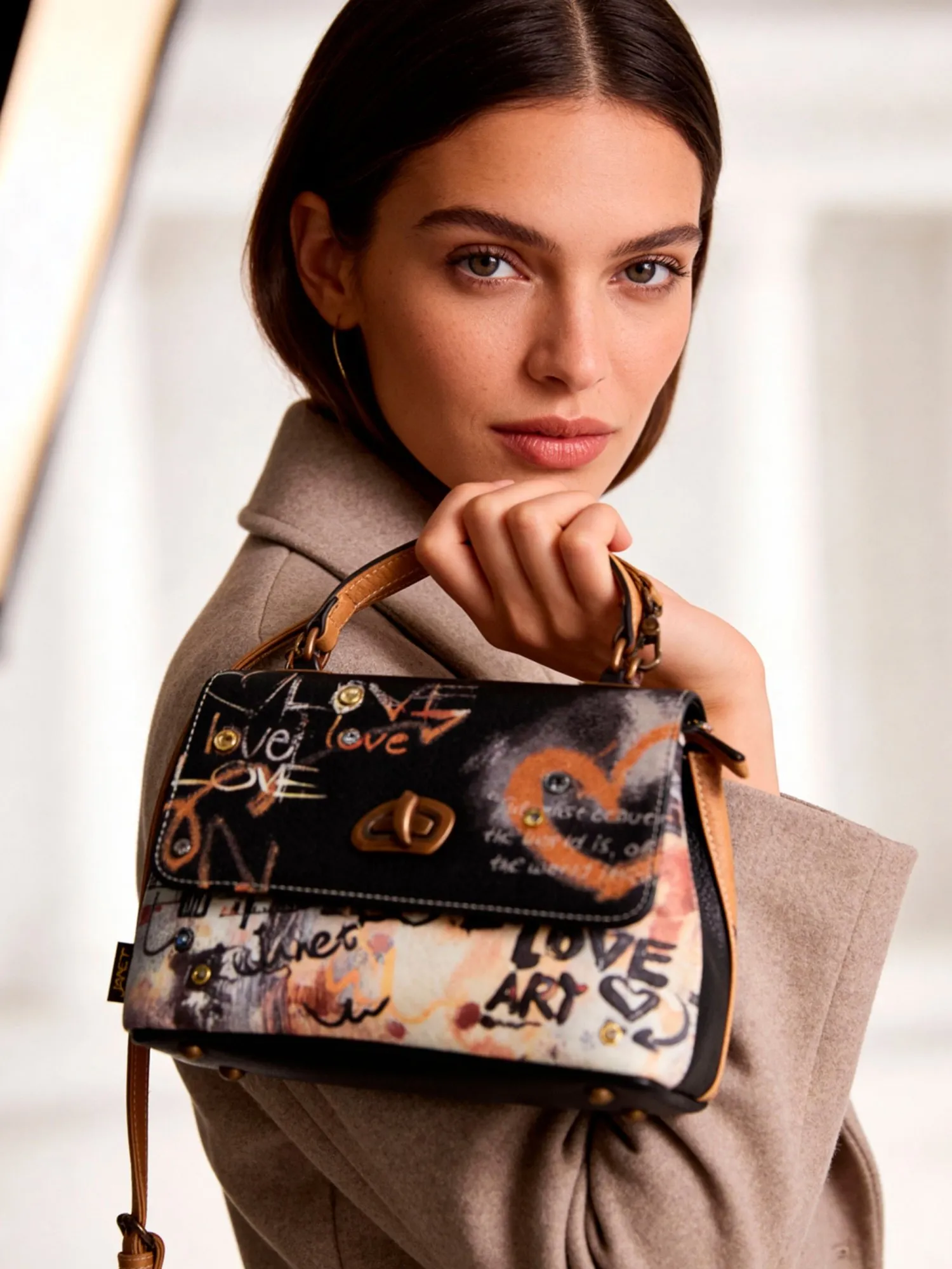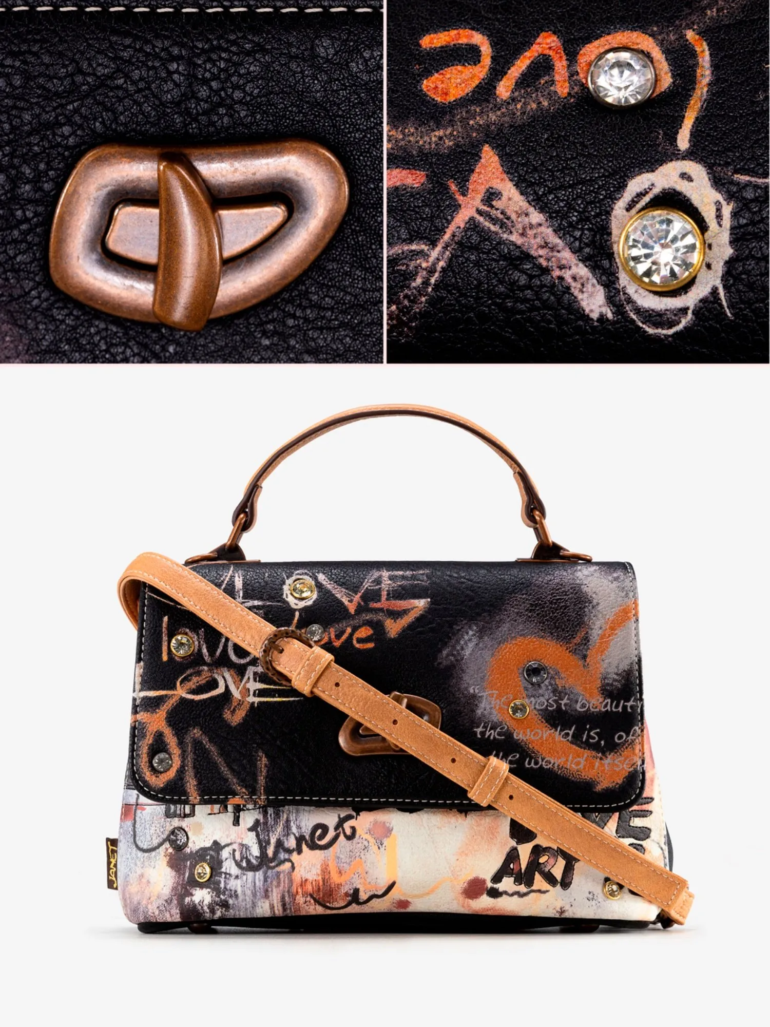 Изысканная женская сумка через плечо среднего размера, созданная для ценительниц искусства и функциональности! Модель выполнена в благородной палитре черного, бежевого и коричневых оттенков, украшенная замысловатыми спиралями, словно нанесенными кистью художника. Сумка декорирована изысканными клепками со стразами, которые добавляют ноту роскоши. Открывается изящным клапаном с замком в виде капли, под которым скрывается основное отделение на молнии. Внутри вас ждет продуманная организация: центральный карман на молнии разделяет пространство пополам, а вместительный открытый карман и карман на молнии помогут идеально организовать ваши вещи. На задней стороне расположен удобный карман на молнии для телефона или мелочей. Короткая ручка и длинный регулируемый ремень на карабинах позволяют носить сумку как в руках, так и в стиле кросс-боди, подстраиваясь под ваш образ и настроение. Идеальный аксессуар для города, встреч с друзьями или вечерних выходов — он подчеркнет ваш вкус и любовь к искусству.