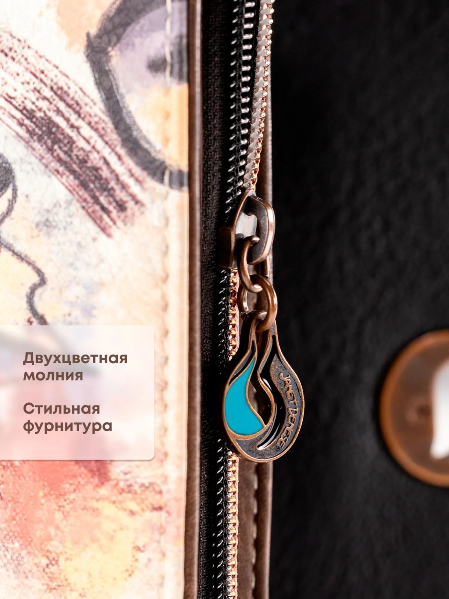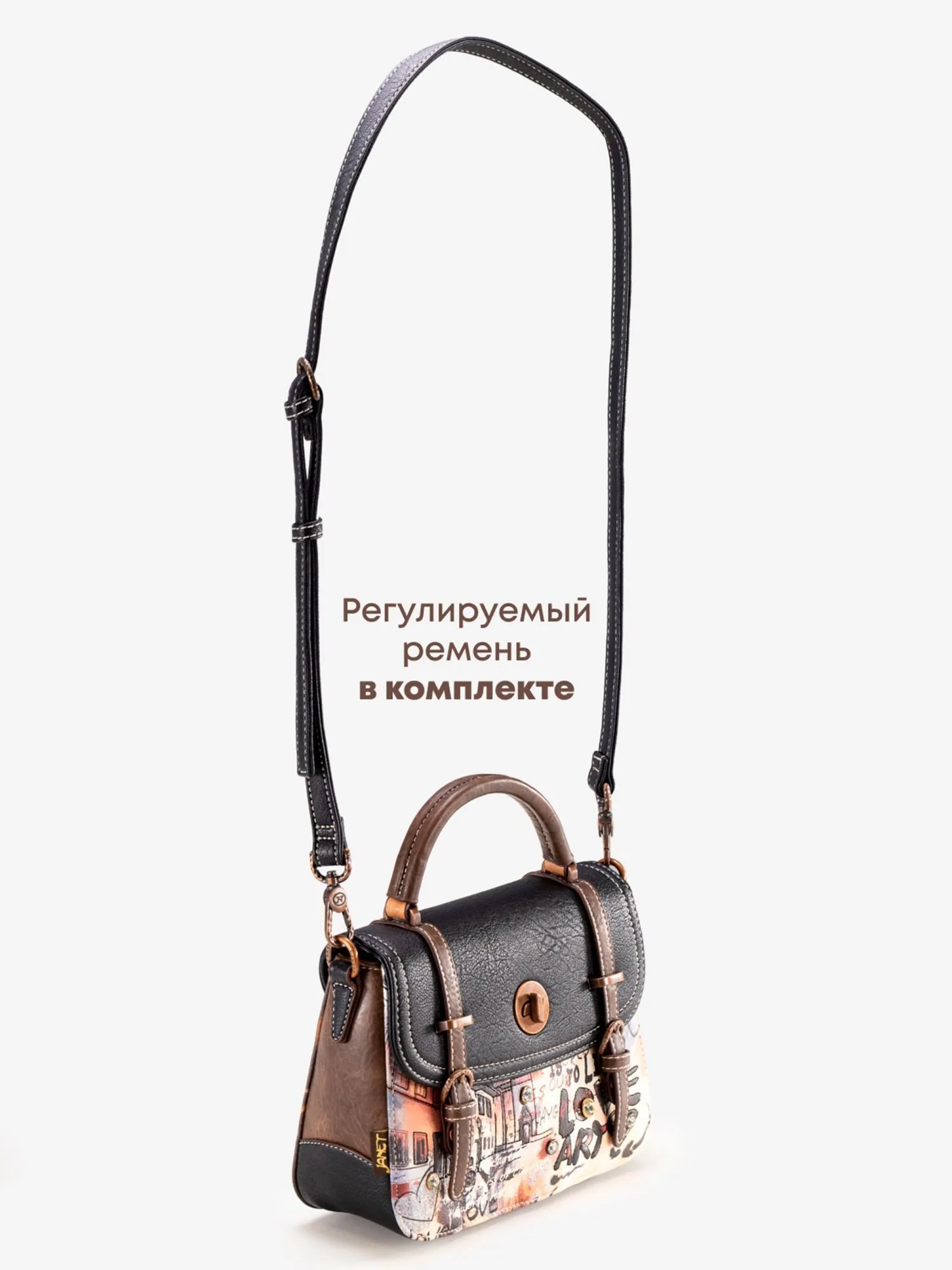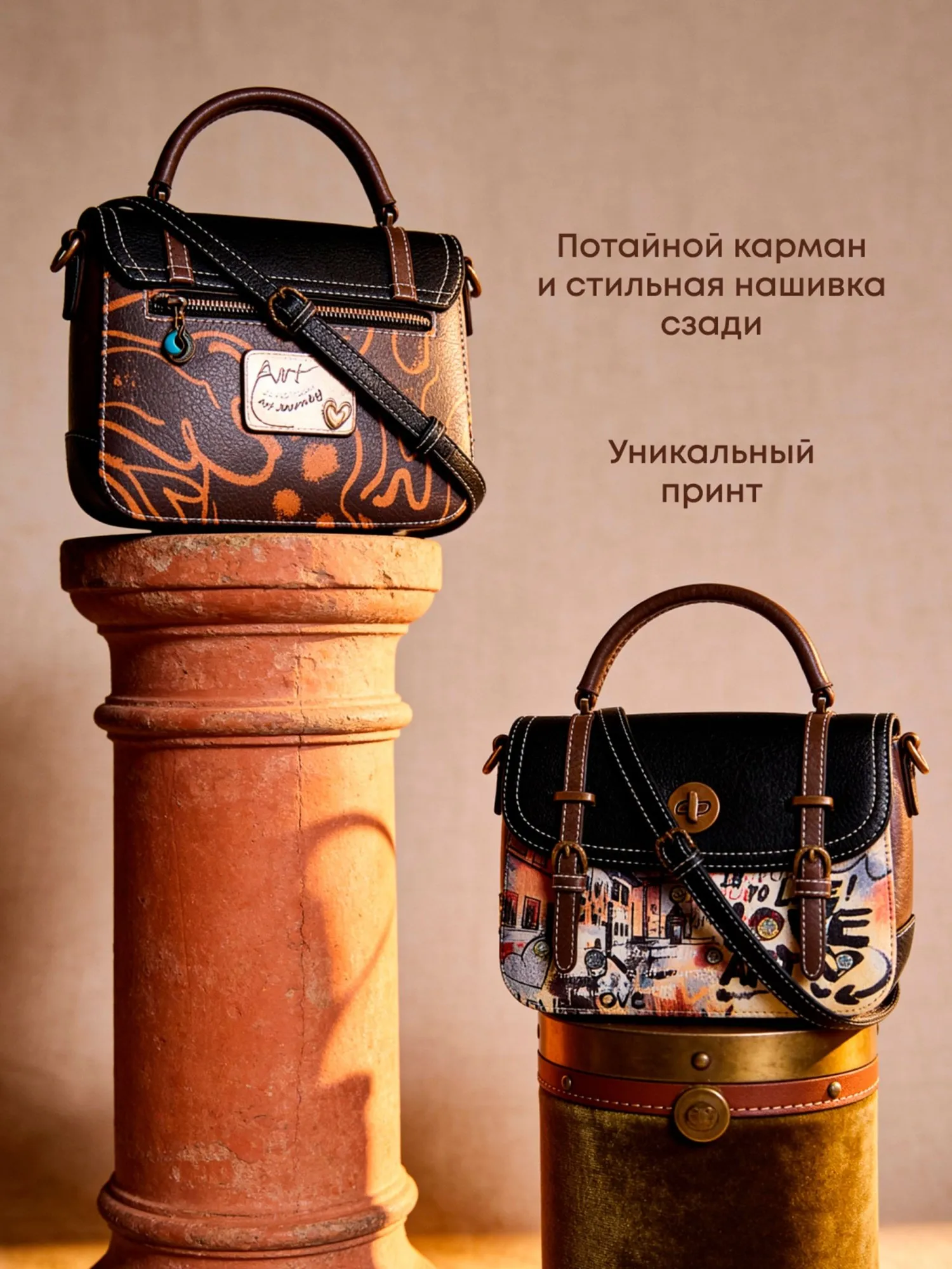 Изысканная женская сумка через плечо небольшого размера, созданная для ценительниц искусства и функциональности! Модель выполнена в благородной палитре черного, бежевого и коричневых оттенков, украшенная замысловатыми спиралями, словно нанесенными кистью художника. Сумка декорирована изысканными клепками со стразами, которые добавляют ноту роскоши. Открывается изящным клапаном с замком и магнитными клепками, под которым скрывается основное отделение на молнии. Внутри вместительный открытый карман и карман на молнии помогут идеально организовать ваши вещи. На задней стороне расположен удобный карман на молнии для телефона или мелочей. Короткая ручка и длинный регулируемый ремень на карабинах позволяют носить сумку как в руках, так и в стиле кросс-боди, подстраиваясь под ваш образ и настроение. Идеальный аксессуар для города, встреч с друзьями или вечерних выходов — он подчеркнет ваш вкус и любовь к искусству.