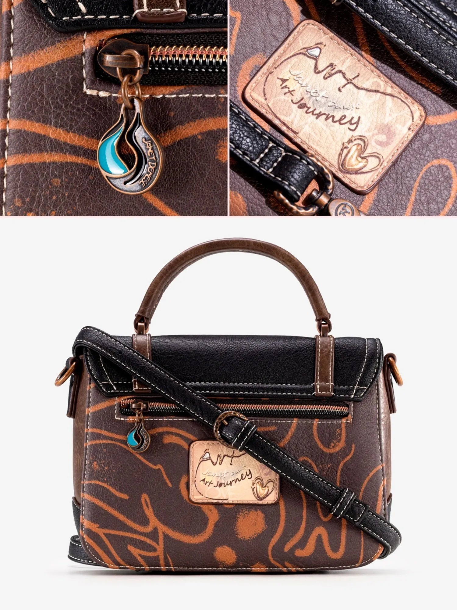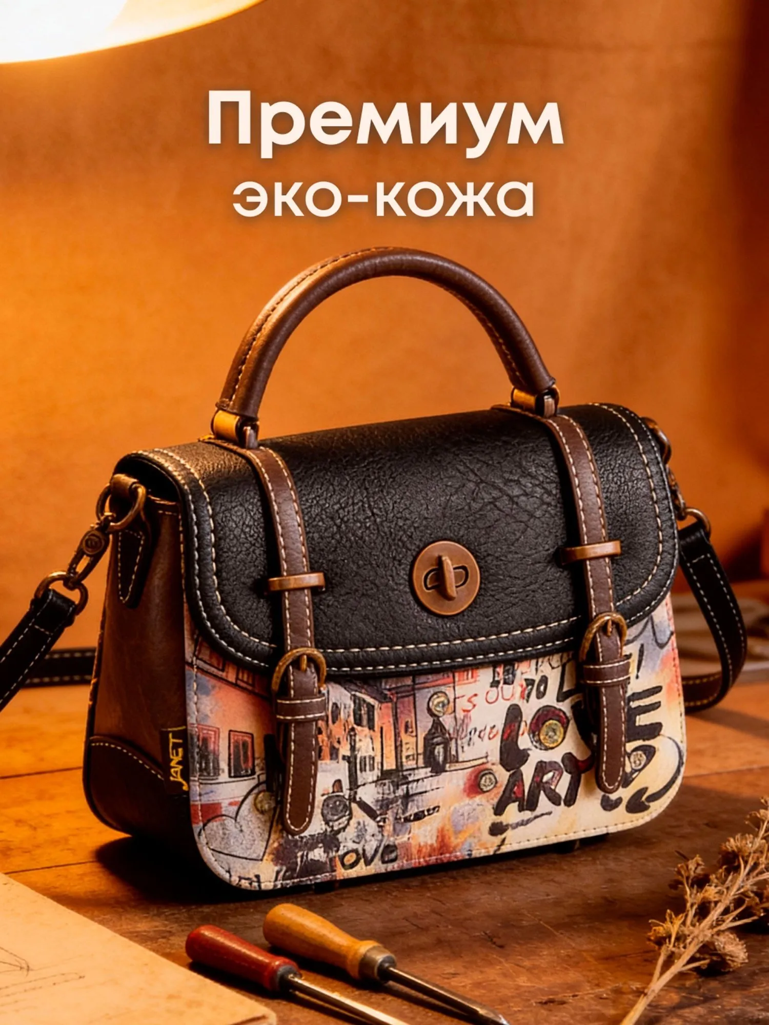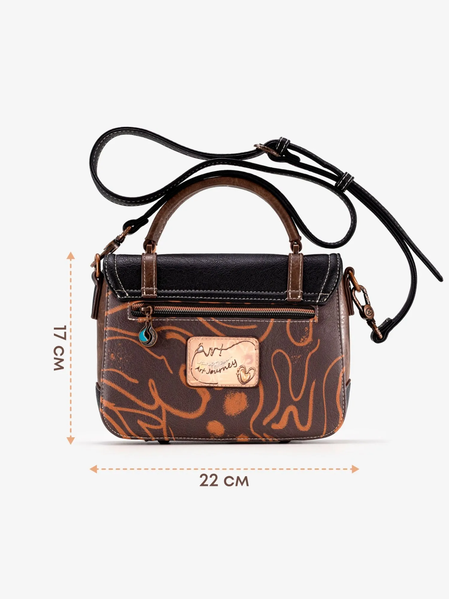Изысканная женская сумка через плечо небольшого размера, созданная для ценительниц искусства и функциональности! Модель выполнена в благородной палитре черного, бежевого и коричневых оттенков, украшенная замысловатыми спиралями, словно нанесенными кистью художника. Сумка декорирована изысканными клепками со стразами, которые добавляют ноту роскоши. Открывается изящным клапаном с замком и магнитными клепками, под которым скрывается основное отделение на молнии. Внутри вместительный открытый карман и карман на молнии помогут идеально организовать ваши вещи. На задней стороне расположен удобный карман на молнии для телефона или мелочей. Короткая ручка и длинный регулируемый ремень на карабинах позволяют носить сумку как в руках, так и в стиле кросс-боди, подстраиваясь под ваш образ и настроение. Идеальный аксессуар для города, встреч с друзьями или вечерних выходов — он подчеркнет ваш вкус и любовь к искусству.