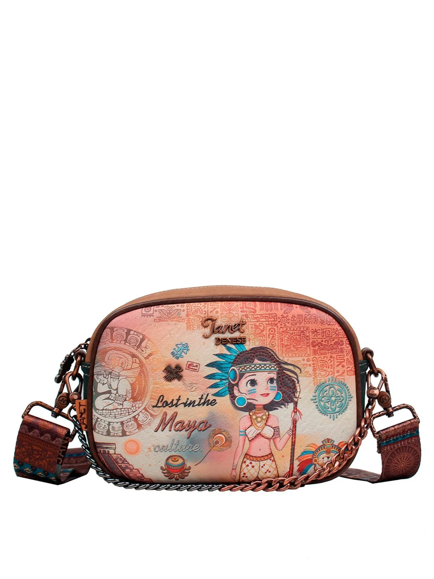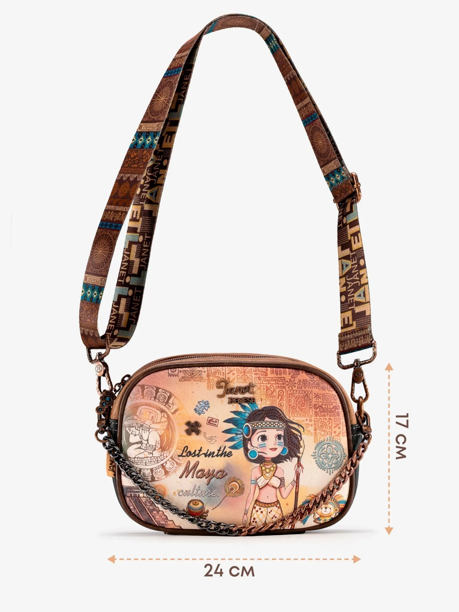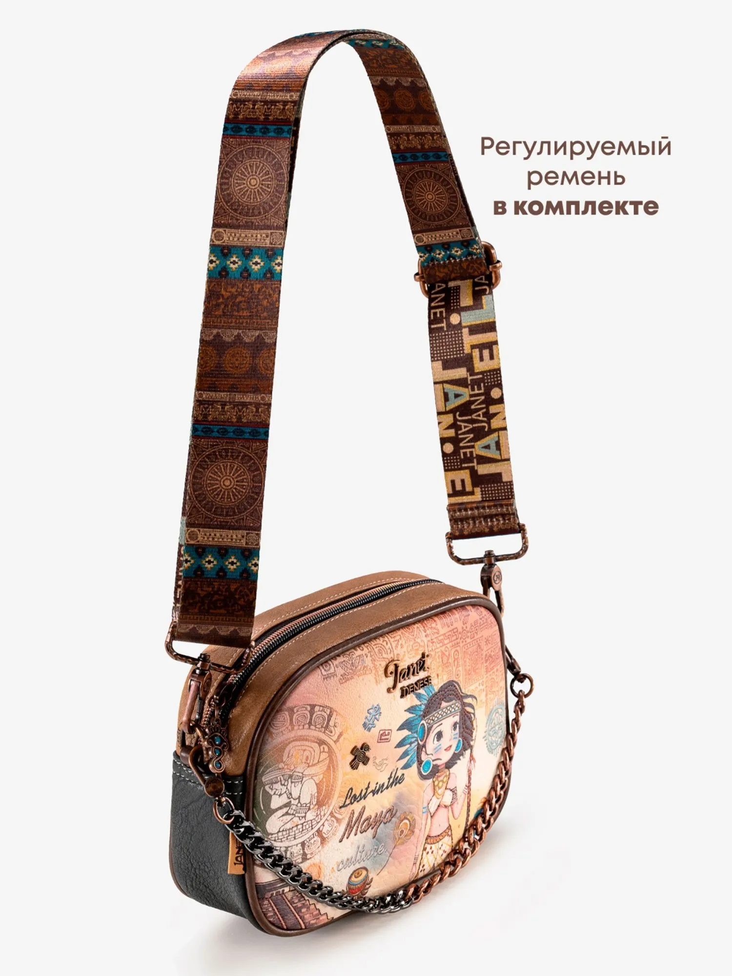 Окунитесь в мир тайн и легенд с этой сумкой кросс-боди из коллекции JANET MAYA! На передней части сумки вас встретит загадочный принт с символами майя и девочка Джанет в традиционном наряде этой древней цивилизации, дополненный металлической эмблемой священной птицы квезаль — символа свободы и красоты. Основное отделение на молнии скрывает просторное внутреннее пространство с большим открытым карманом и карманом на молнии для удобного хранения мелочей. На задней стороне расположен практичный карман на молнии и стильная нашивка с надписью Maya, подчеркивающая принадлежность к коллекции.