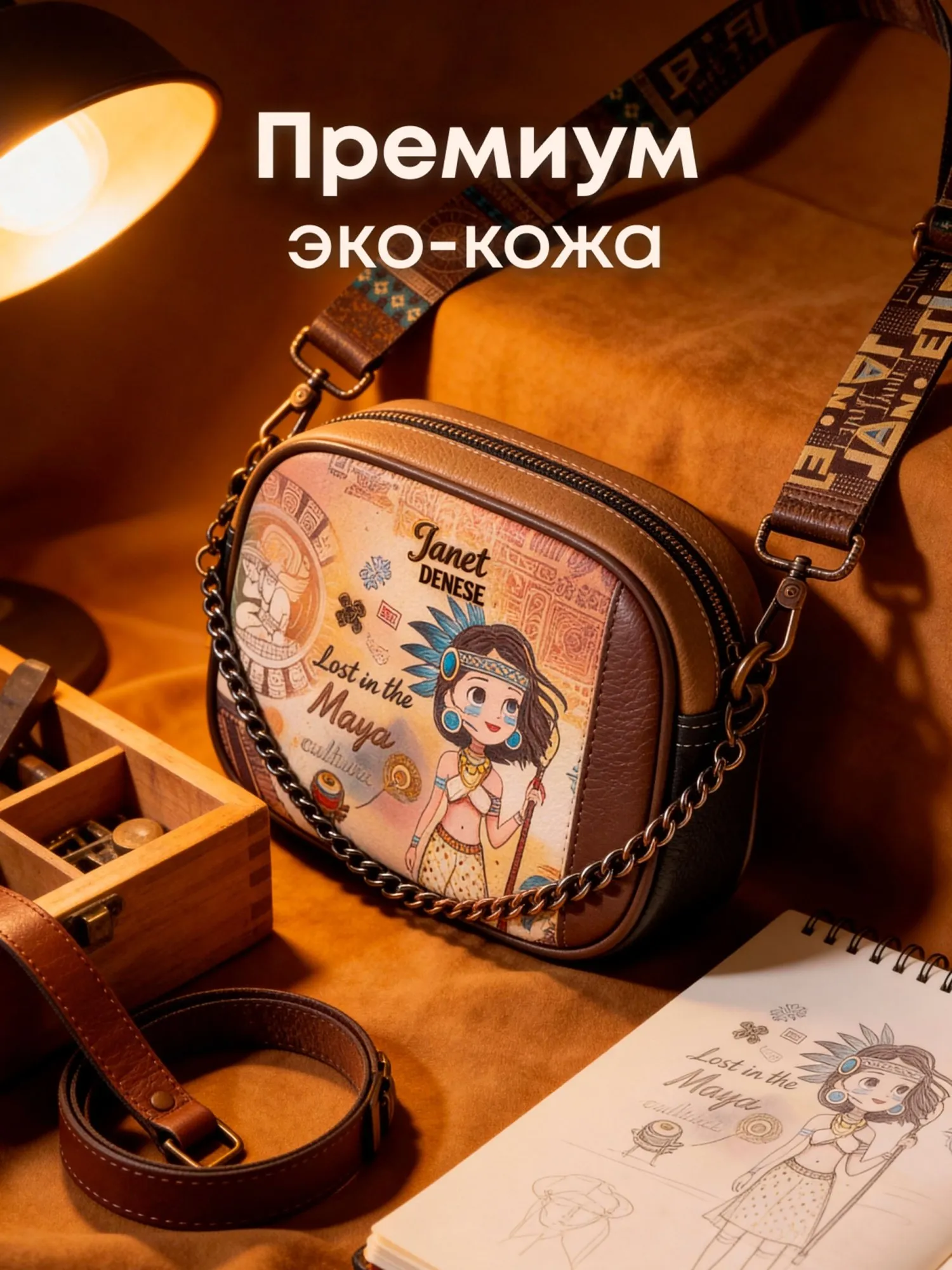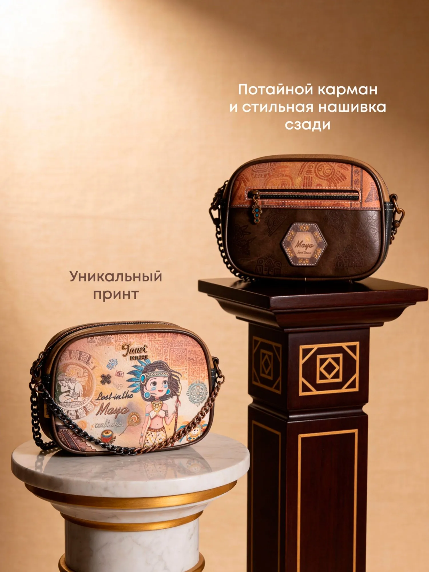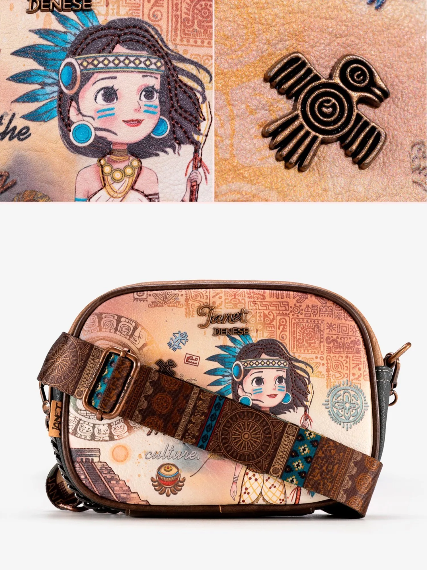 Окунитесь в мир тайн и легенд с этой сумкой кросс-боди из коллекции JANET MAYA! На передней части сумки вас встретит загадочный принт с символами майя и девочка Джанет в традиционном наряде этой древней цивилизации, дополненный металлической эмблемой священной птицы квезаль — символа свободы и красоты. Основное отделение на молнии скрывает просторное внутреннее пространство с большим открытым карманом и карманом на молнии для удобного хранения мелочей. На задней стороне расположен практичный карман на молнии и стильная нашивка с надписью Maya, подчеркивающая принадлежность к коллекции.