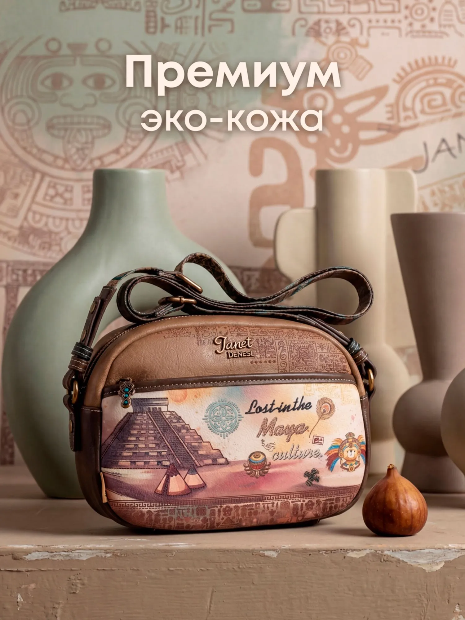 Уникальность сумки подчеркивает оригинальный принт с пирамидой Майя, искусная вышивка, металлическая птичка Квезаль — символ свободы и красоты — и бегунки с древней символикой, которые добавляют образу загадочности и шарма. Для тех, кто ценит историю, практичность и смелые акценты, эта сумка станет спутником в городских приключениях. Носите с собой JANET, чтобы завоевывать мир и наполнять повседневность красотой древних традиций.