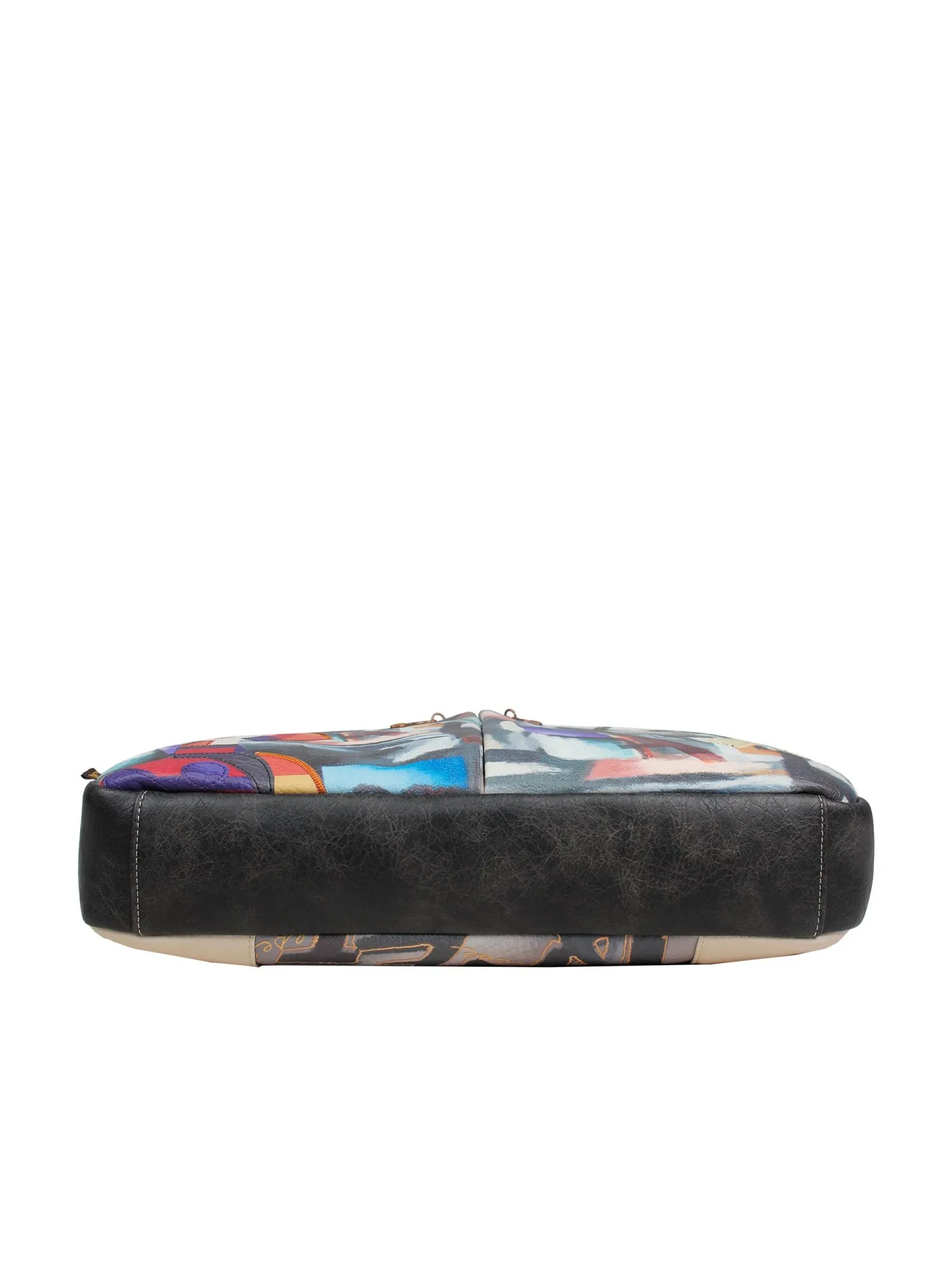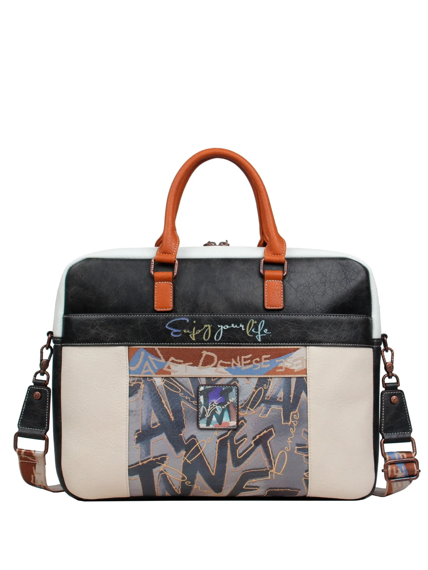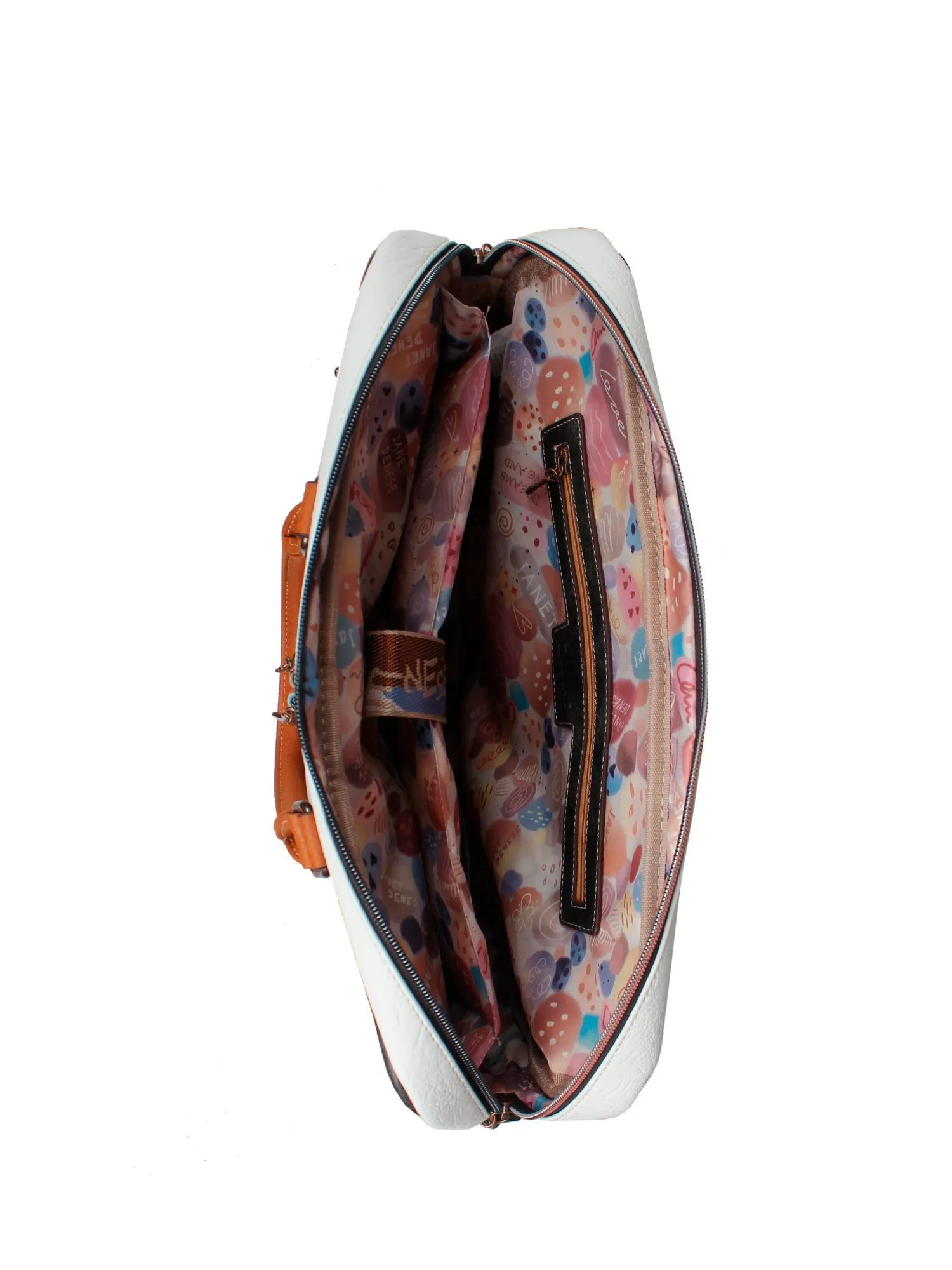 На передней стороне сумки расположены два вместительных кармана на молнии, а также скрытый карман для документов. Задняя сторона оснащена удобной багажной лентой для крепления на чемодан и дополнительным скрытым карманом на молнии. Внутреннее пространство сумки организовано безупречно: мягкий защитный отсек для ноутбука до 15.6" и открытый карман для планшета, аксессуаров или блокнота.