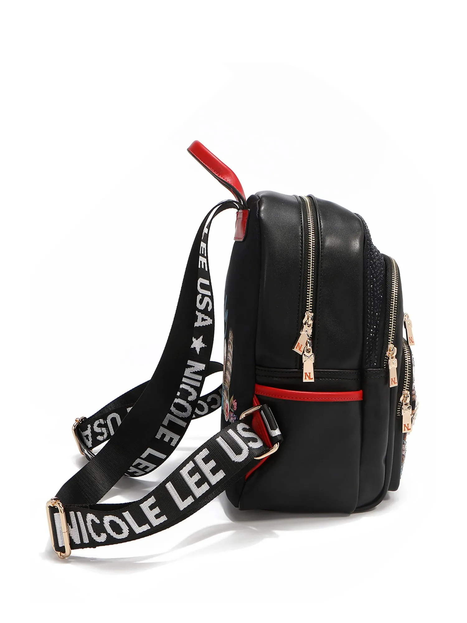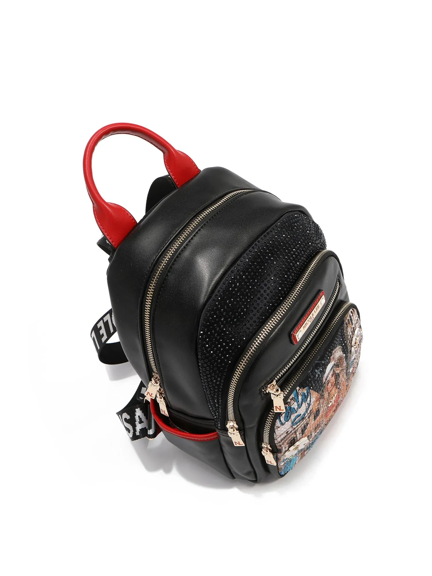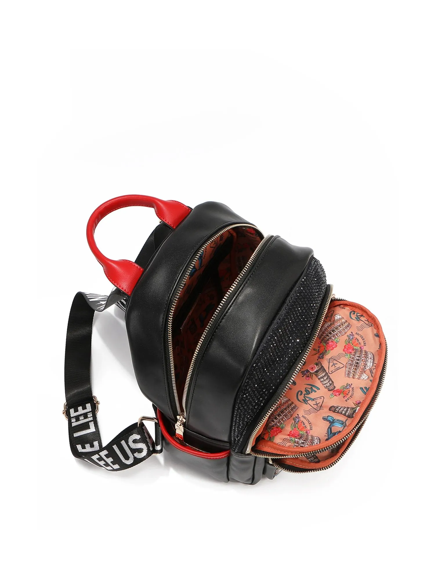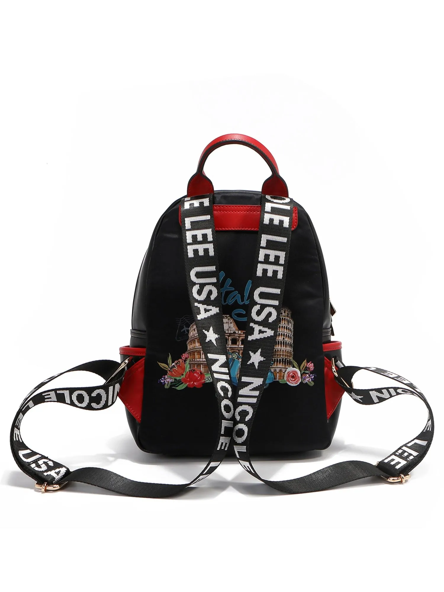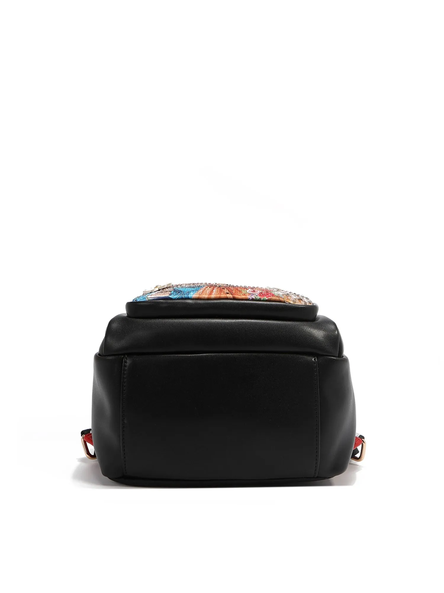 Два отделения закрываются на молнию, одно большое отделение, внутри которого – два открытых кармана и один на молнии. Отделение поменьше без внутренних карманов. Два внешних кармана на молниях разных размеров помогут разместить вещи в идеальном порядке, а также для дополнительного удобства есть два боковых открытых кармана. В рюкзак не помещается формат А4, но поместятся другие необходимые вещи: зонт, книга, большой кошелёк и т.п. Внешний карман и задняя часть рюкзака выполнена из высококачественного текстиля, а остальные части из экокожи, внутри оригинальный подклад из полиэстера. С внешней стороны карман украшен фирменным принтом из коллекции с прозрачными переливающимися стразами, которые дают красивый отблеск и объёмными цветами. Сзади вы найдете яркий принт с достопримечательностями Италии.