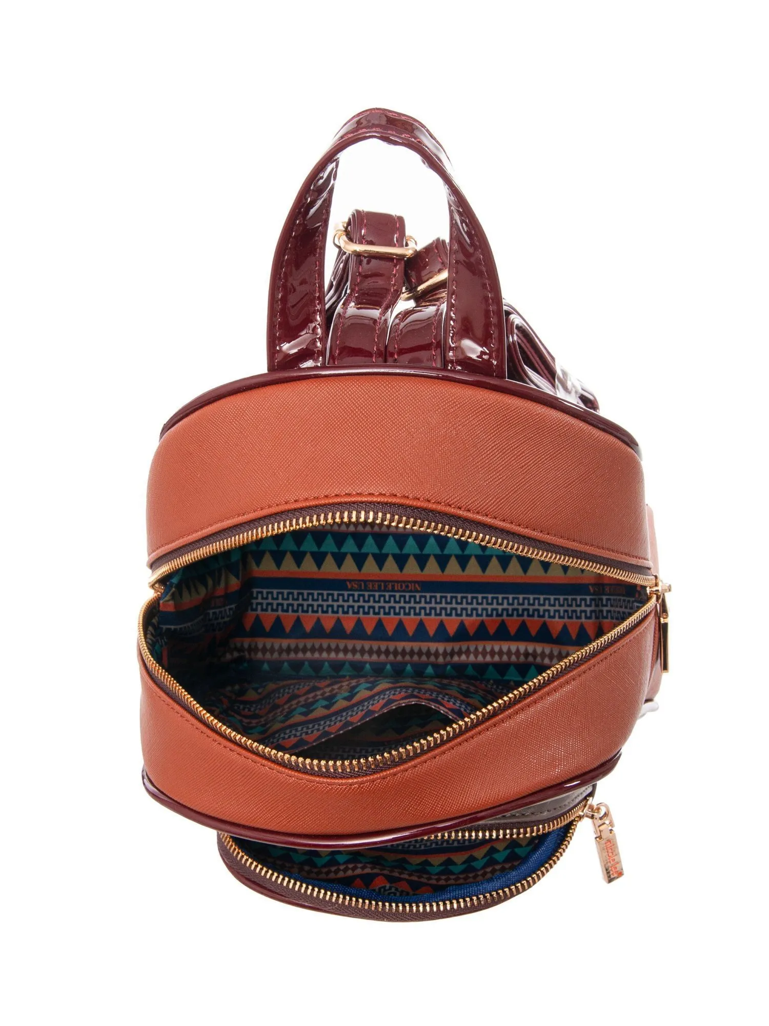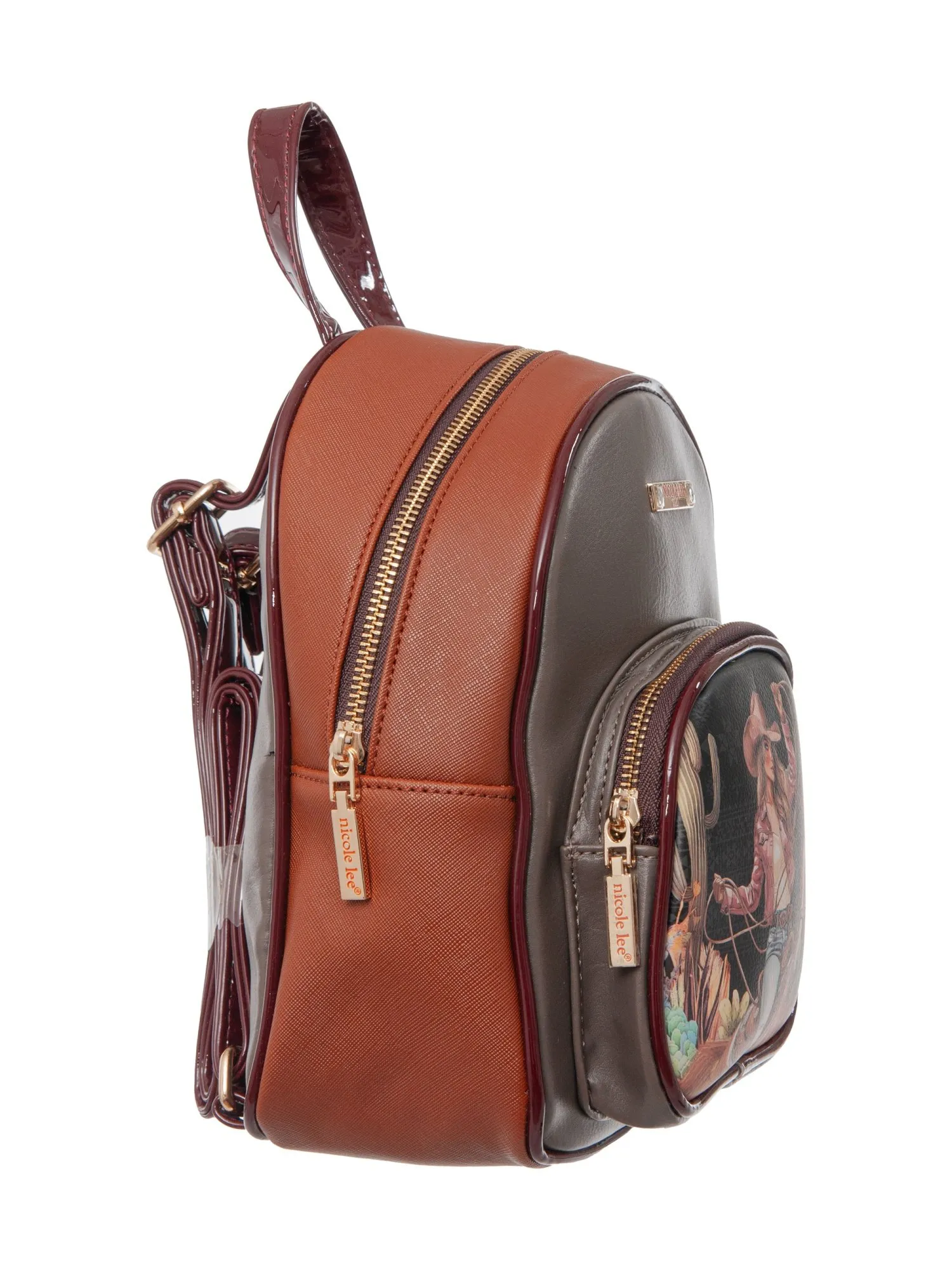 Мини рюкзак Nicole Lee, выполненный из комбинации фактурной экокожи сафьяно и гладкой экокожи, объединяет в себе элегантность и дерзкий дух Дикого Запада. Модель украшена внешним карманом на молнии с фирменным ковбойским принтом коллекции, который добавляет образу яркости и узнаваемости. Основное отделение на молнии обеспечивает безопасность ваших вещей, а внутренний открытый карман помогает поддерживать порядок.