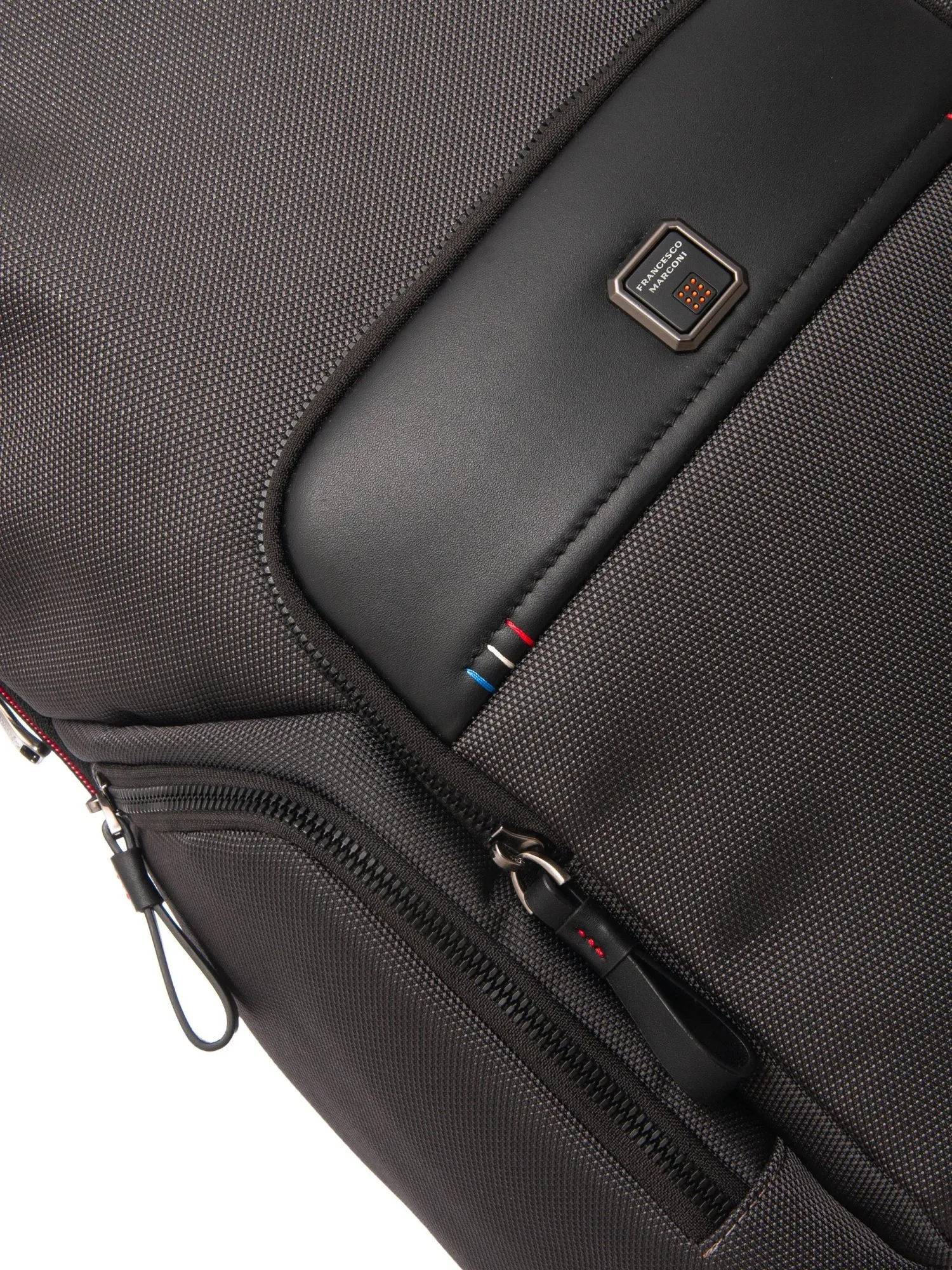 Итальянский бренд Francesco Marconi представляет большой рюкзак темно-серого цвета, сочетающий в себе премиальные материалы и продуманную функциональность. Модель выполнена из фактурного текстиля высшего качества с отделкой из натуральной кожи. Спереди расположен накладной карман на молнии с удобным открытым внутренним карманом для мелочей, а по бокам — два вместительных кармана на молнии для аксессуаров.