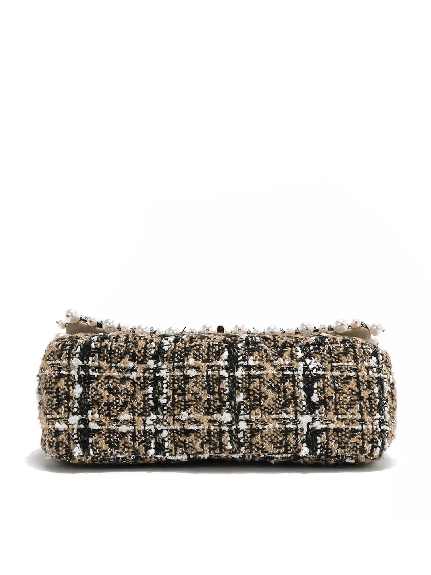 Благодаря универсальному дизайну её можно носить разными способами: на плетёных ремешках-цепочках или за ручку-клатч, отделанную жемчугом, что придаёт классическому силуэту нотку роскоши. Сумка закрывается на клапан с поворотным замком, внутри ещё один клапан на магните из экокожи в тон сумки. Внутри одно отделение и два кармана, один на молнии и один открытый. Подкладка из полиэстера с принтом в горошек.
