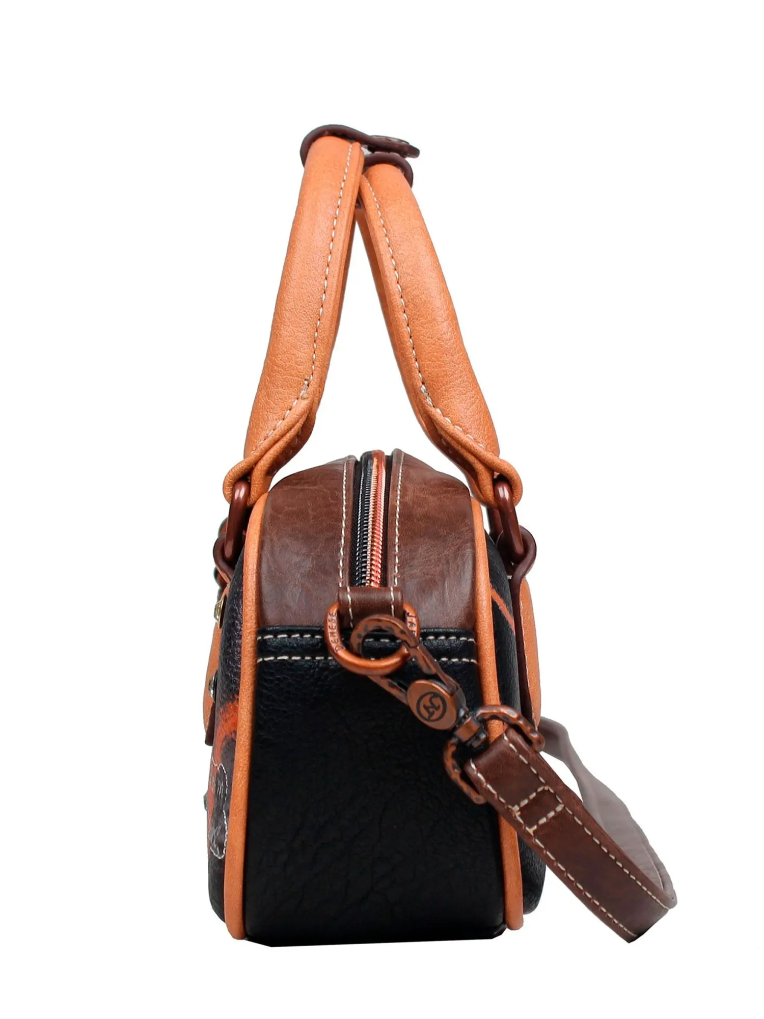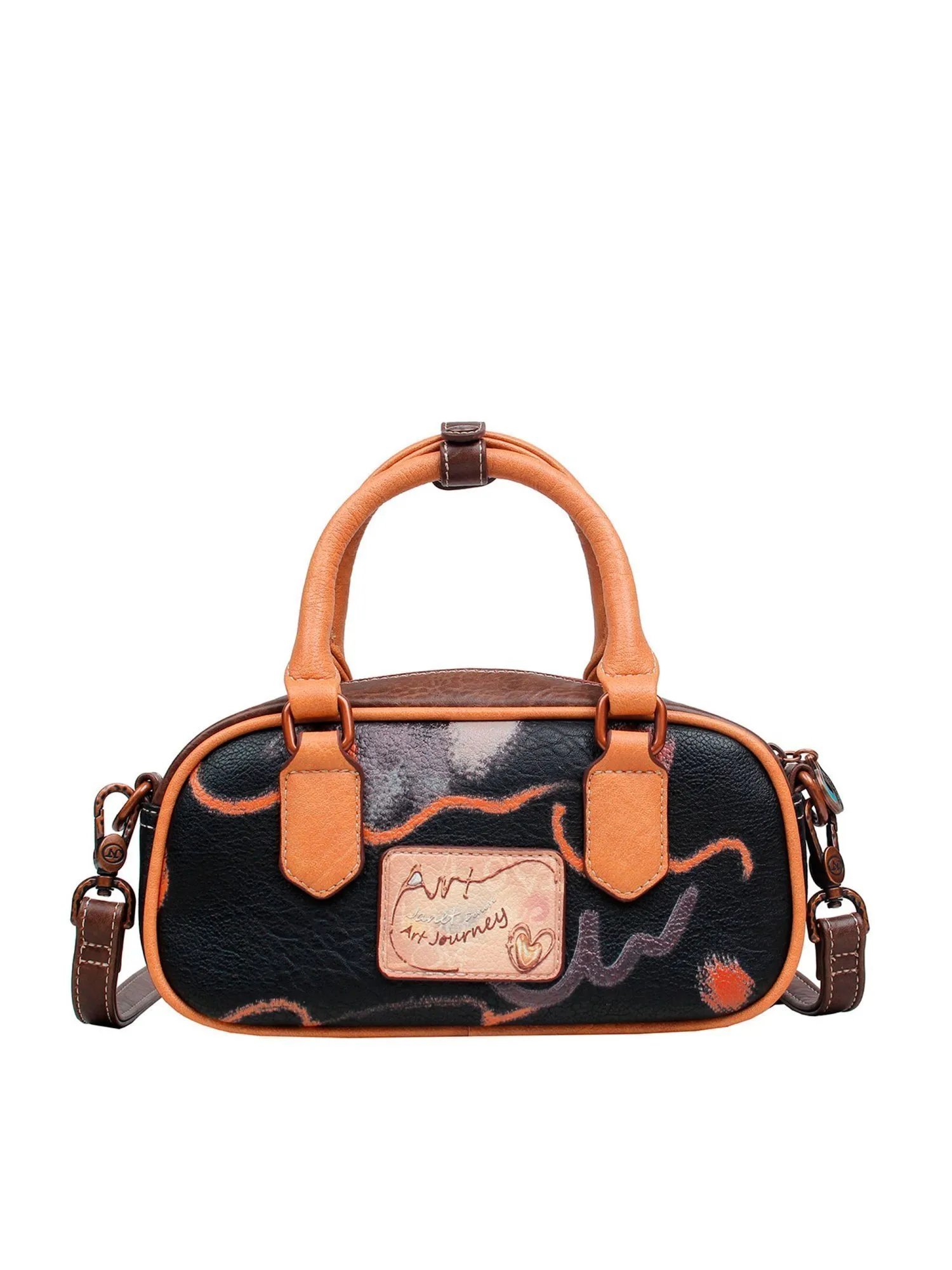 Откройте для себя уникальную мини сумку в форме бочонка, воплощающую дух творчества и утонченности! Женская сумка выполнена в благородной палитре черного, бежевого и коричневых оттенков, украшенная замысловатыми спиралями, словно нанесенными кистью художника, и декорированная изысканными клепками со стразами. Фирменный брелок в виде палитры добавляет завершающий штрих, подчеркивая принадлежность к коллекции ART GALLERY.