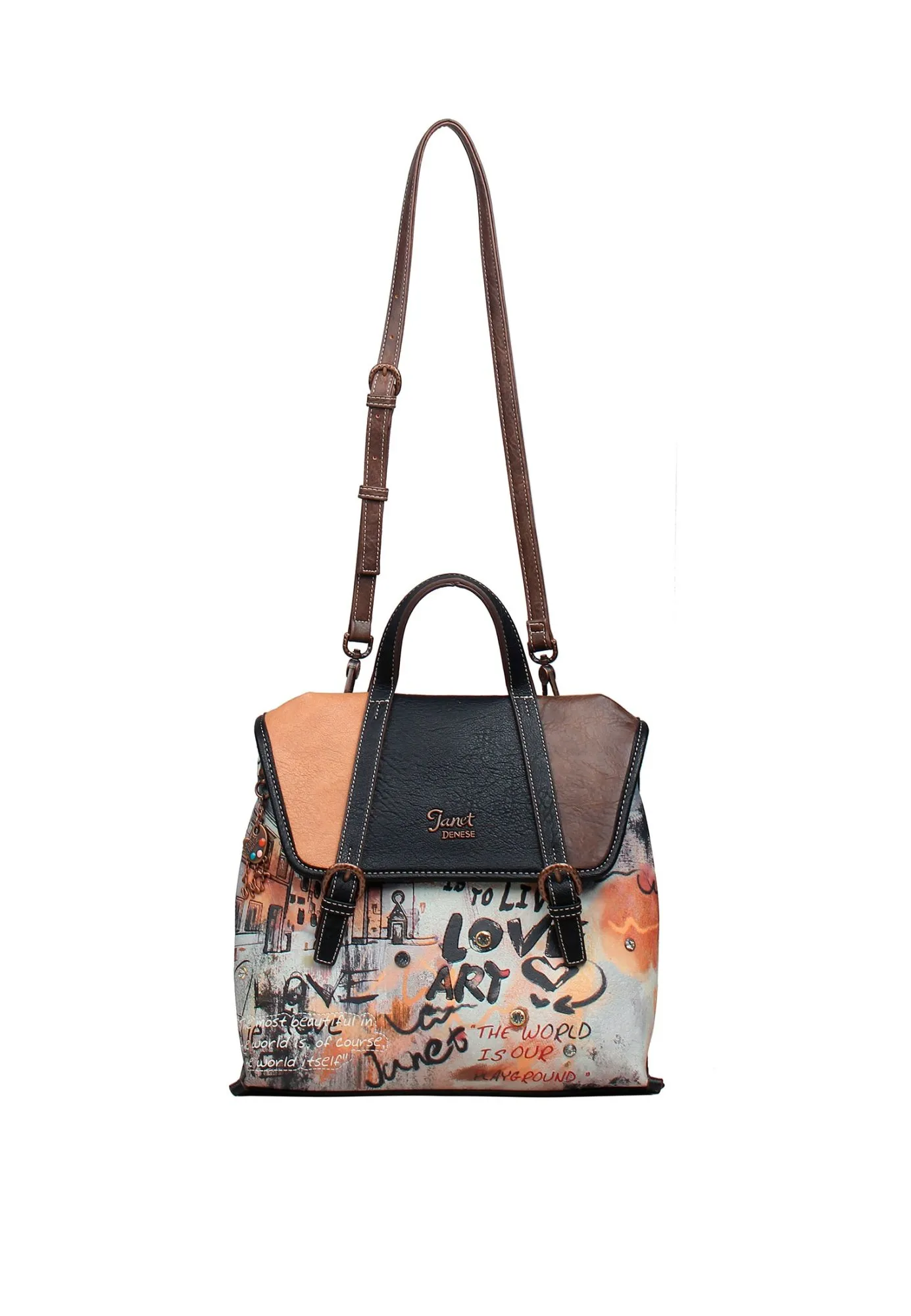 На задней стороне расположен большой карман на молнии для быстрого доступа к телефону, ключам или документам. Универсальные ремешки-лямки регулируются по длине и могут быть перестегнуты, позволяя носить рюкзак как классический рюкзак или как стильную сумку через плечо. Идеальный выбор для повседневного использования, прогулок по городу или путешествий — этот рюкзак сочетает в себе практичность, удобство и неповторимый дизайн. Носите с собой JANET, чтобы превращать улицы в галерею стиля, где вы — главный экспонат.
