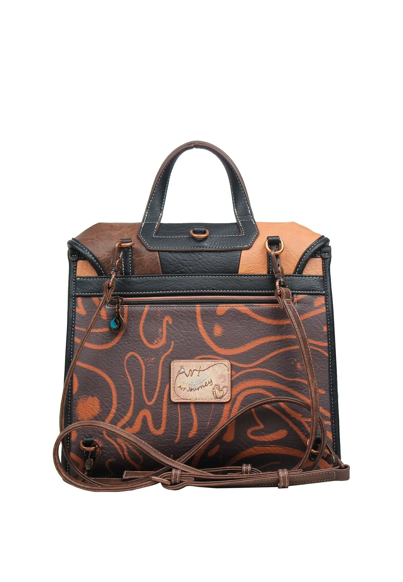 Элегантный рюкзак среднего размера, воплощающий дух творчества и утонченности. Модель выполнена в благородной палитре коричневого, бежевого и черного оттенков, украшенная замысловатыми спиралями, словно нанесенными кистью талантливого художника. Этот рюкзак — не просто аксессуар, а настоящий арт-объект, который подчеркнет вашу индивидуальность и чувство стиля.