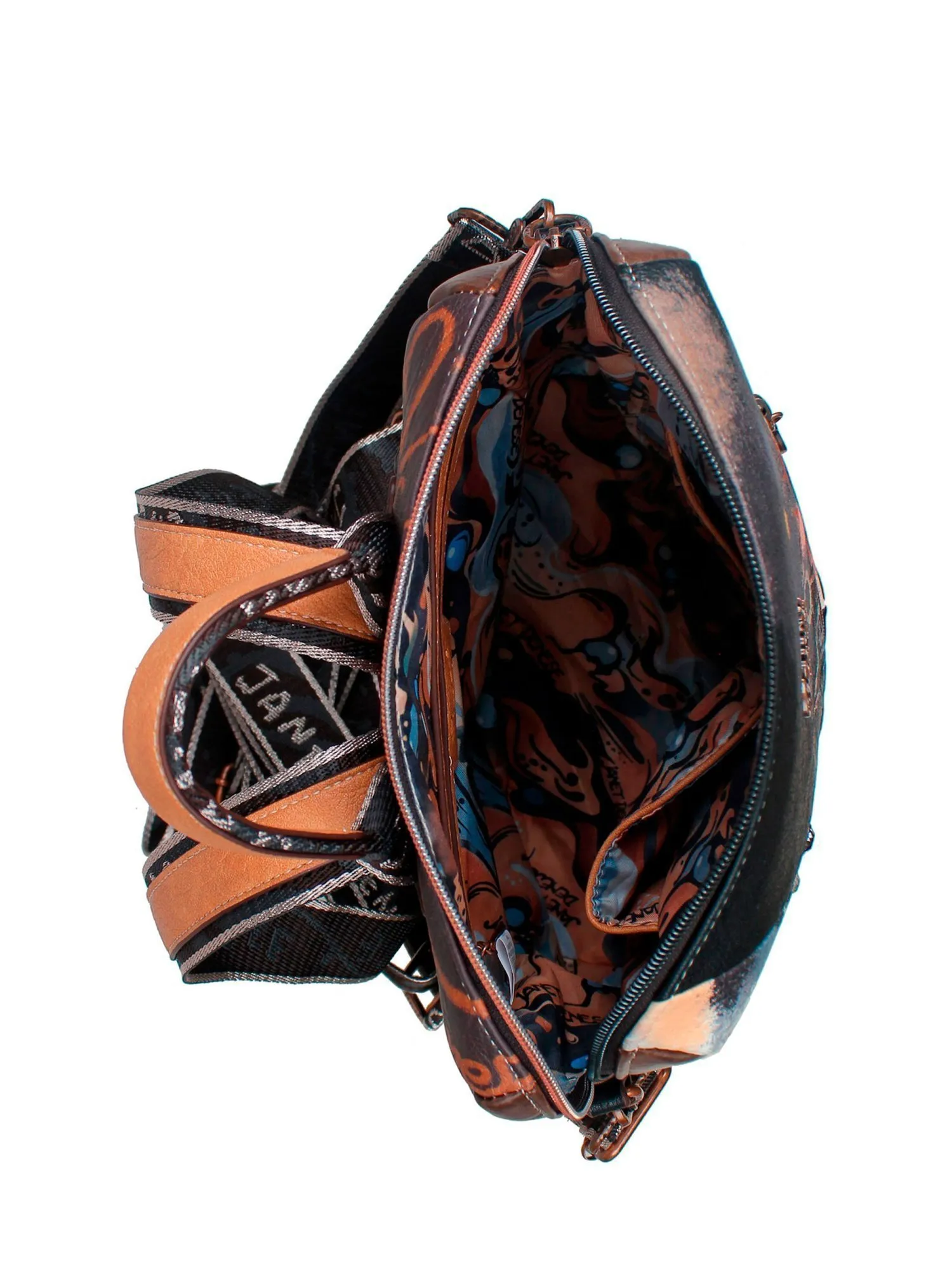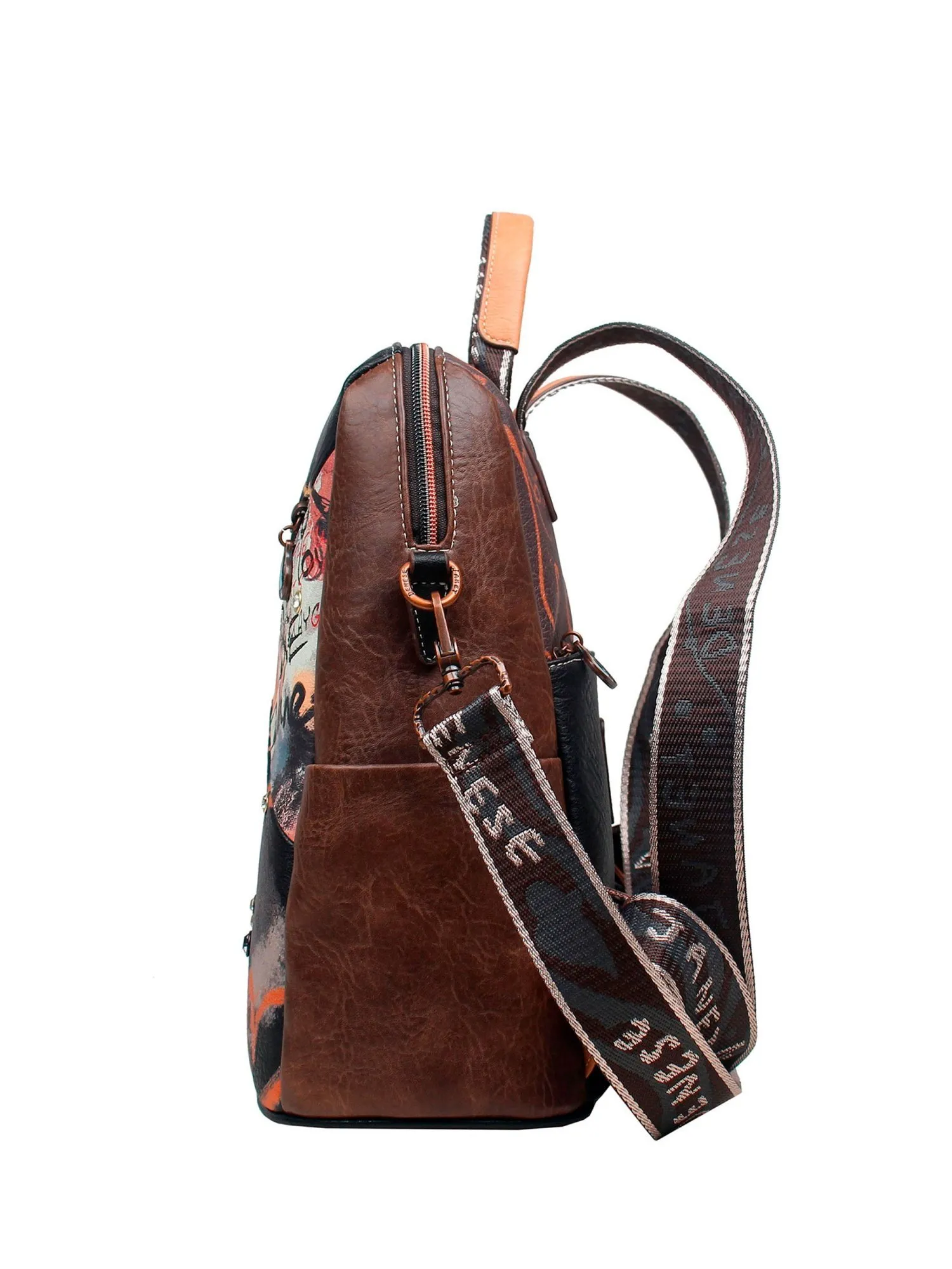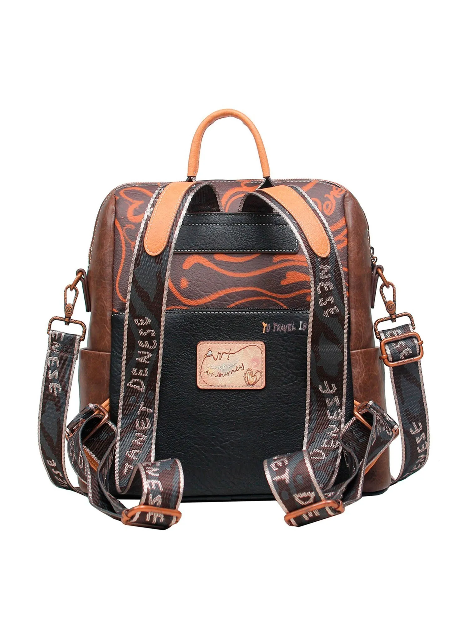 Элегантный рюкзак среднего размера, воплощающий дух творчества и утонченности. Модель выполнена в благородной палитре коричневого, бежевого и черного оттенков, украшенная замысловатыми спиралями, словно нанесенными кистью талантливого художника. Этот рюкзак — не просто аксессуар, а настоящий арт-объект, который подчеркнет вашу индивидуальность и чувство стиля.
