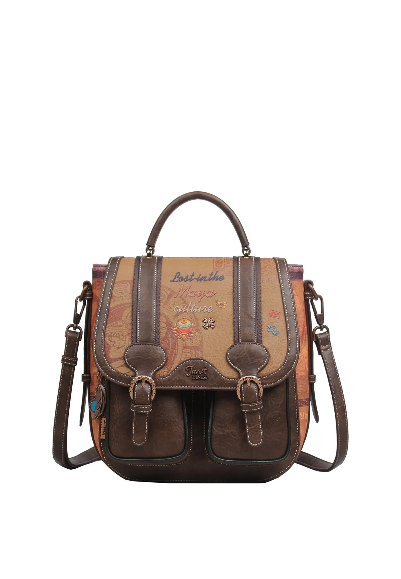 Сумка кросс-боди, вдохновленная загадочной культурой майя, сочетает в себе модный дизайн и функциональность. Она легко превращается из стильной сумки через плечо в удобный рюкзак — благодаря продуманной системе ремешков-лямок с регулировкой длины. Украшенная стильным кулоном в виде перышка, символизирующим связь с древними традициями.