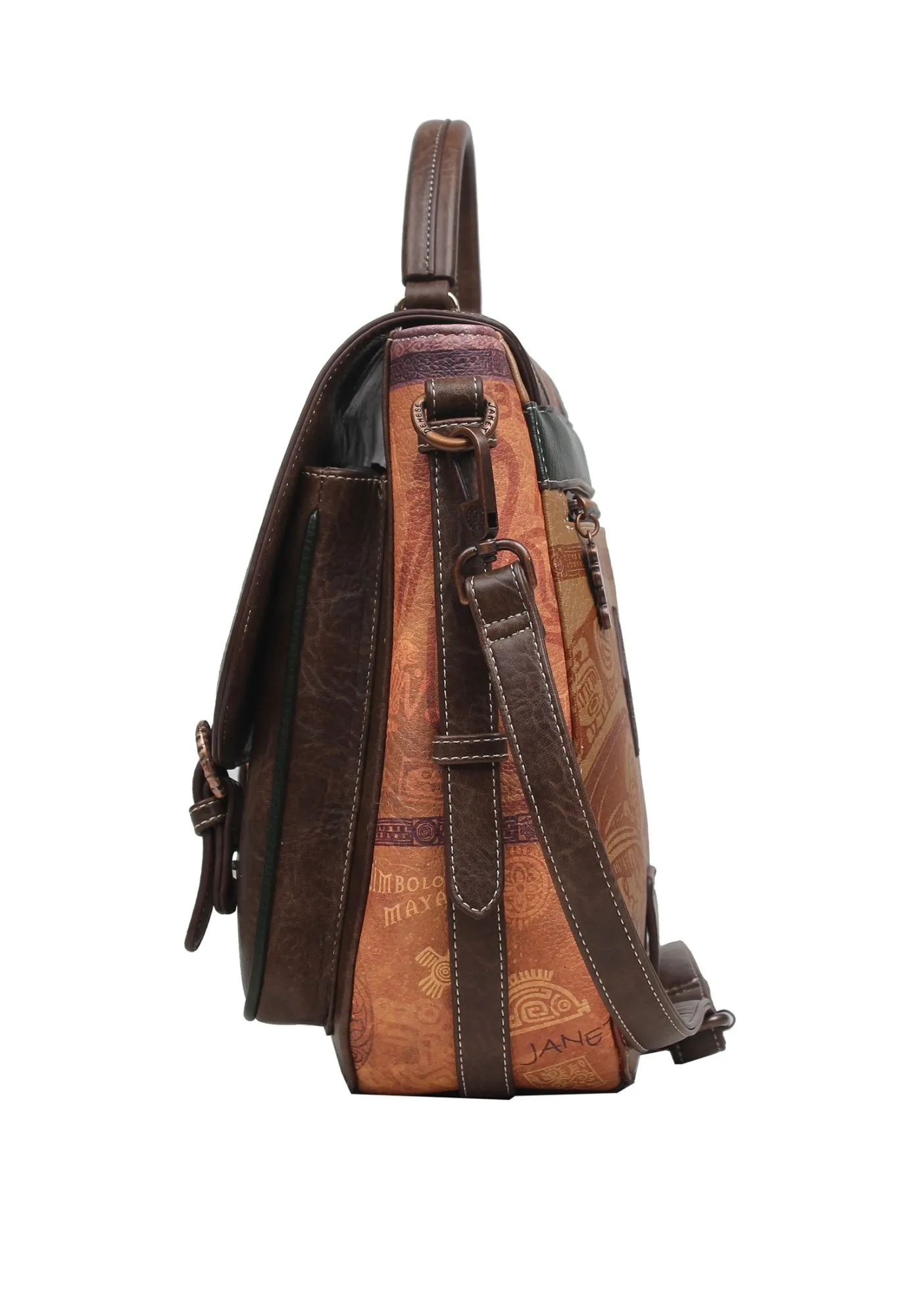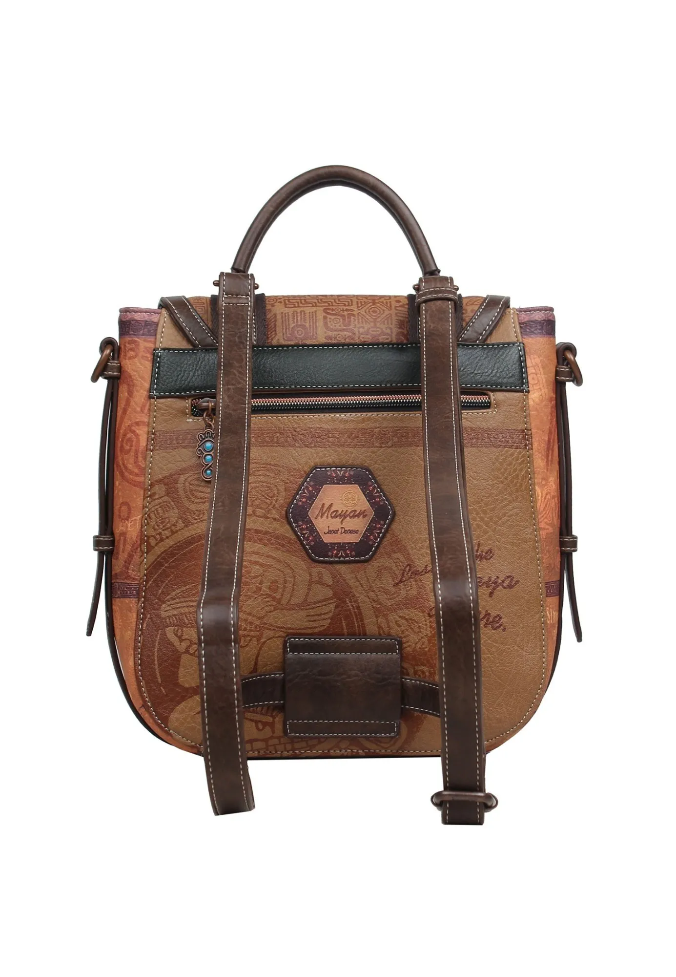 Под клапаном с декоративным замком-магнитом скрываются два вместительных кармана для быстрого доступа. Основное отделение на молнии радует организацией: карман на молнии для ценных мелочей и два открытых кармана для аксессуаров. На клапане красуется эмблема птицы квезал — символа свободы и красоты, вышивка, а на оборотной стороне размещена эмблема коллекции. Для тех, кто ценит историю, практичность и смелые акценты, эта сумка-рюкзак станет спутником в городских приключениях и путешествиях. Носите с собой JANET, чтобы завоевывать мир и наполнять повседневность красотой древних традиций.