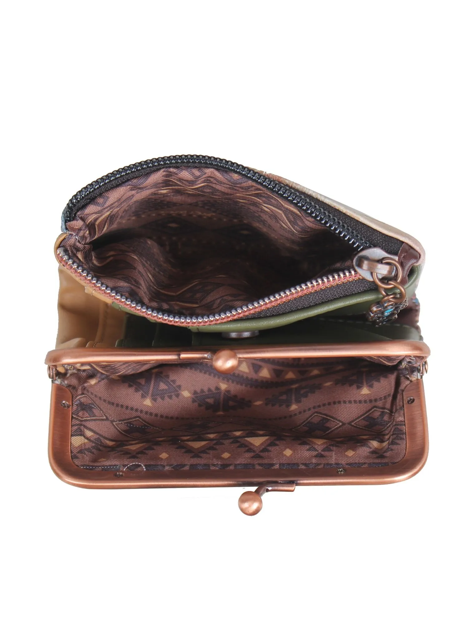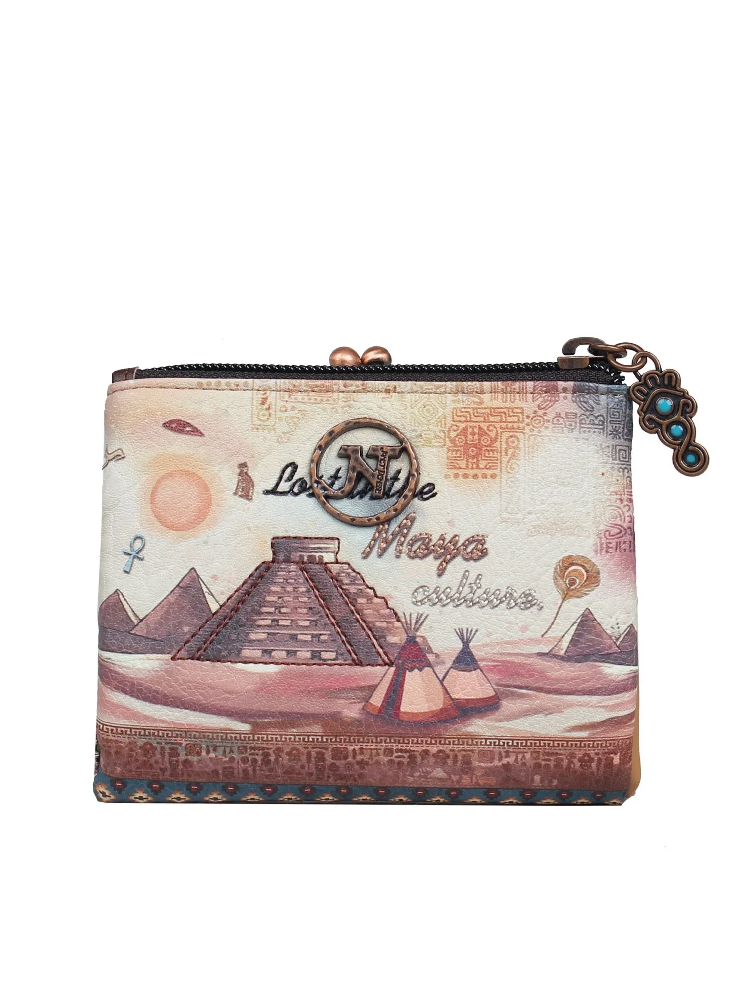 Идеальный спутник для маленьких сумочек и клатчей, этот кошелёк легко организует ваши мелочи, сохраняя элегантность и стиль. Украшенный символами майя и выполненный в духе коллекции, он станет не просто аксессуаром, а настоящим талисманом. Поставляется в фирменной коробке, что делает его прекрасным подарком для близких или стильным дополнением к вашему образу.