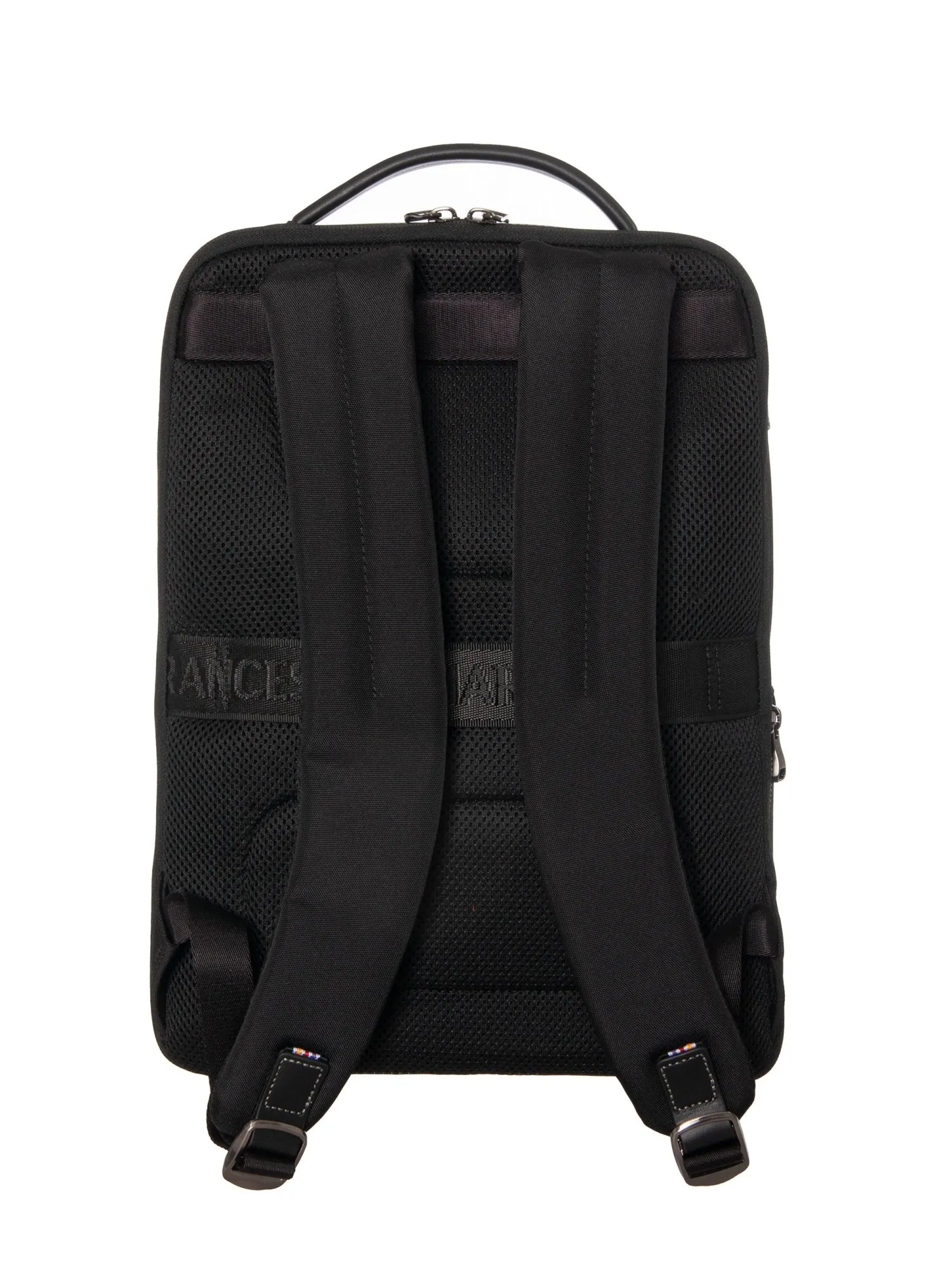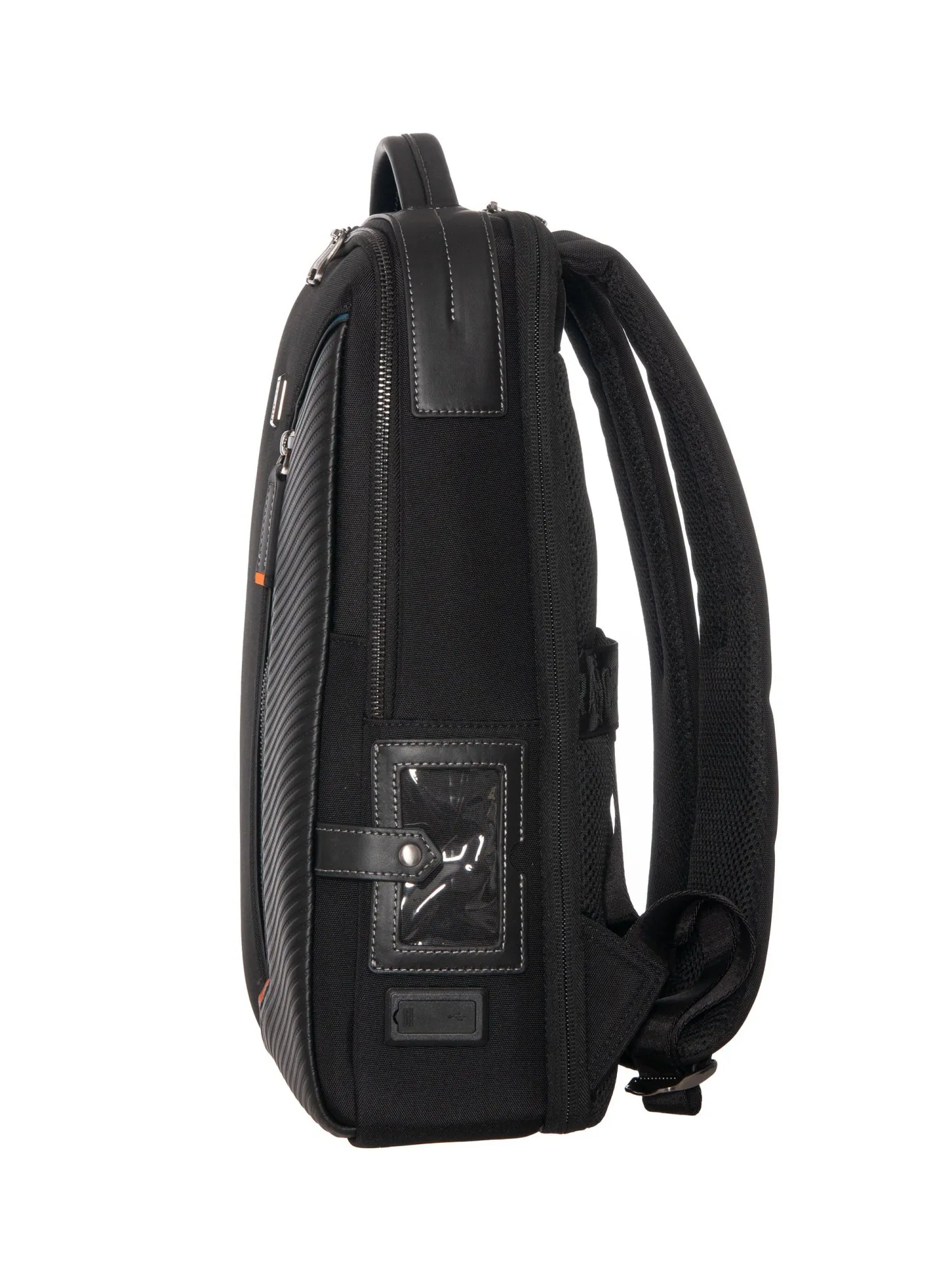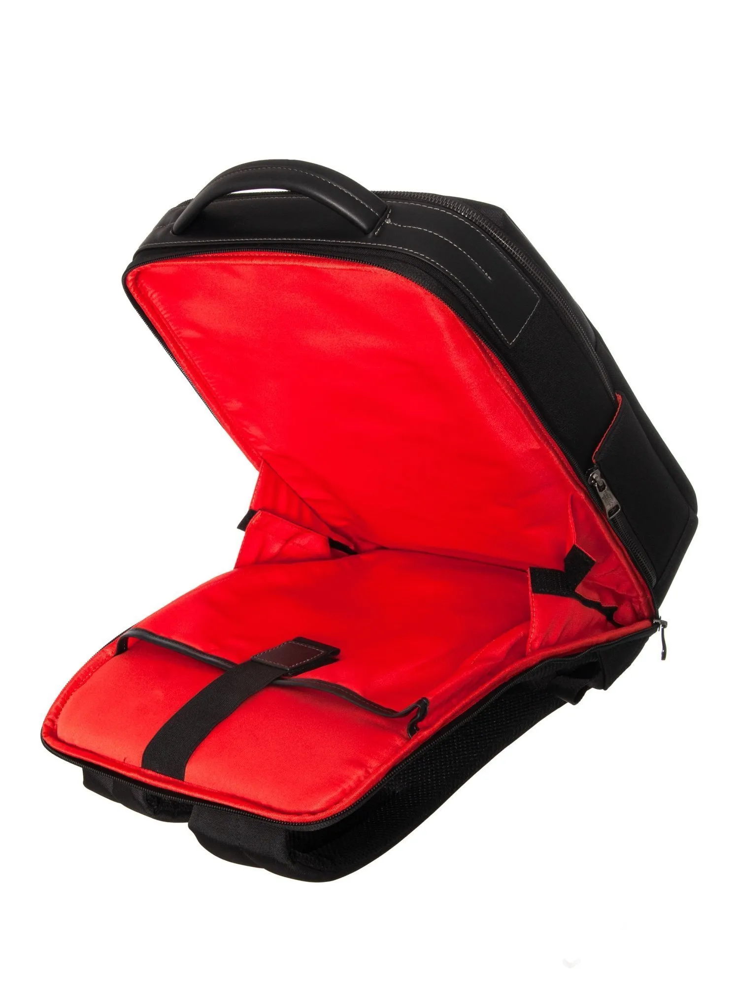Рюкзак имеет два независимых отделения. Первое закрывается на молнию с двумя бегунками и вмещает документы формата А4, а внутри есть карман на молнии и открытый карман. Второе отделение, при необходимости, раскрывается полностью благодаря нижним липучкам и оборудовано мягким защитным отсеком для ноутбука диагональю до 15 дюймов. На задней панели расположены эргономичные широкие лямки и вентилируемая спинка для комфорта, а также багажная лента для фиксации на чемодане. Под лентой скрыт потайной карман на молнии для документов и ценных вещей. Сбоку находится карман с молнией и эластичной вставкой для бутылки или зонта. Рюкзак сохраняет форму, подчеркивая статус и практичность для деловых поездок, работы и путешествий.