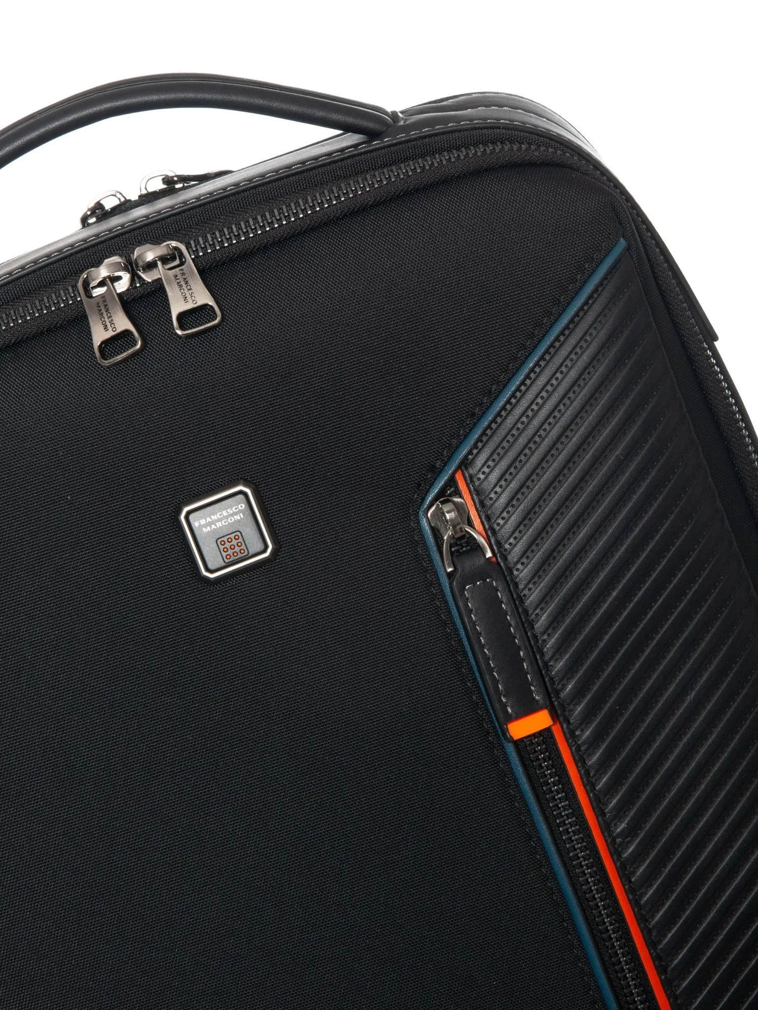 Francesco Marconi представляет мужской рюкзак в деловом стиле, сочетающий в себе премиальные материалы и продуманную эргономику. Модель среднего размера изготовлена из высококачественного текстиля и натуральной кожи, украшена лаконичным логотипом и стильной оранжевой отделкой вокруг молний. Спереди расположен вместительный карман для быстрого доступа к телефону и мелочам, а сбоку — прозрачное окошко для пропуска и внешний выход под USB-порт для удобного подключения зарядки.