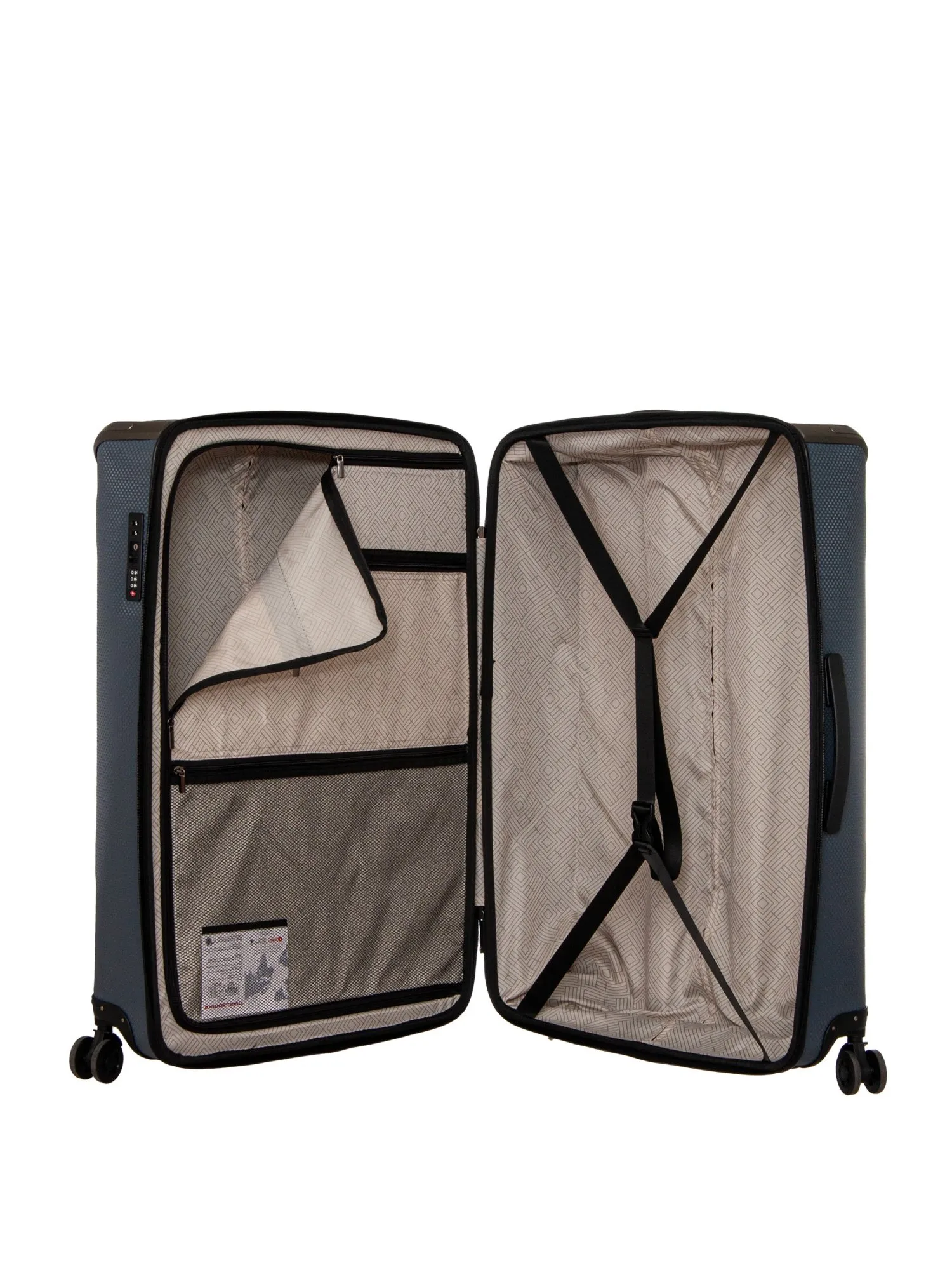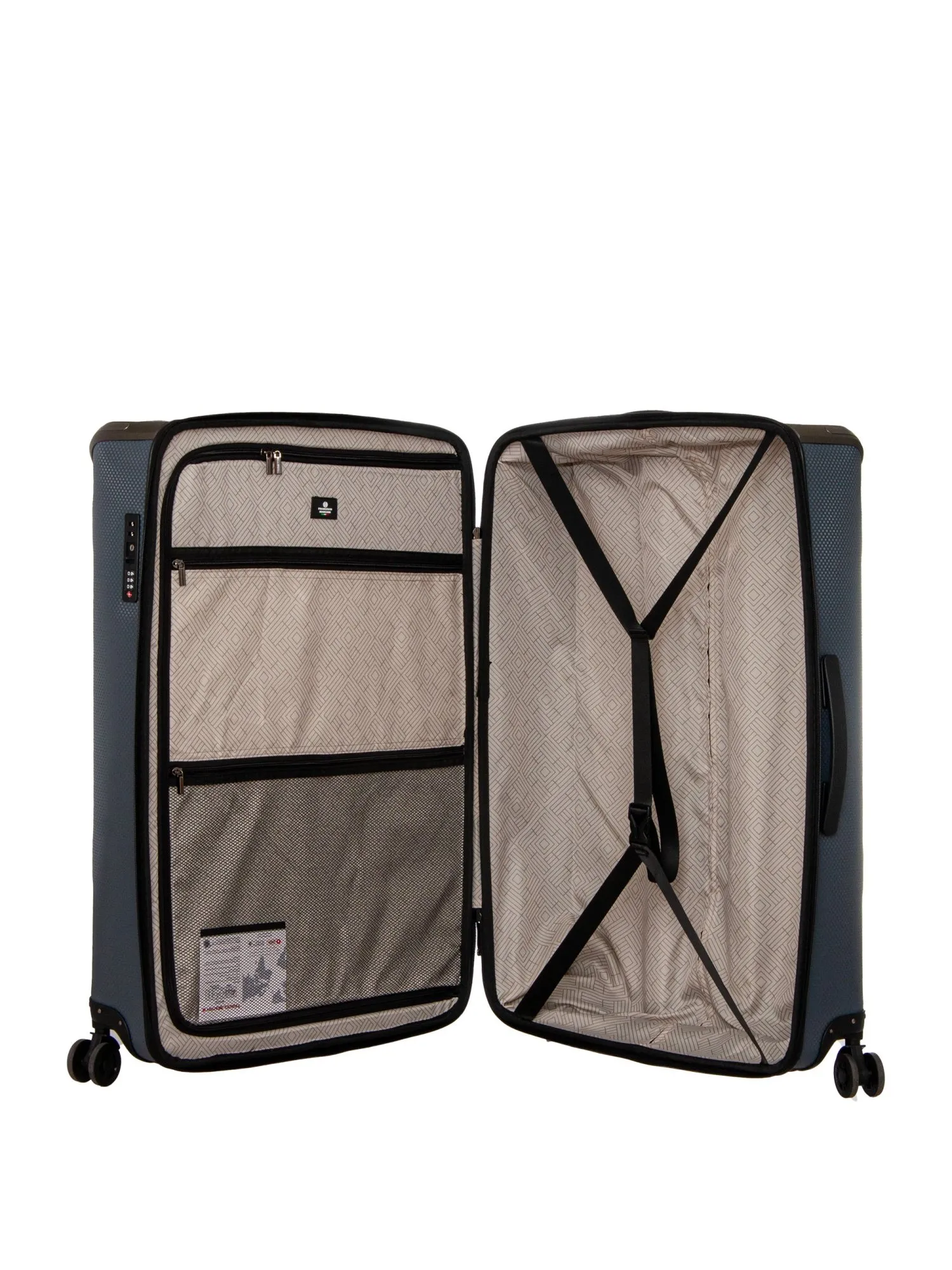 Внутри чемодана два отделения, одно из которых дополнено ремнями для фиксации вещей, а второе закрывается круговой молнией и включает два кармана — сетчатый и закрытый на молнии. Идеальный спутник для семейных поездок, шопинга и длительных путешествий — этот чемодан сочетает в себе вместительность, прочность и безупречный итальянский дизайн.