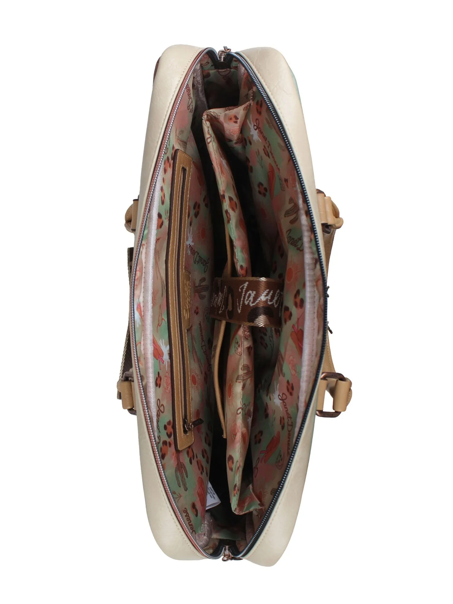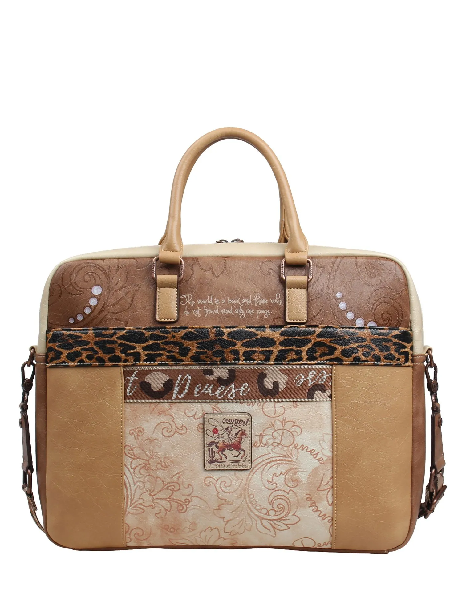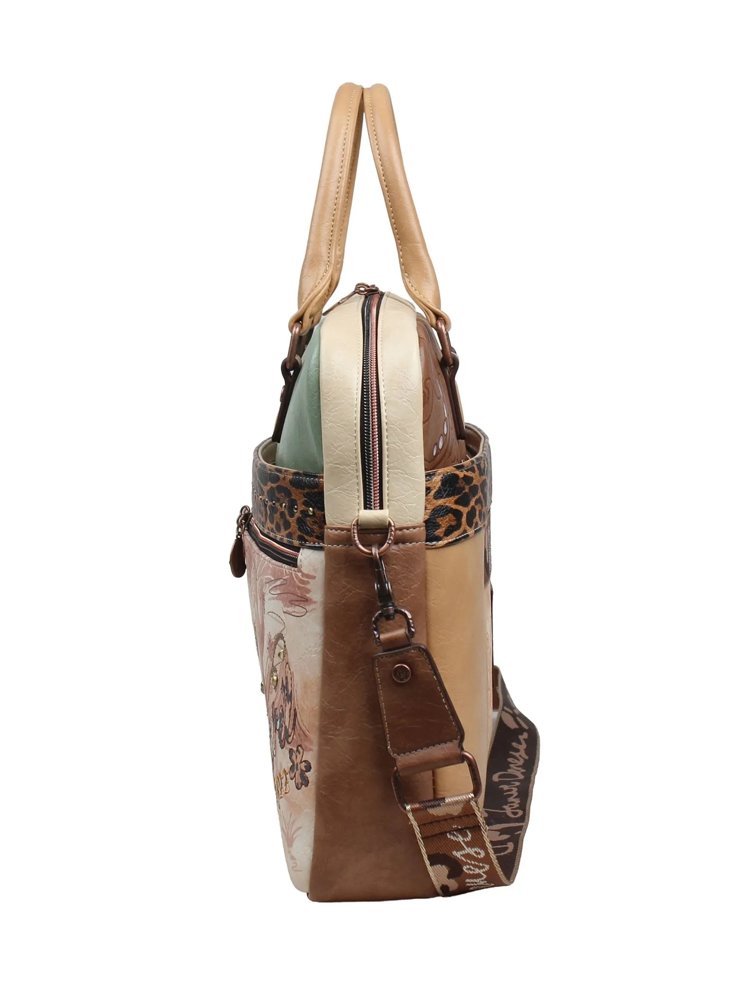 Спереди сумку обрамляют два больших кармана на молнии с красивым принтом коллекции, а чуть выше расположен большой скрытый карман на молнии для документов. На задней стороне вас ждет практичная багажная лента, позволяющая закрепить сумку на ручке чемодана во время путешествий или командировок, а также большой скрытый карман на молнии.